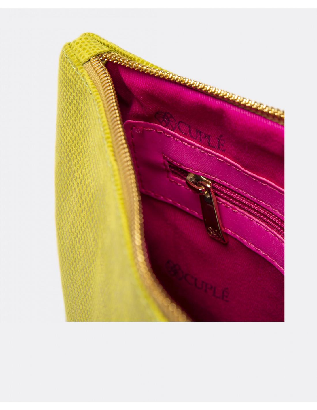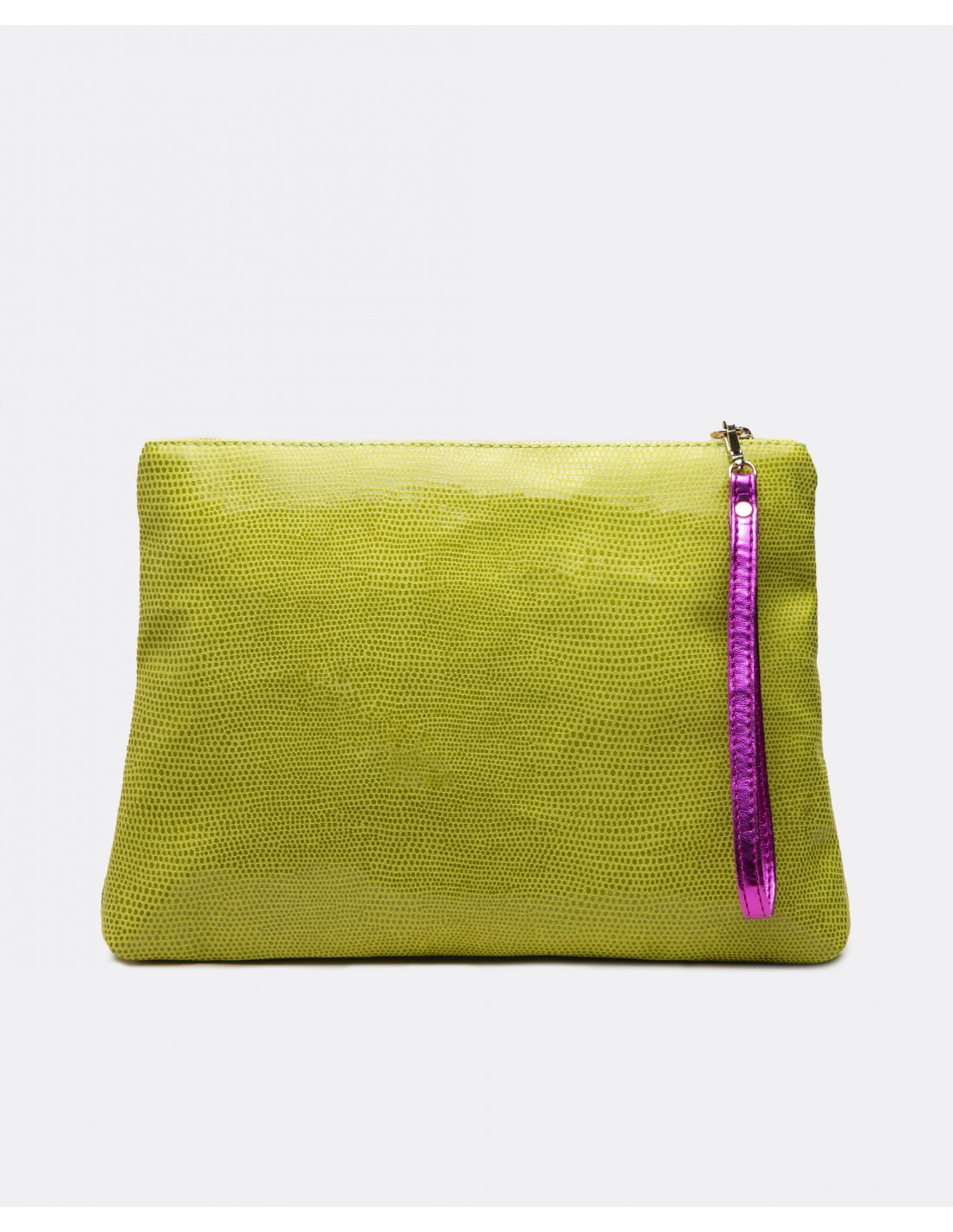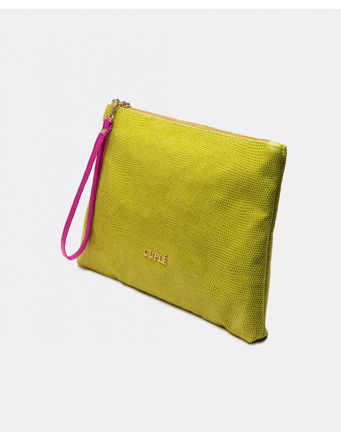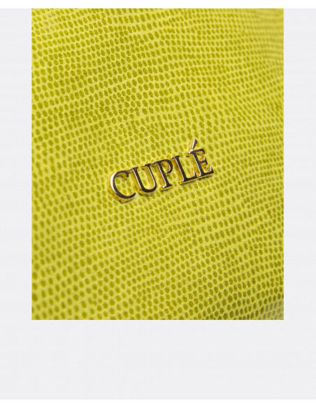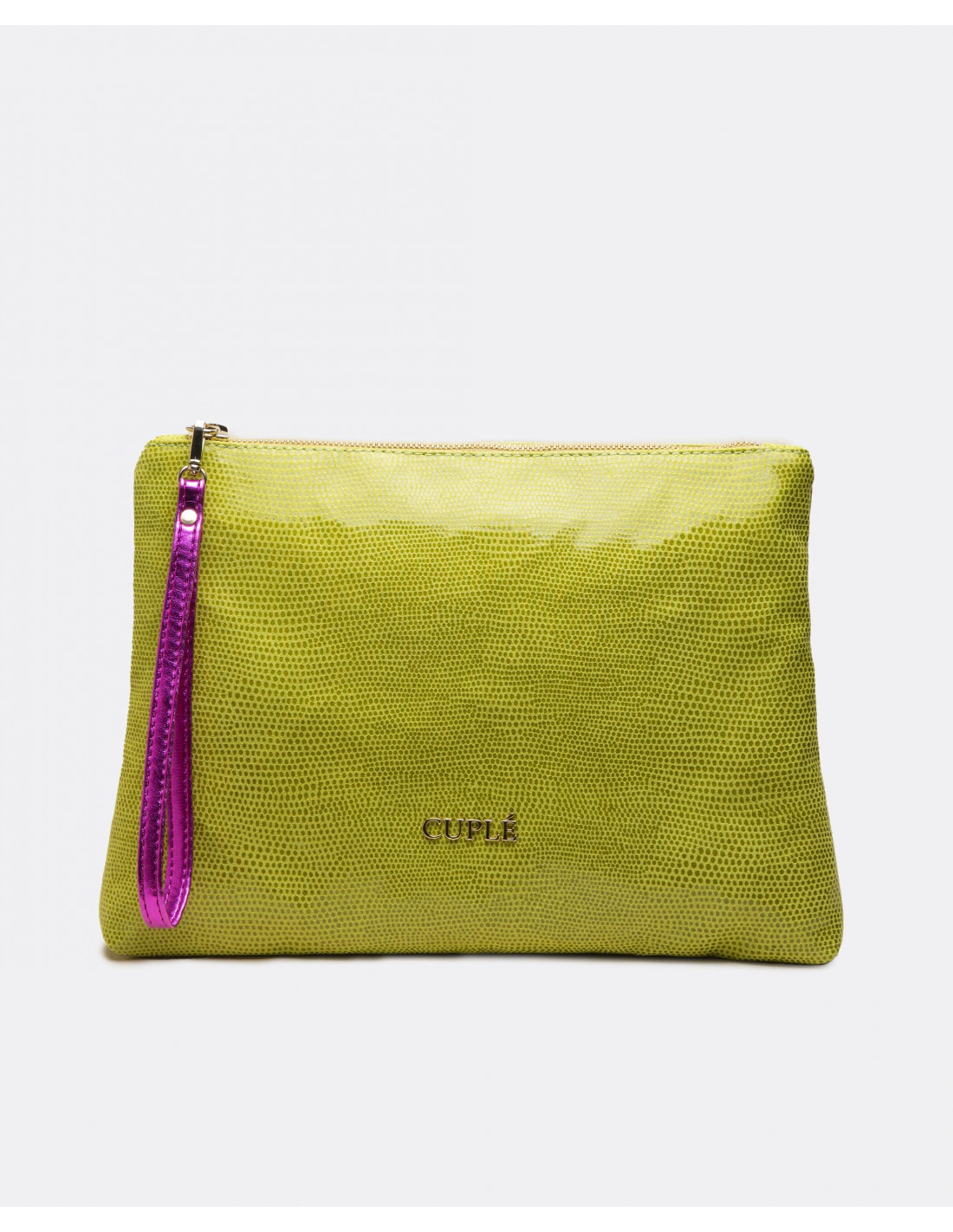Cartera de mano mediana confeccionada en España con tejido sintético laminado. Presenta el nombre de la marca en metálico y asa de piel en tonalidades doradas.