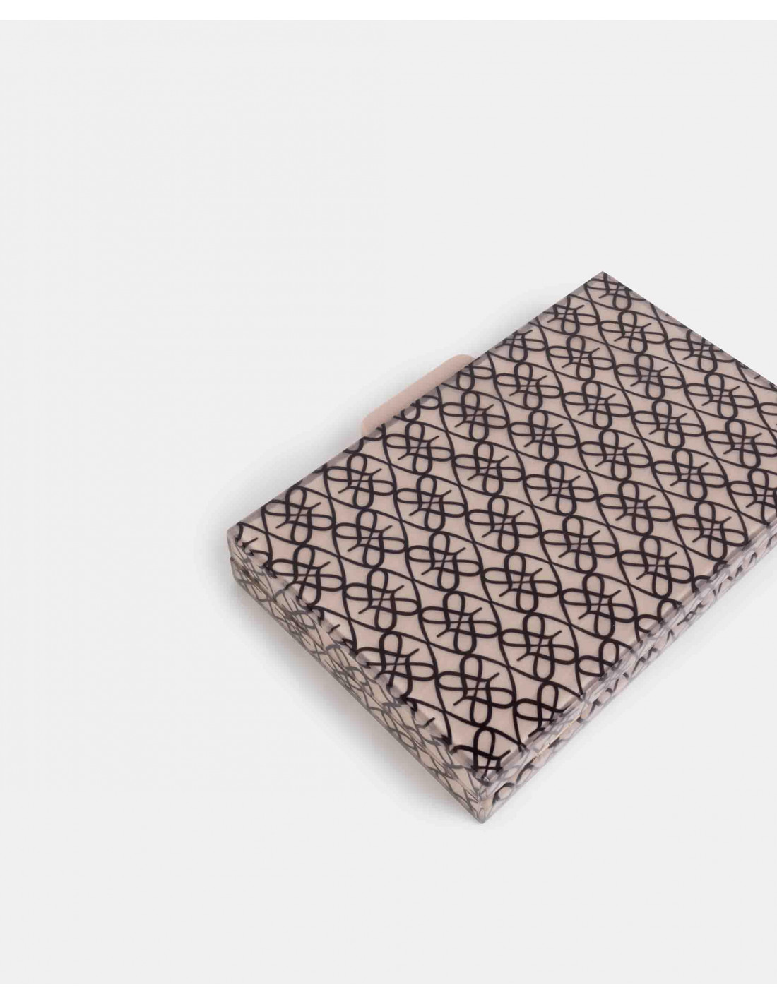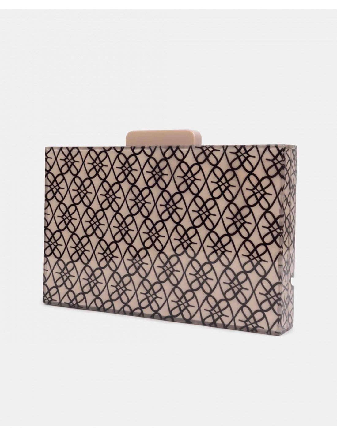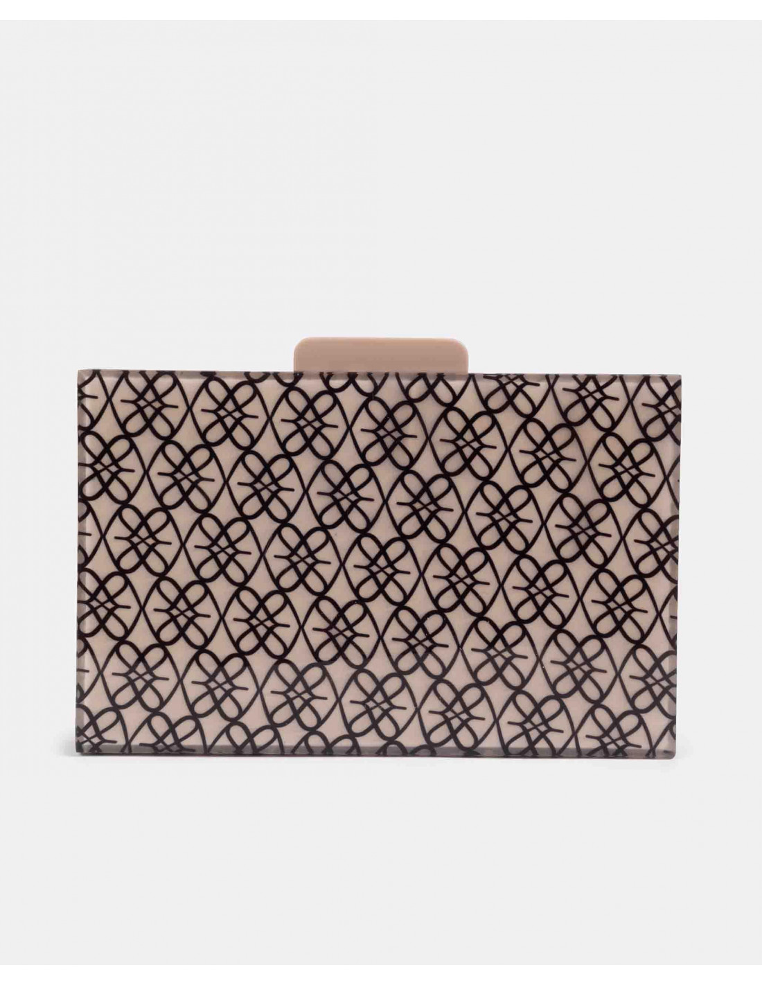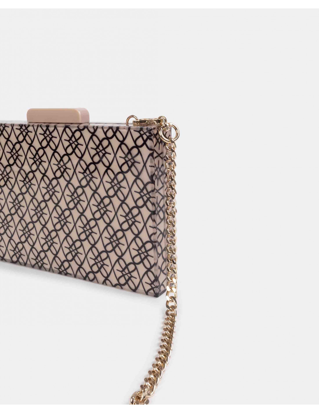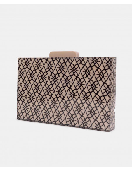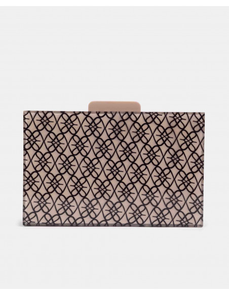 Cartera pequeña confeccionada en España con metacrilato de alta calidad, con estampado del logotipo de la marca. Presenta cadena larga metálica. Perfecto para tus looks de fiesta.