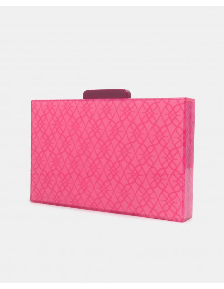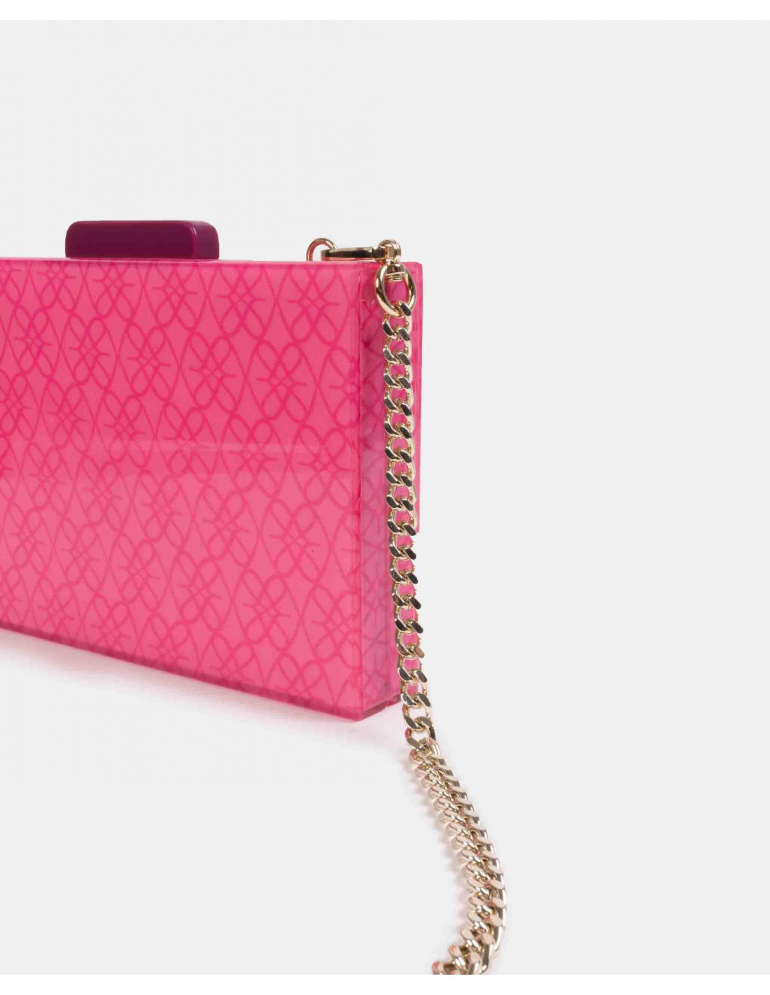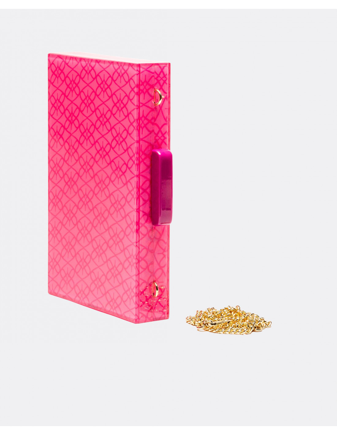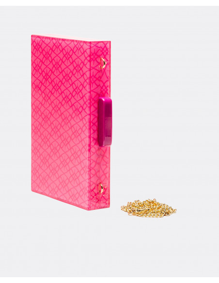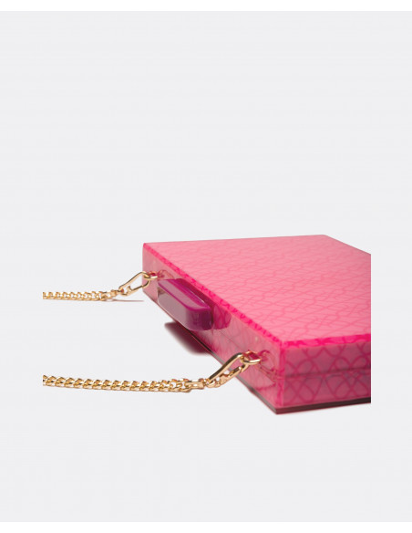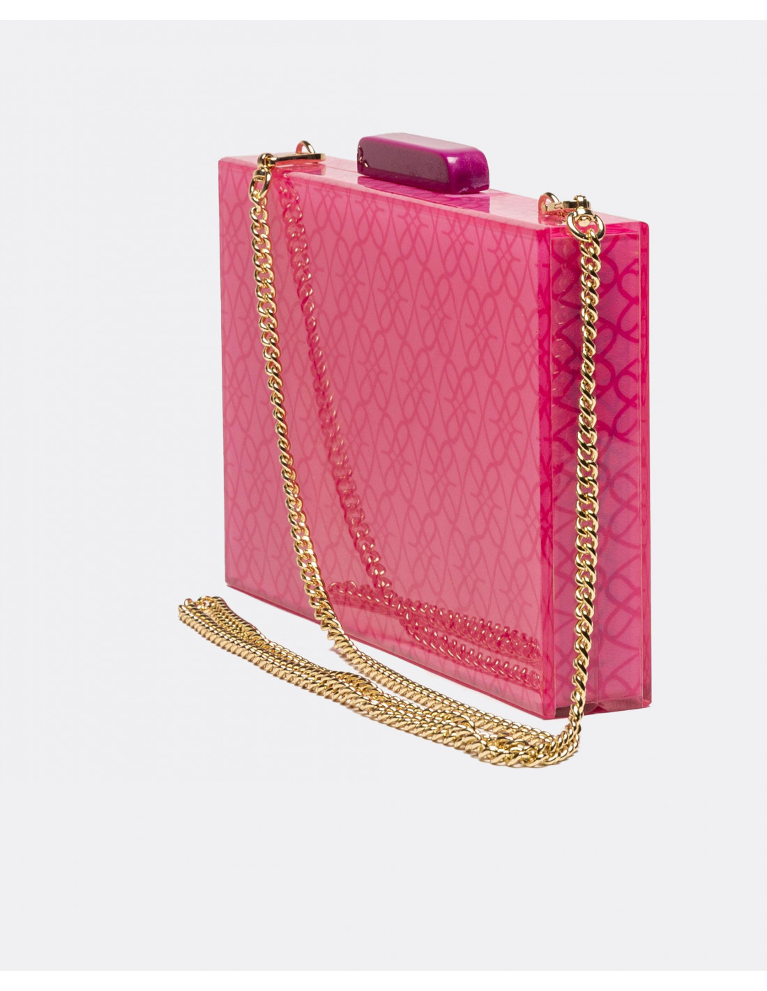 Cartera pequeña confeccionada en España con metacrilato de alta calidad, con estampado del logotipo de la marca. Presenta cadena larga metálica.