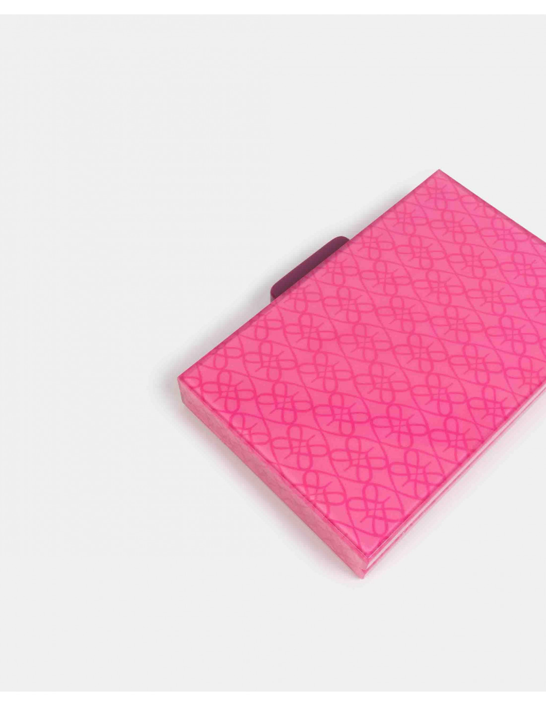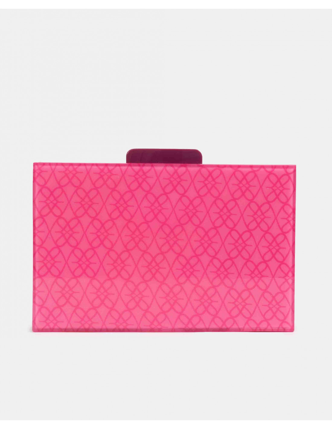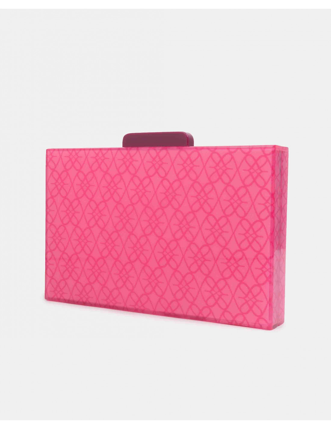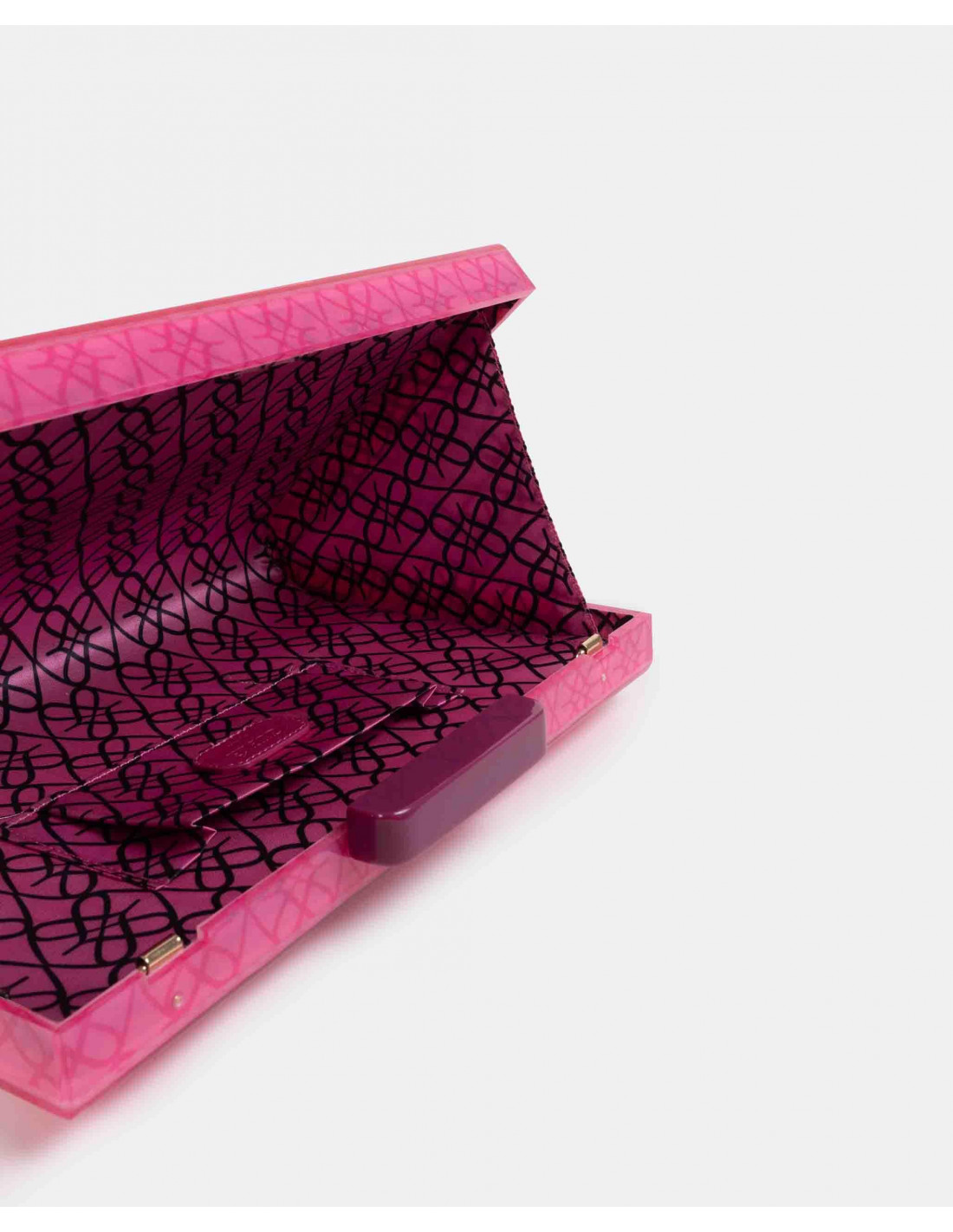 Cartera pequeña confeccionada en España con metacrilato de alta calidad, con estampado del logotipo de la marca. Presenta cadena larga metálica.