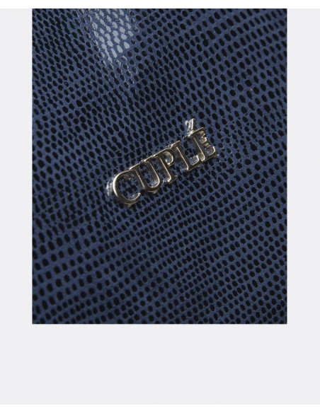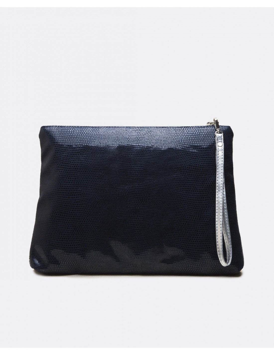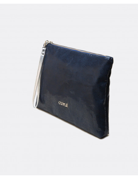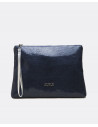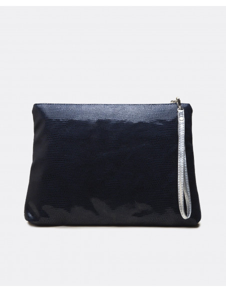 Cartera de mano mediana confeccionada en España con tejido sintético laminado. Presenta el nombre de la marca en metálico y asa de piel en tonalidades plateadas.