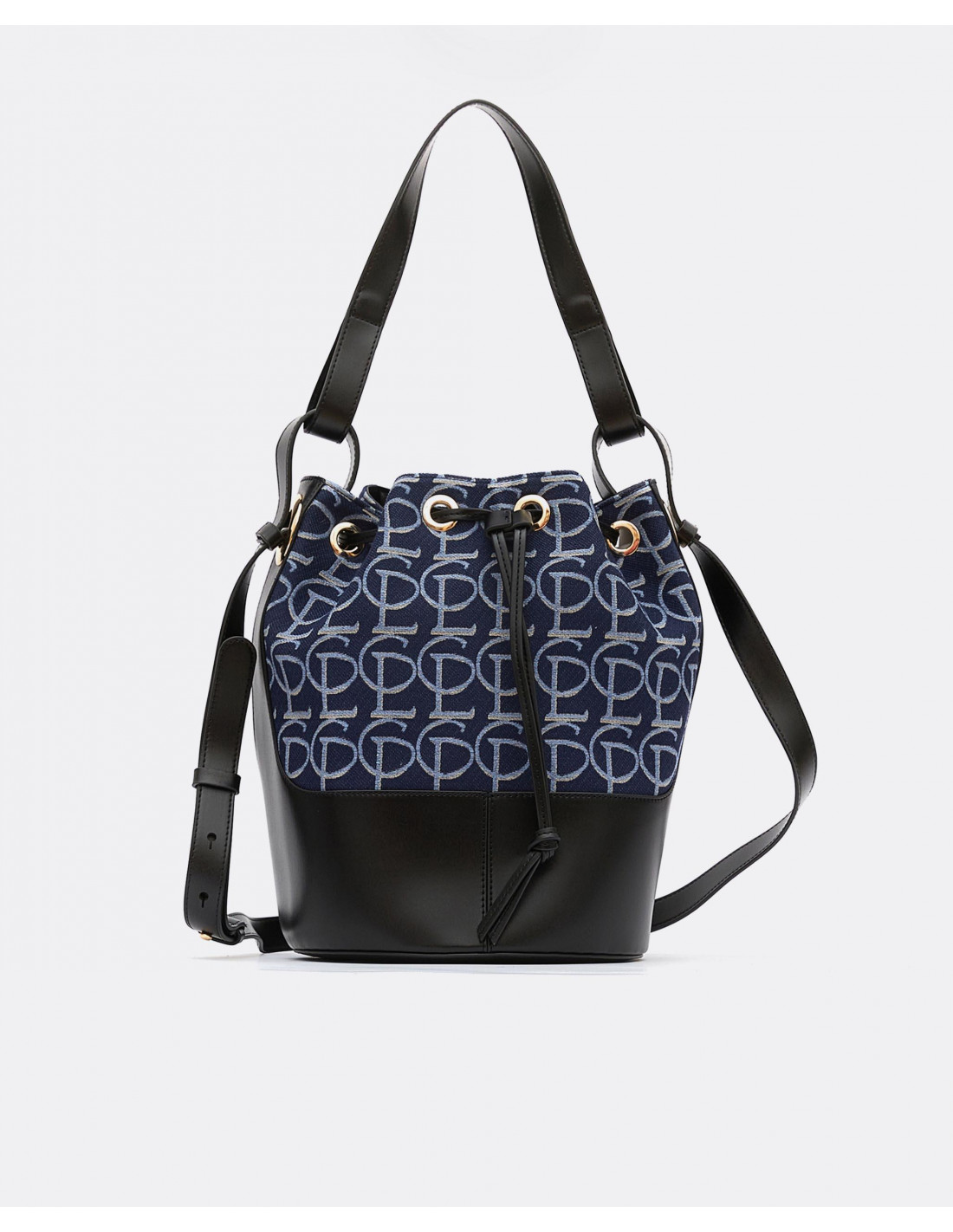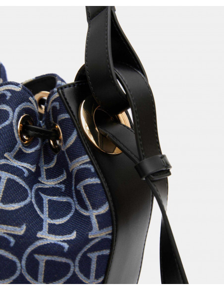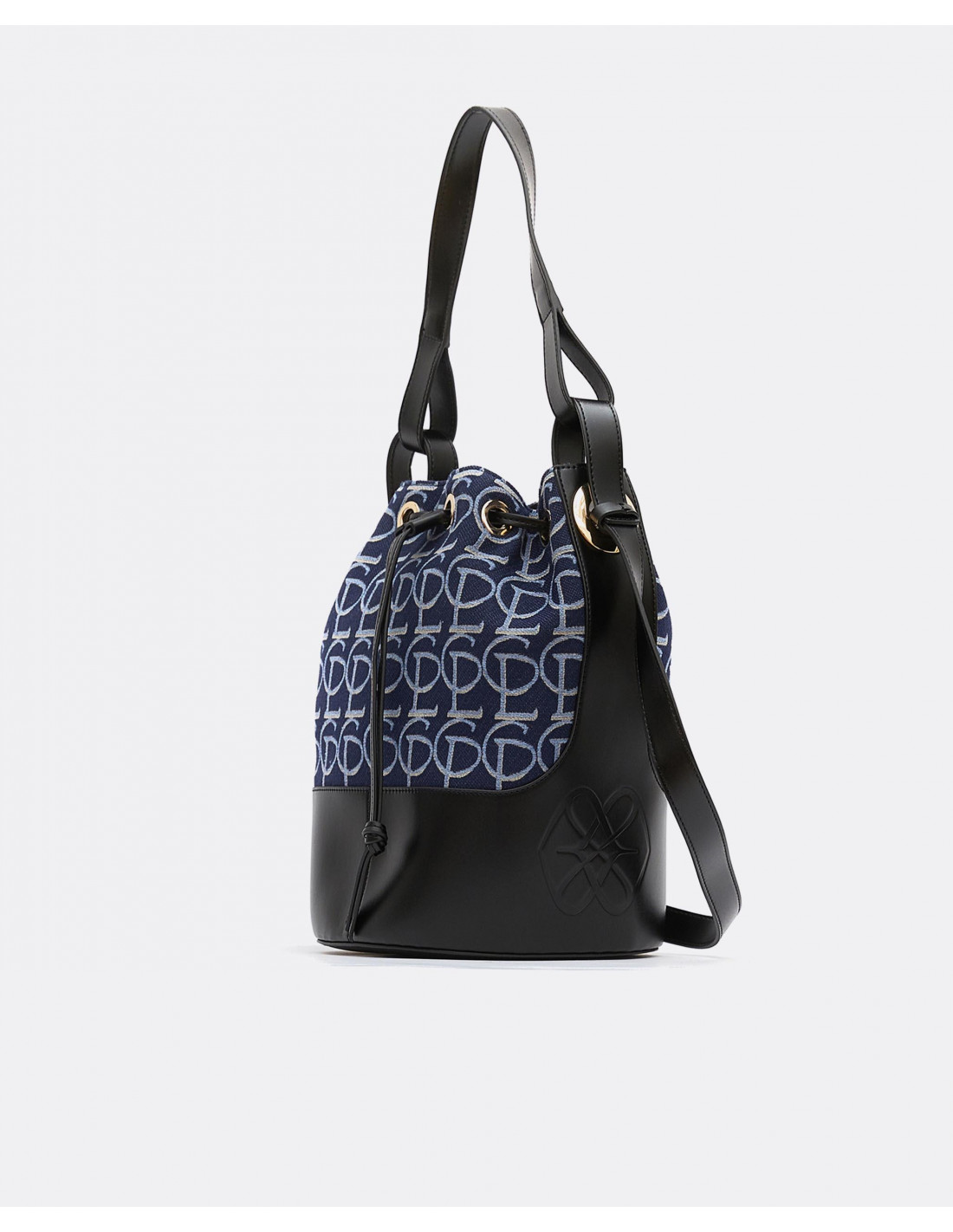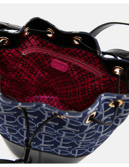 Bolso estilo bombonera elaborado en tecnopiel en color negro y jacquard CPL en tonos azules. Cierre mediante cordón. Detalle lateral de logotipo. Correa larga estilo bandolera para poder colgarlo.