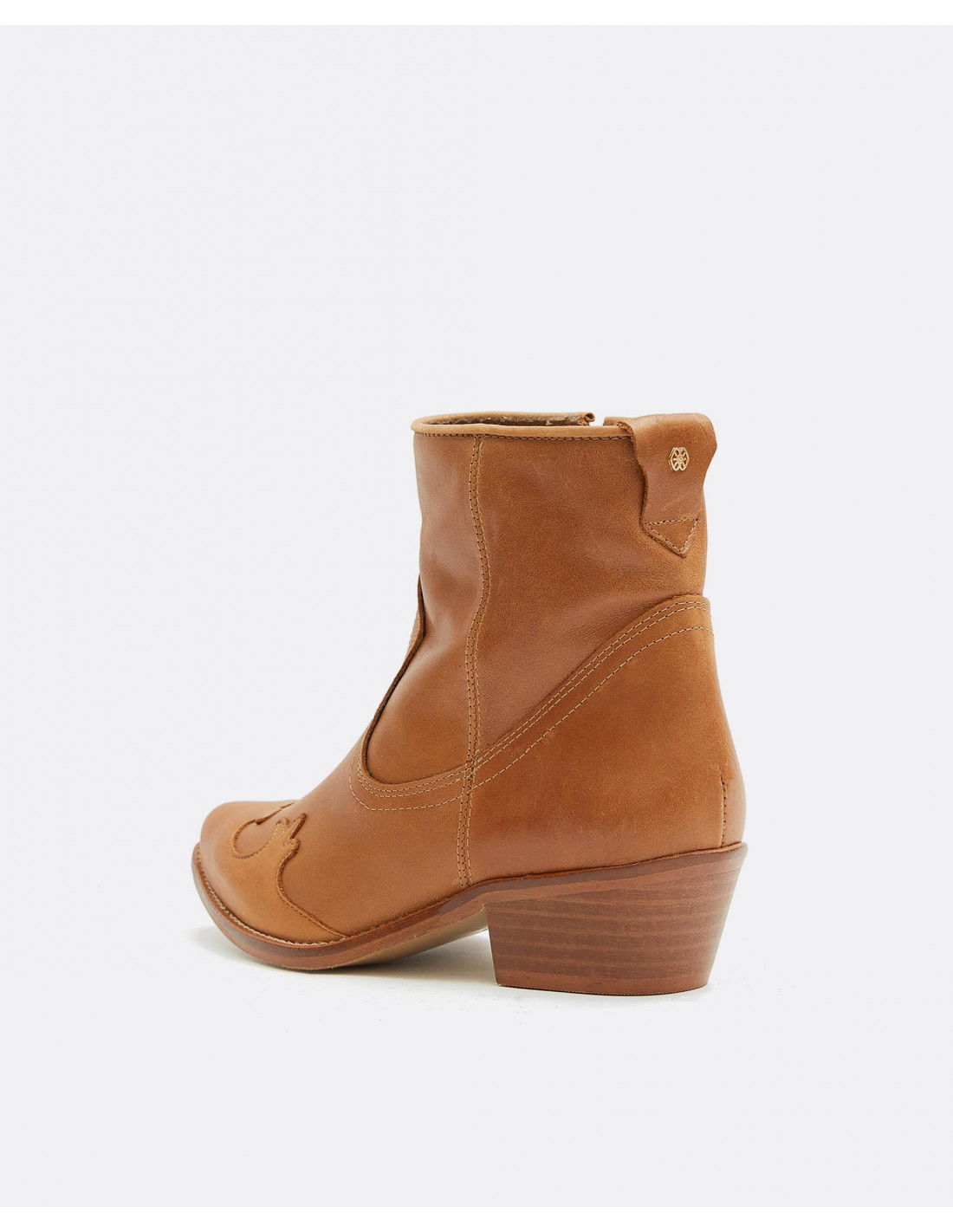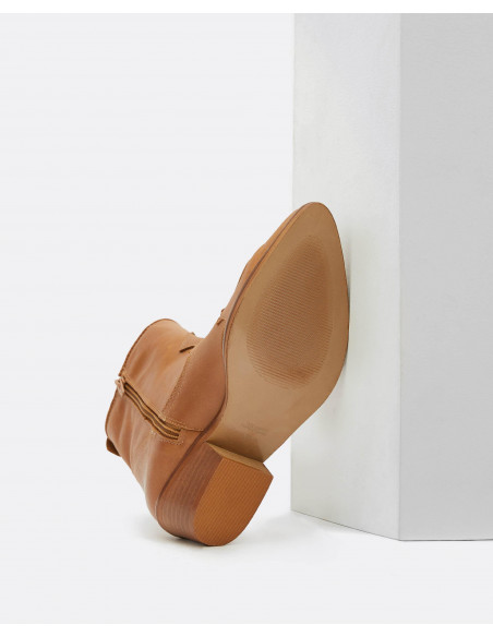Botín estilo cowboy de napa color cuero para darle un campero a tu look. Ideal para combinar con nuestros vestidos e ir cómoda y perfecta en todo momento. Tiene cremallera en la parte interior para facilitar su uso.