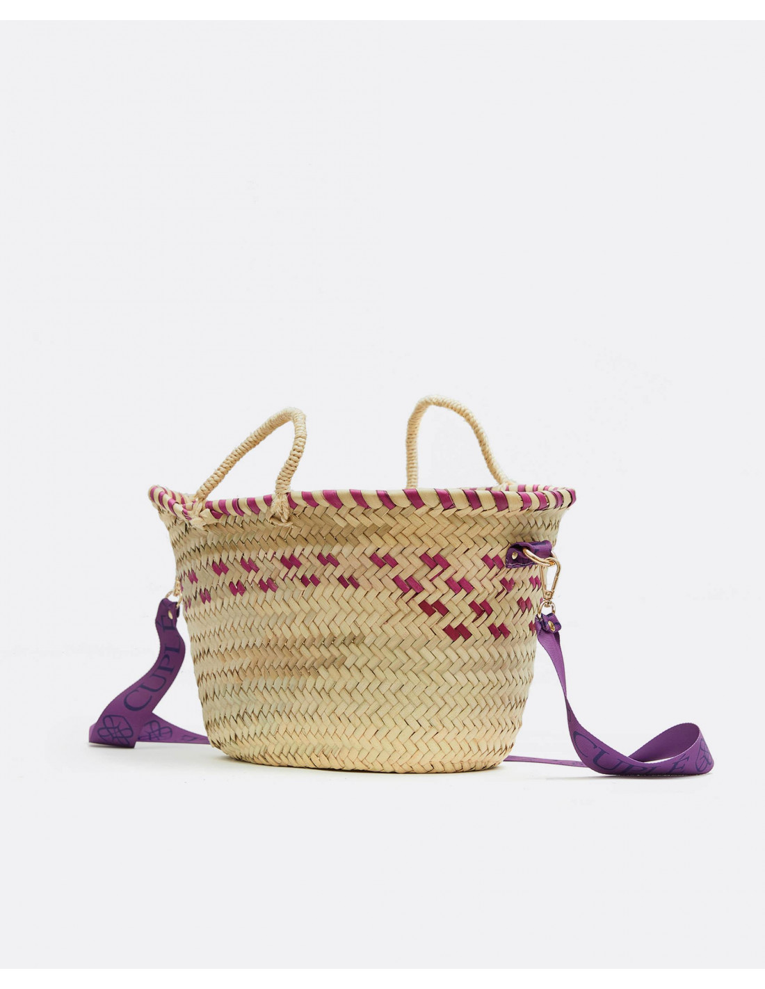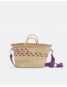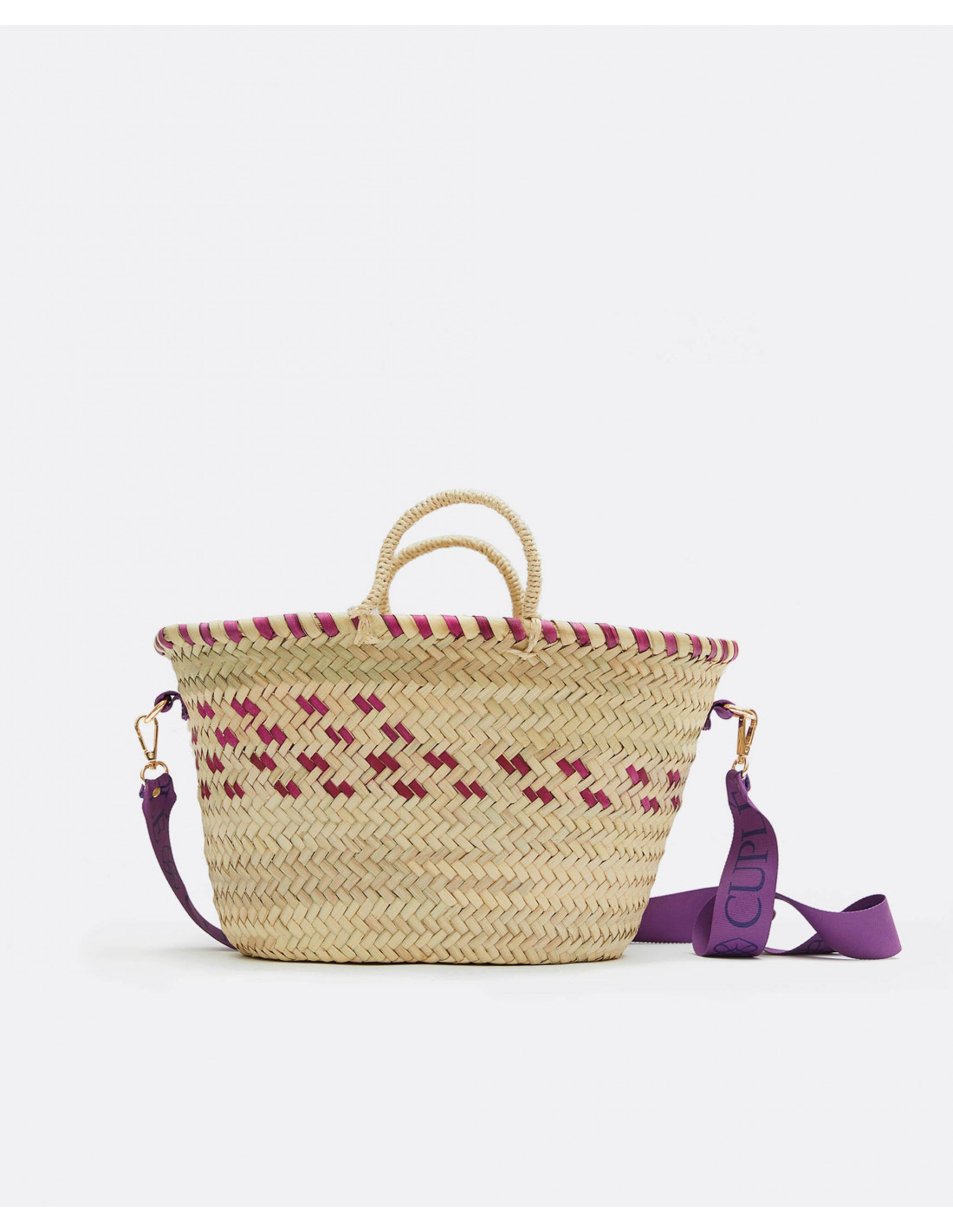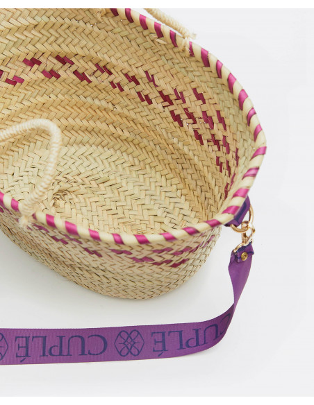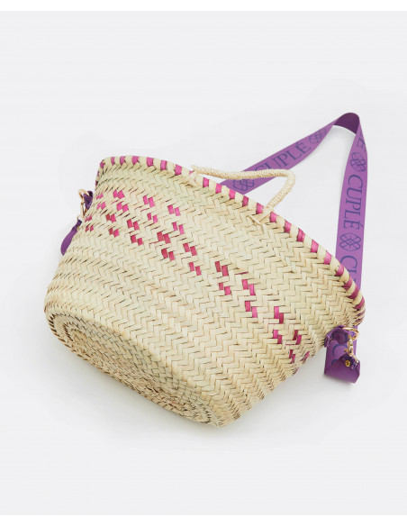 Los capazos son ideales para todo, y más este de color beige con detalles en fucsia de asas cortas para llevarlo en la mano o colgado estilo bandolera gracias a una correa morada que se puede poner o quitar.
