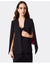 Chaleco con capa y escote pico de color negro, perfecto para combinar con nuestro pantalón de traje negro para hacer un total look, o por encima de tus vestidos de ceremonia. La modelo de la imagen mide 1'69 y lleva una talla S.