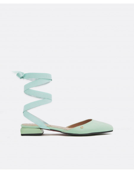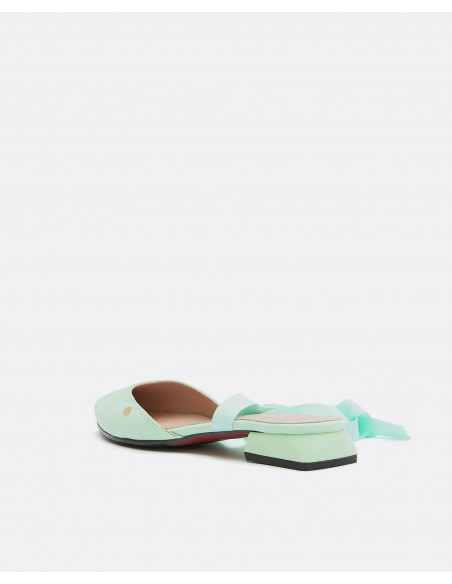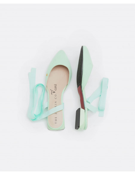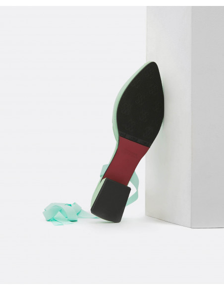 Descubre nuestros mules de ultrasuede color verde aguamarina en colaboración con THE 2ND SKIN. Se atan en la pierna mediante una lazada para terminar de dar un aire sofisticado y diferente a tu look. Esta colaboración se define por sus colores veraniegos, su elegancia y sus materiales.