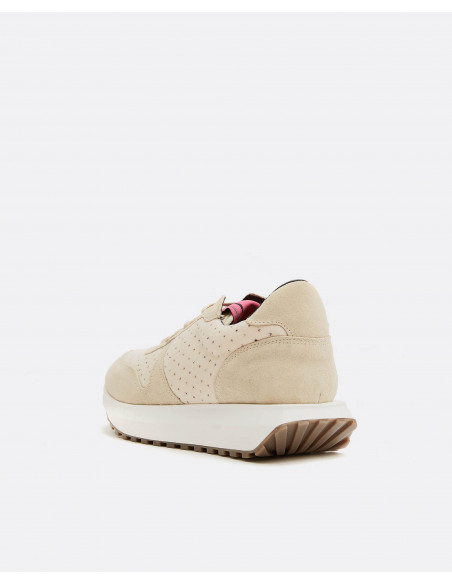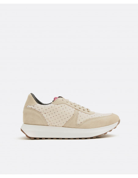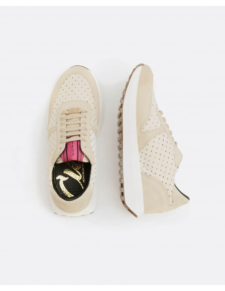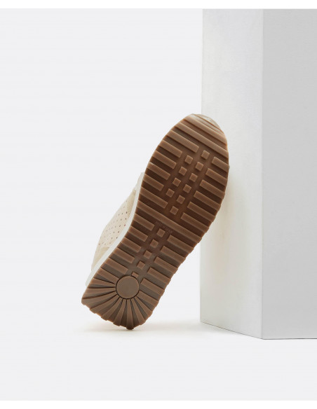 Deportivo elaborado en terciopelo y napa de color beige. Cierre de cordones.
