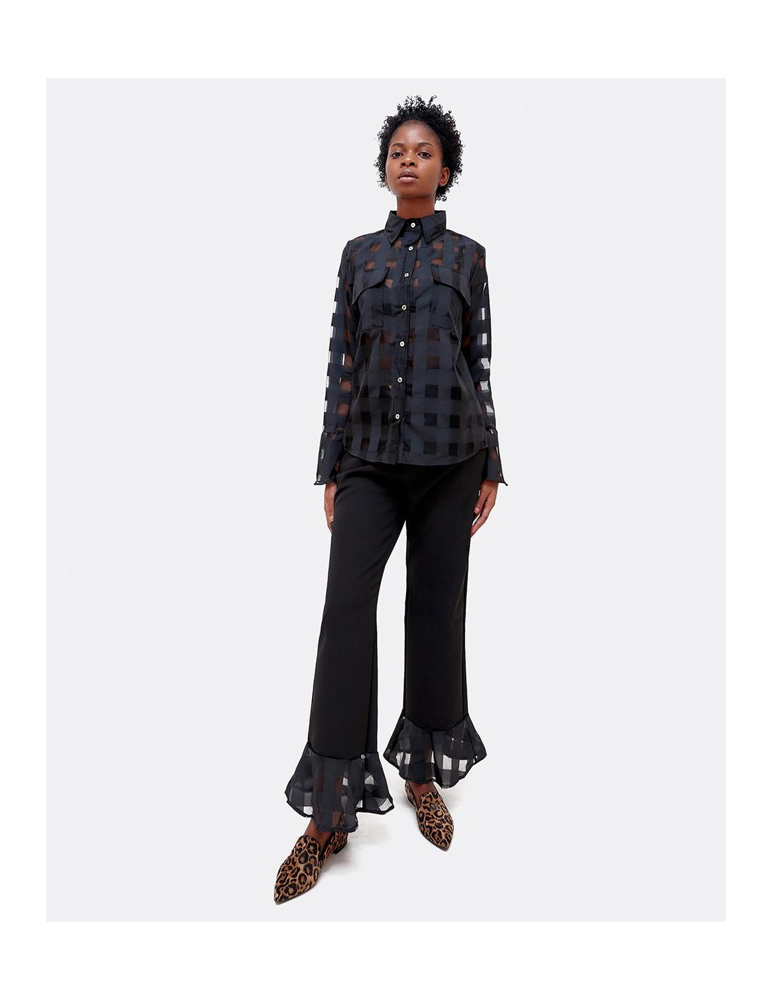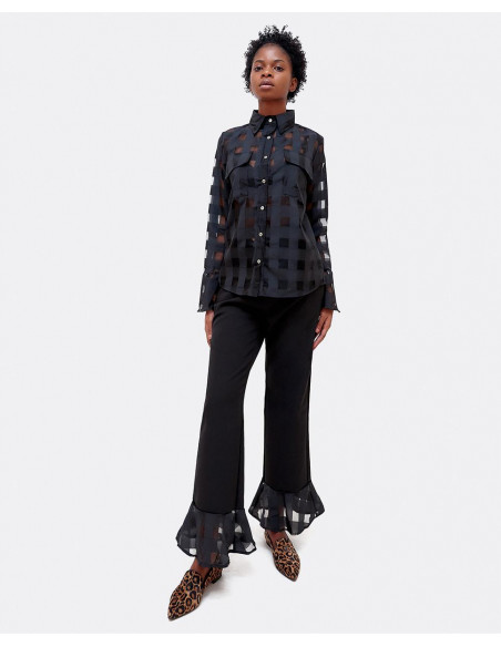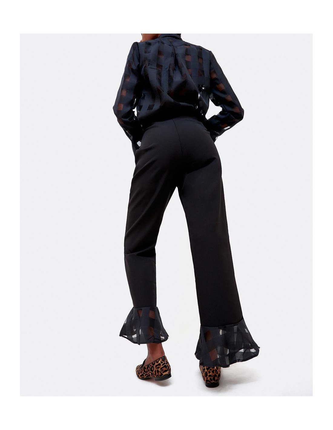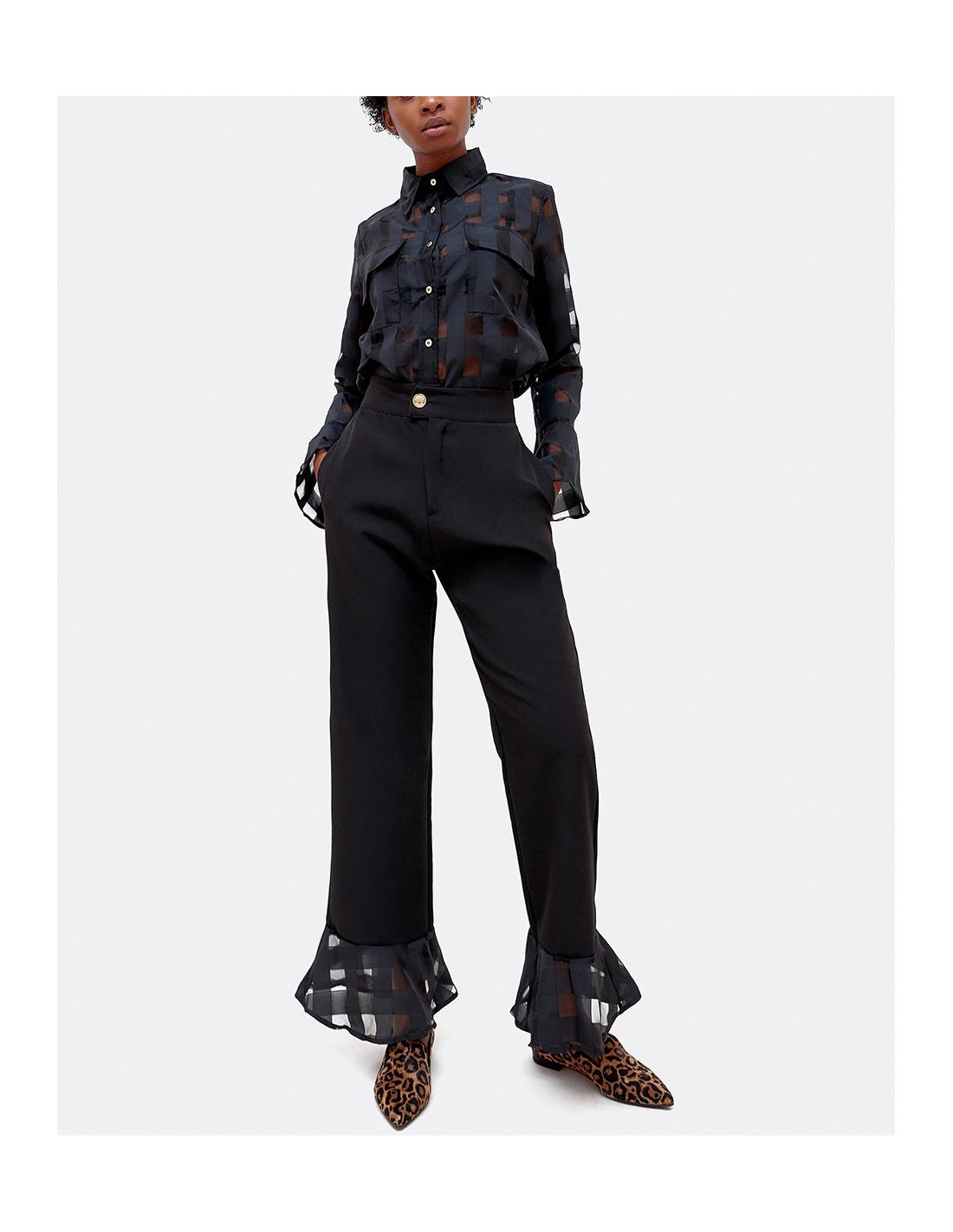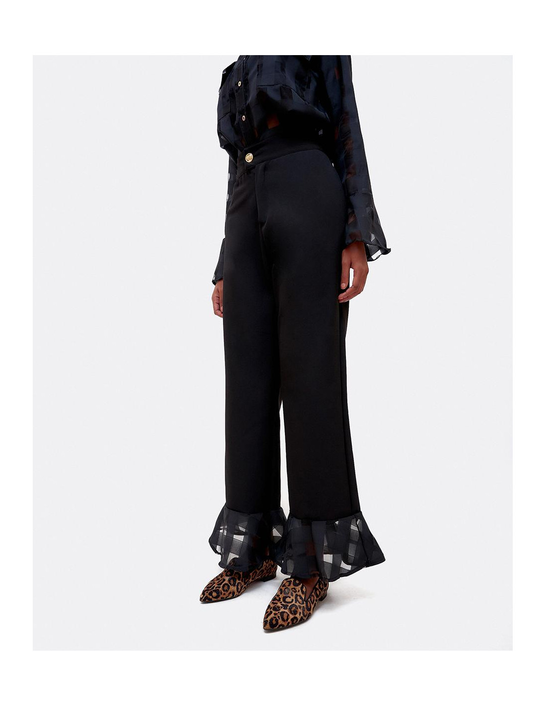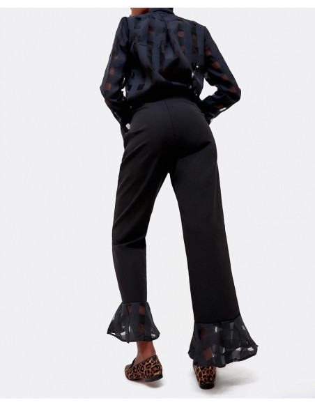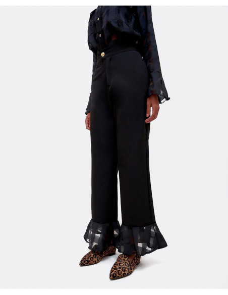 Pantalón de tiro alto con detalle de volante de organza con transparencias geométricas en el bajo del pantalón. Perfecto para tus looks de fiesta.