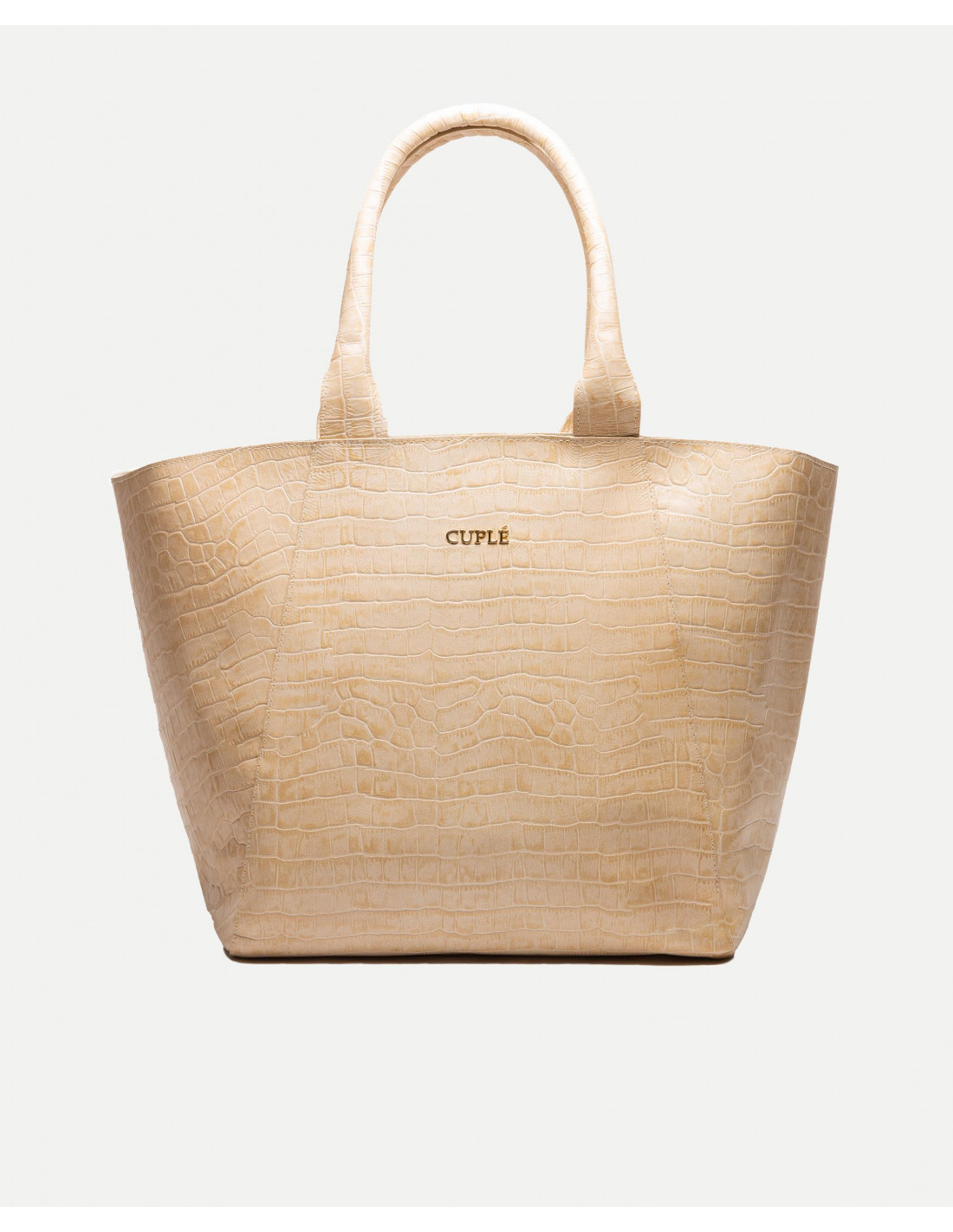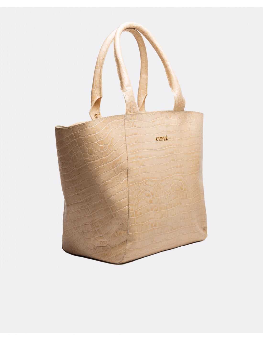 Bolso shopping grande confeccionado en España con piel de alta calidad con estampado de coco. Presenta logotipo metálico en tonalidad dorada y doble asa corta en piel.