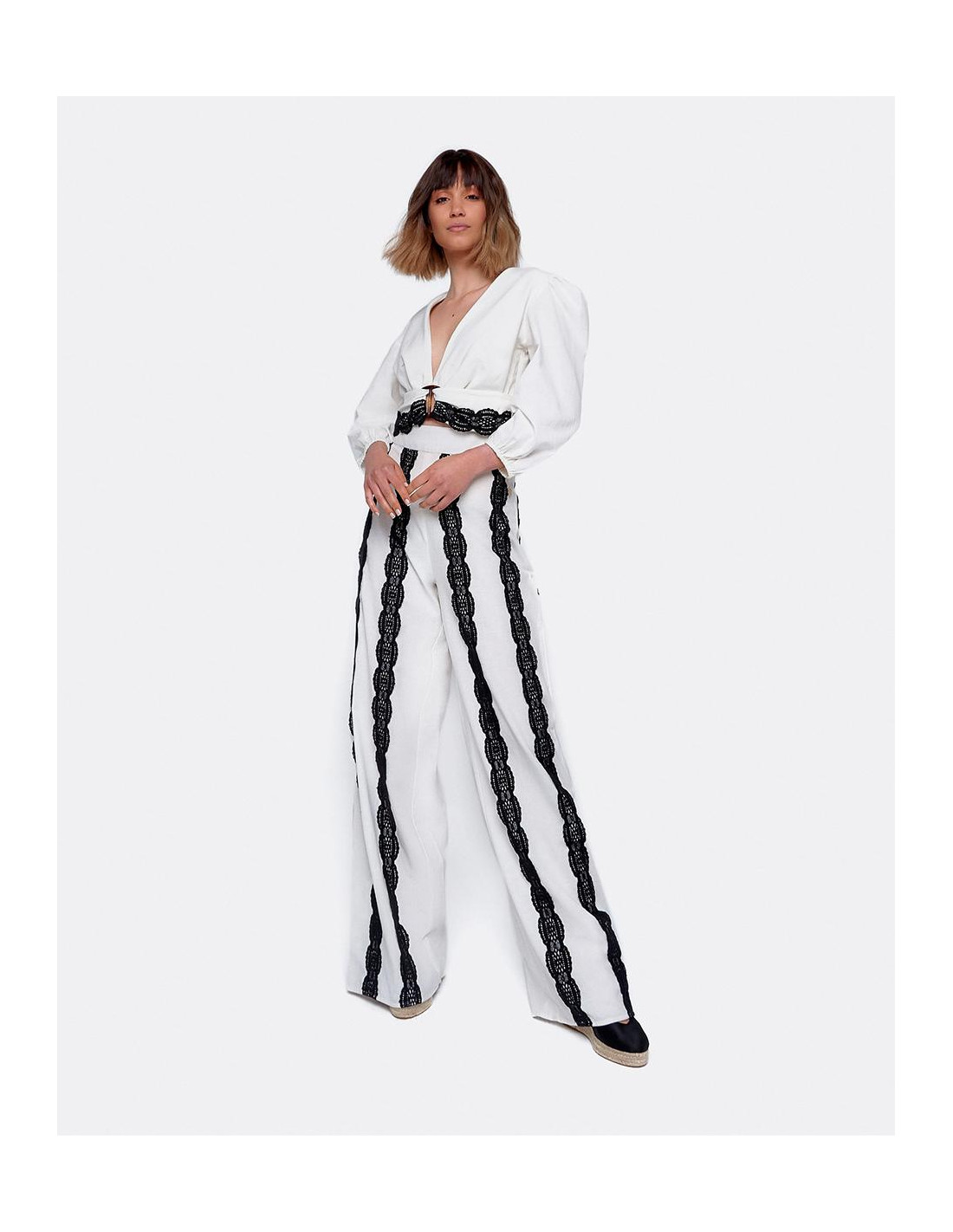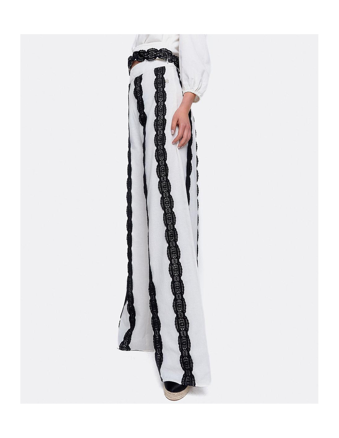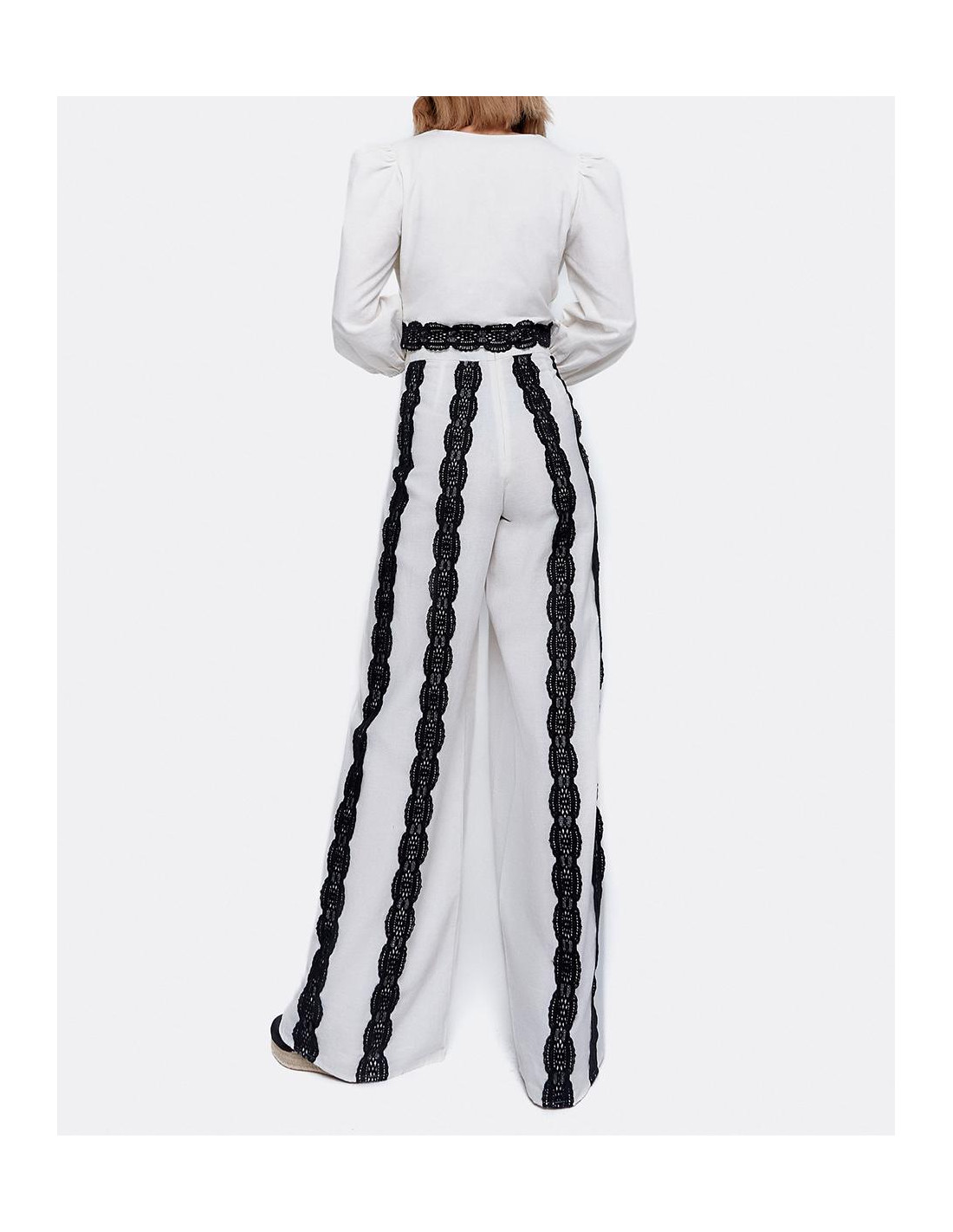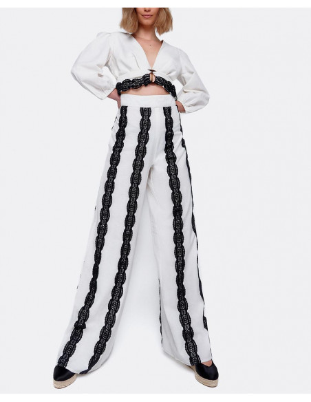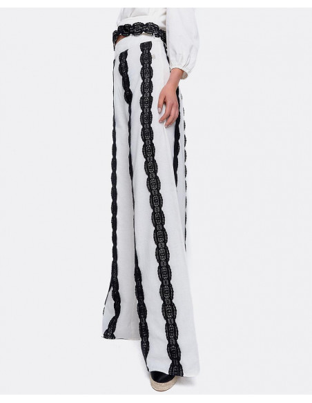 Este pantalón de tiro alto y largo con pierna ancha es ideal con unas cuñas o sandalias altas. Tiene el detalle de las rayas verticales formadas por encaje bordado negro sobre el lino blanco.