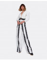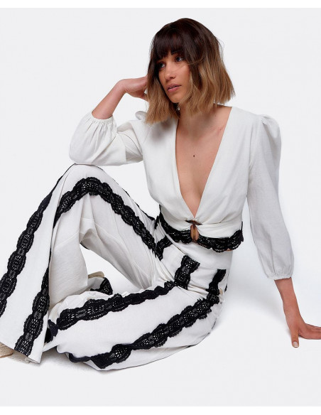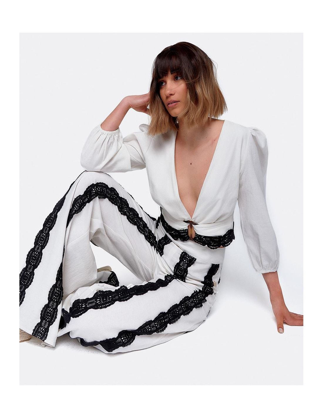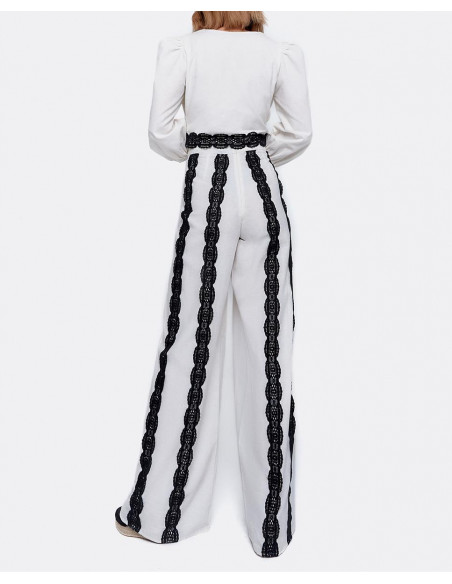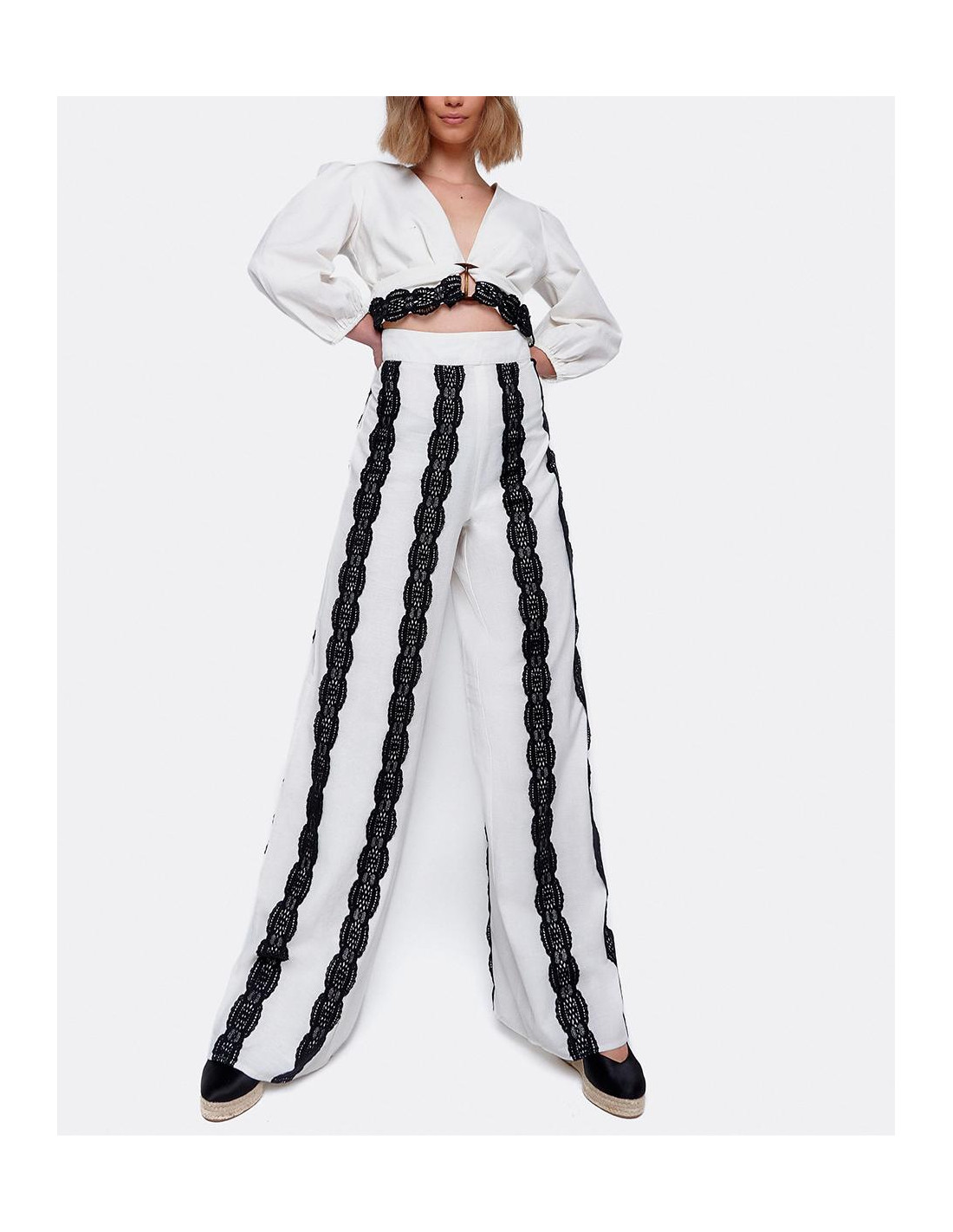 Este pantalón de tiro alto y largo con pierna ancha es ideal con unas cuñas o sandalias altas. Tiene el detalle de las rayas verticales formadas por encaje bordado negro sobre el lino blanco.