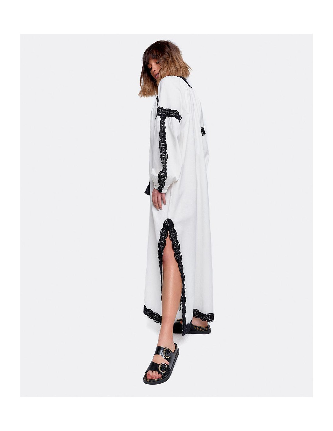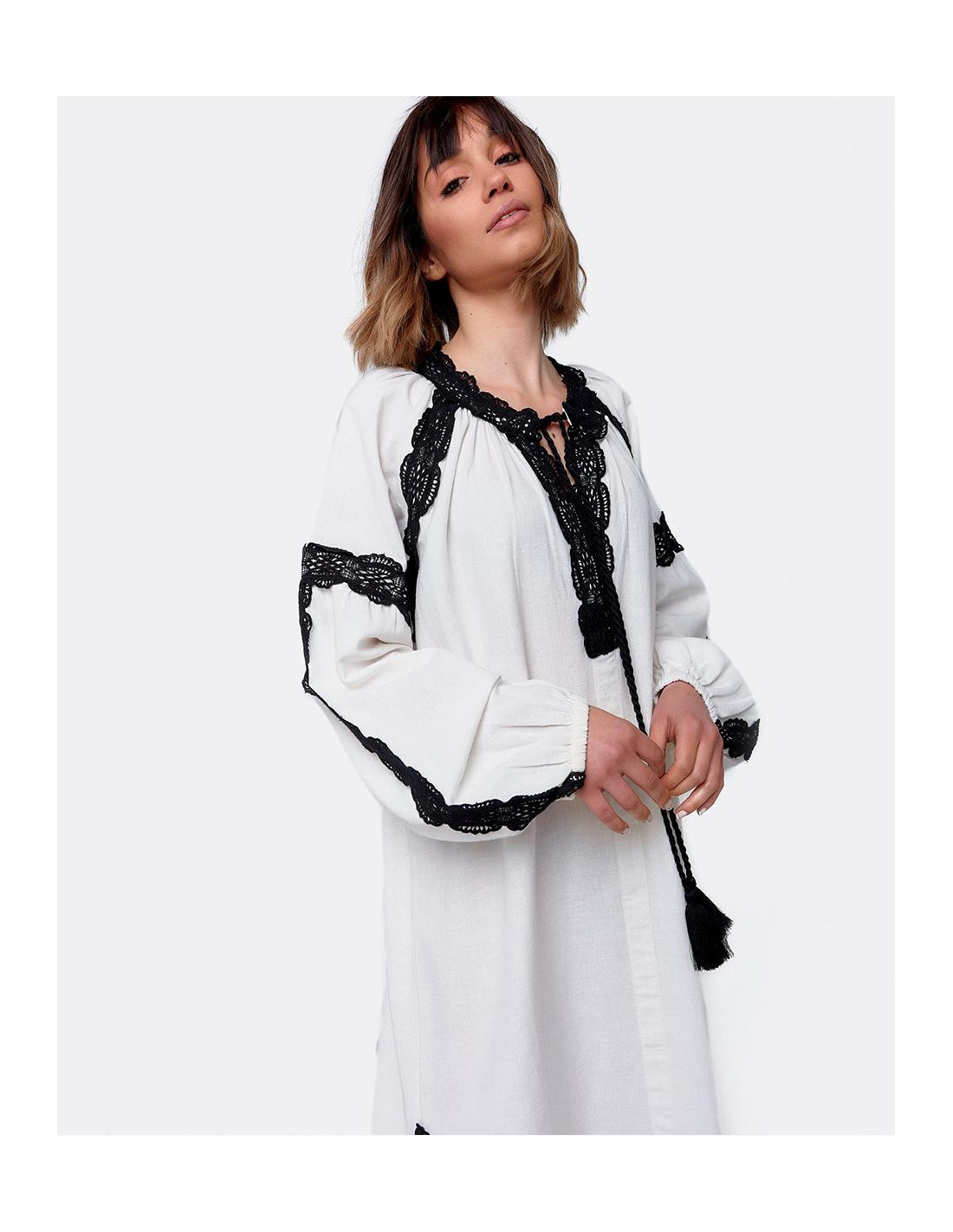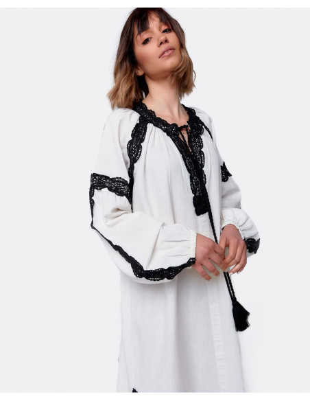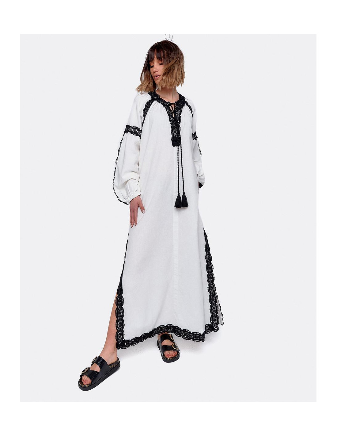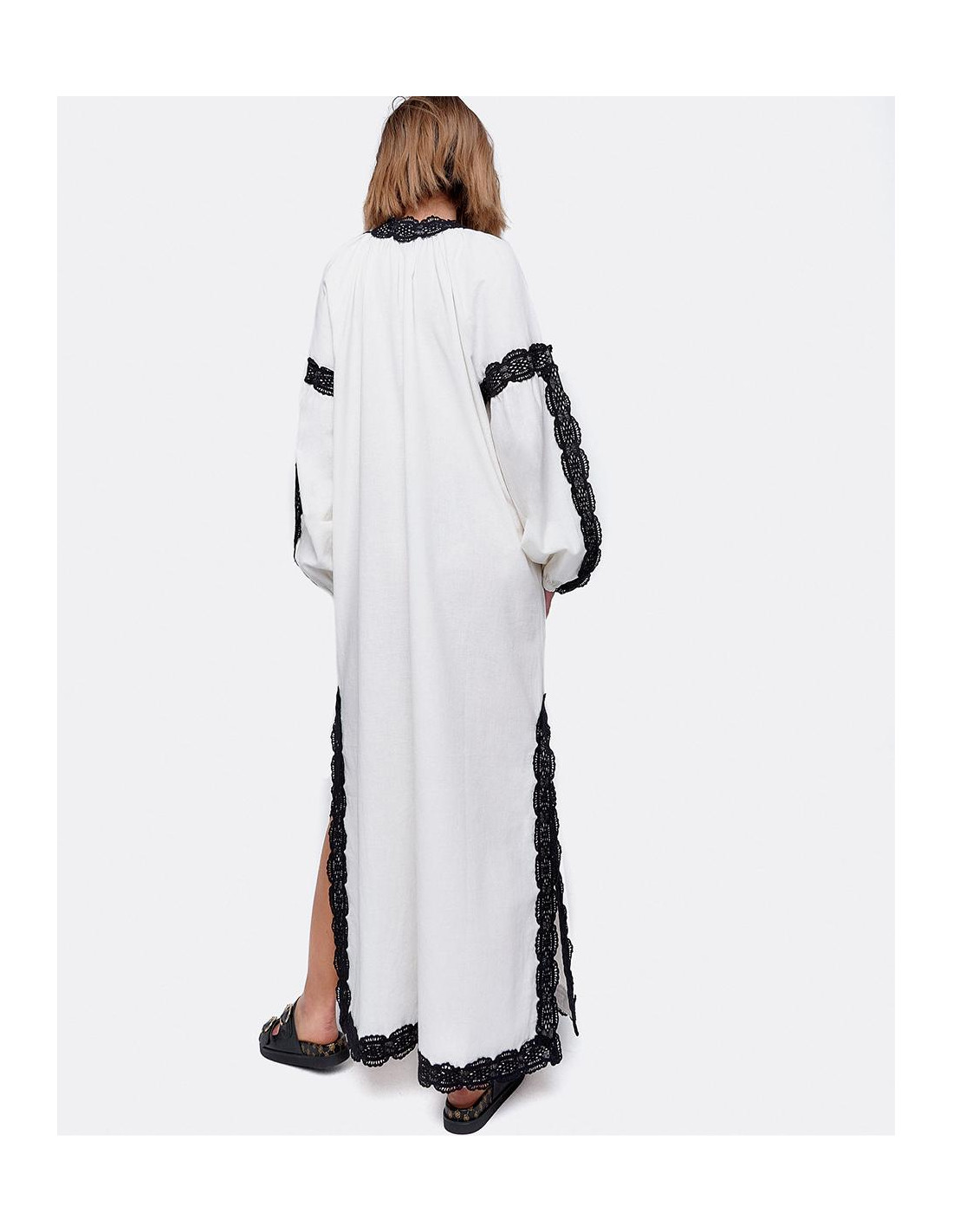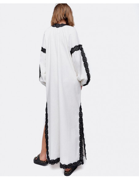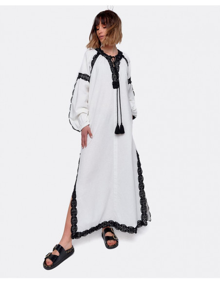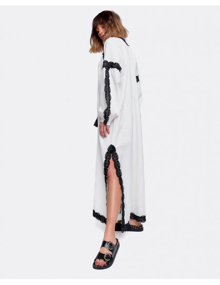 Vestido largo blanco estilo túnica de algodón con manga larga abullonada y con bordados negros. Tiene dos bordas en el escote que le dan un toque al vestido junto con las aperturas laterales. Ideal para un look de verano más playero.