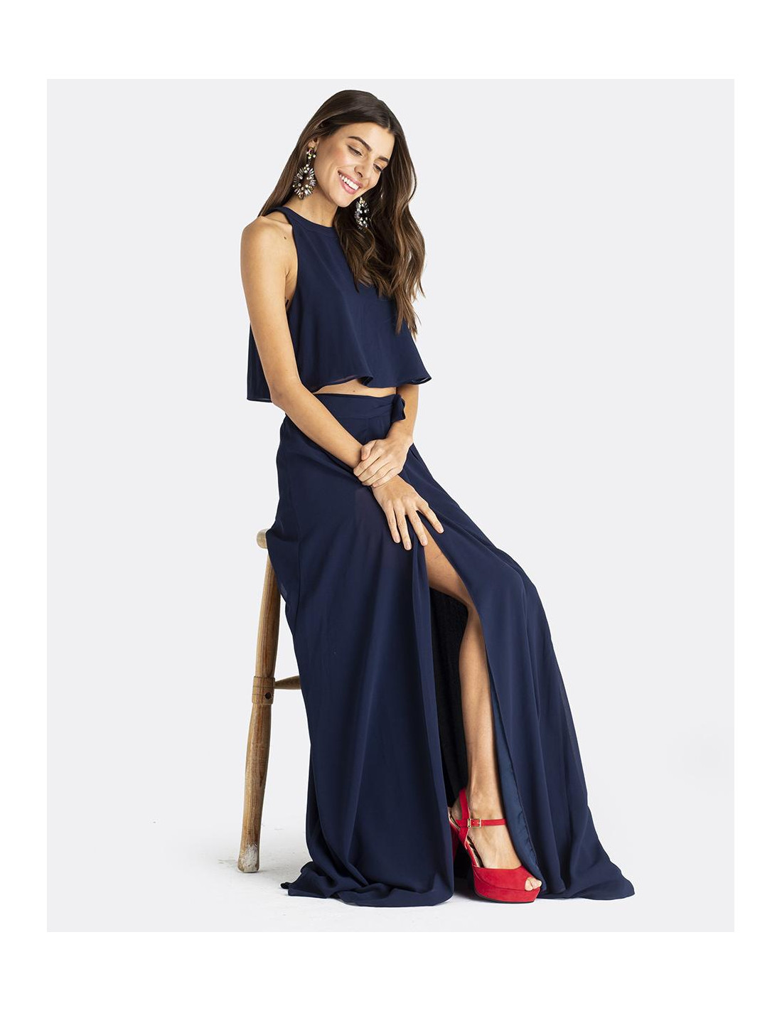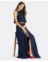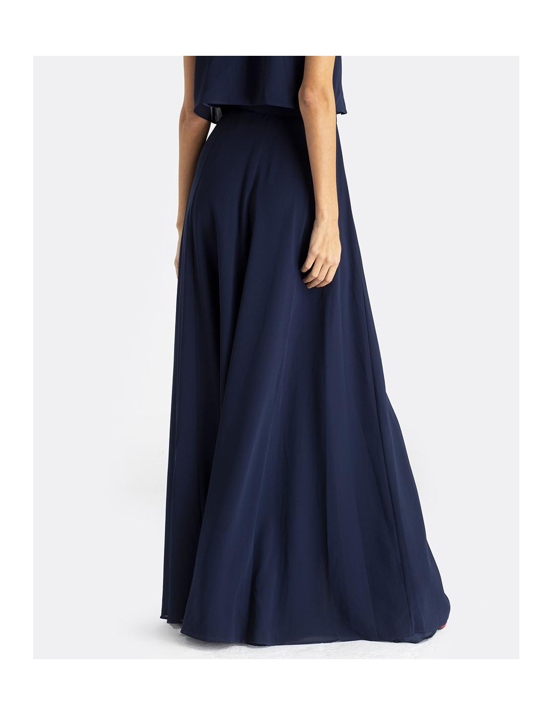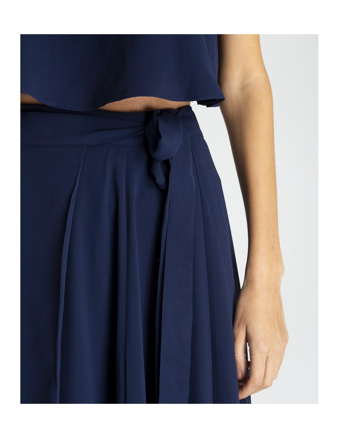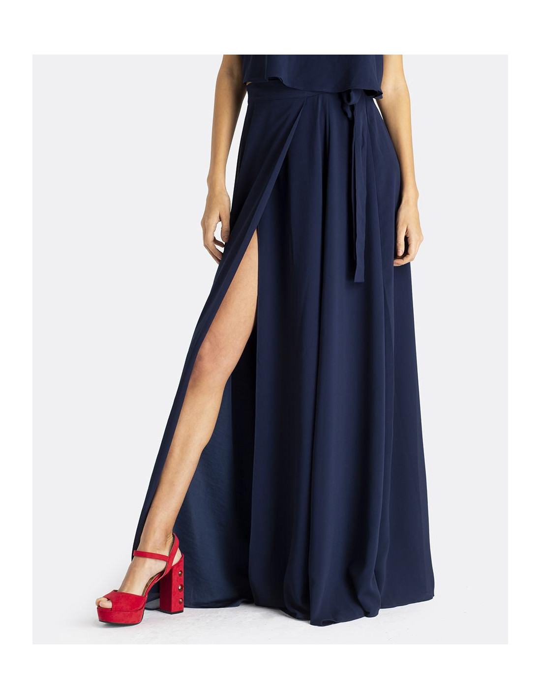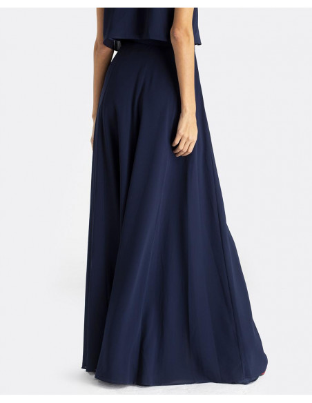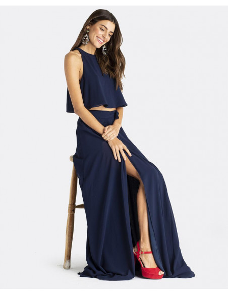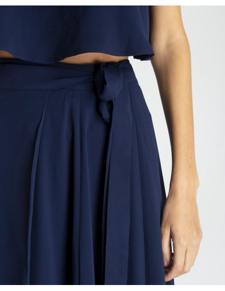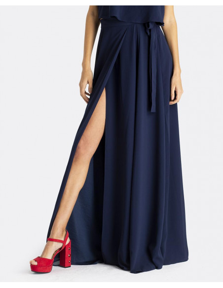 Maxi falda CUPLÉ de gasa en color azul marino. Estilo pareo, se ata a la cintura mediante un lazo. Corte hasta los pies y detalle de abertura en la pierna. Es muy elegante y perfecta para un evento especial. Combínala con su top a conjunto.