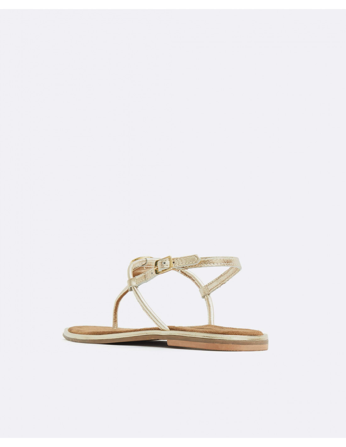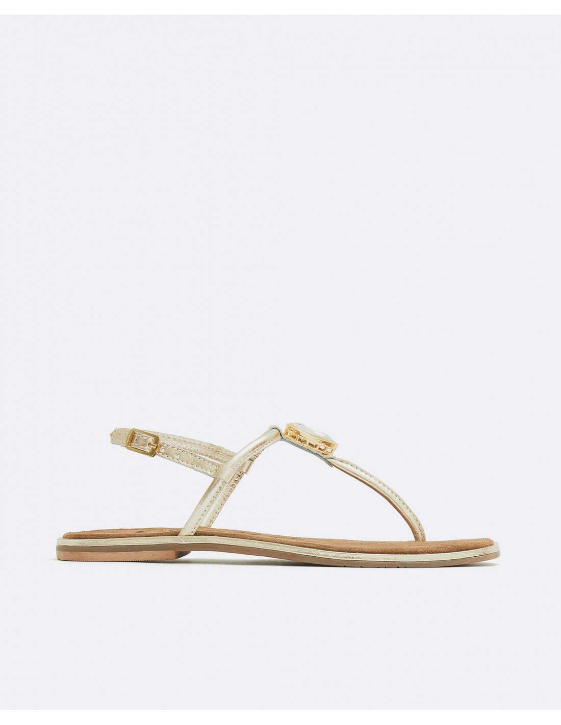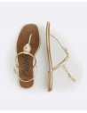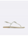 Sandalia napa plana, en color blanco, con detalles en pedrería color dorado. Sujeción al tobillo mediante hebilla acabada en dorado. Una opción sencilla pero a la vez elegante, comodísimas y versátiles de combinar.