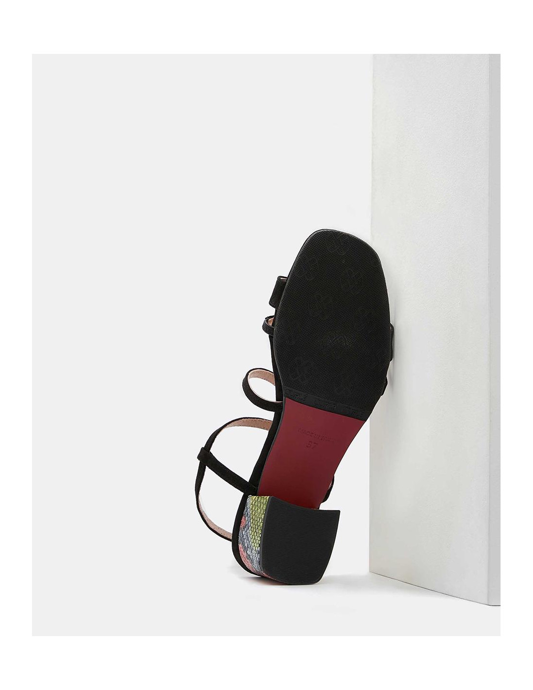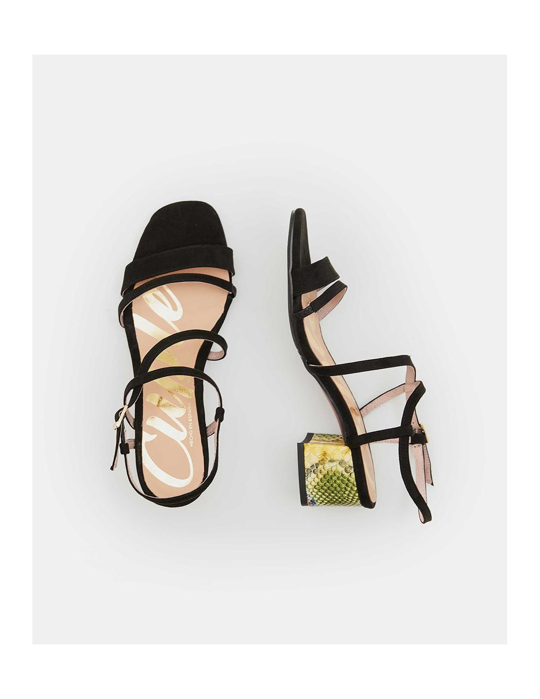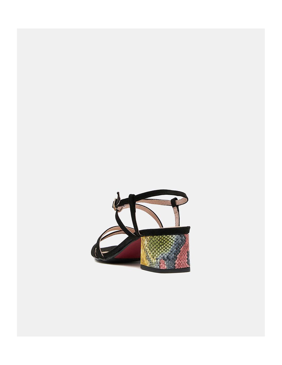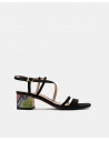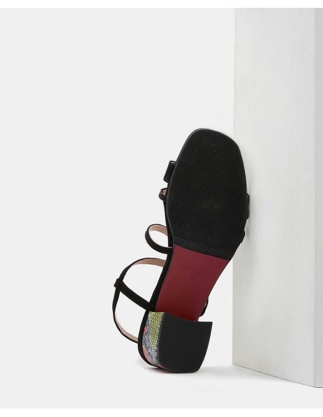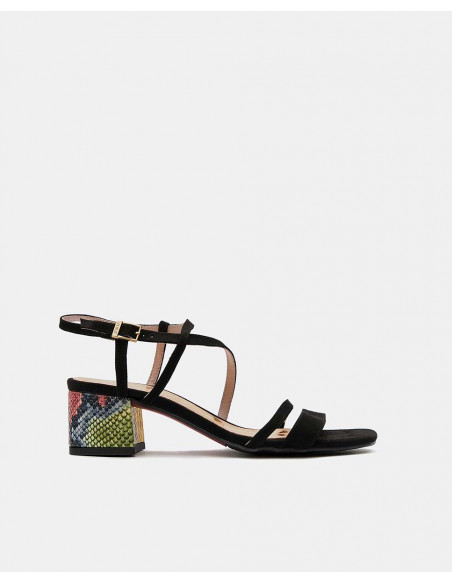 Sandalias negras de tiras, con tacón grueso y estampado de serpiente en tonos cálidos y frios. Harán que te sientas muy cómoda usandolo ya sea bien para un evento especial o a diario.