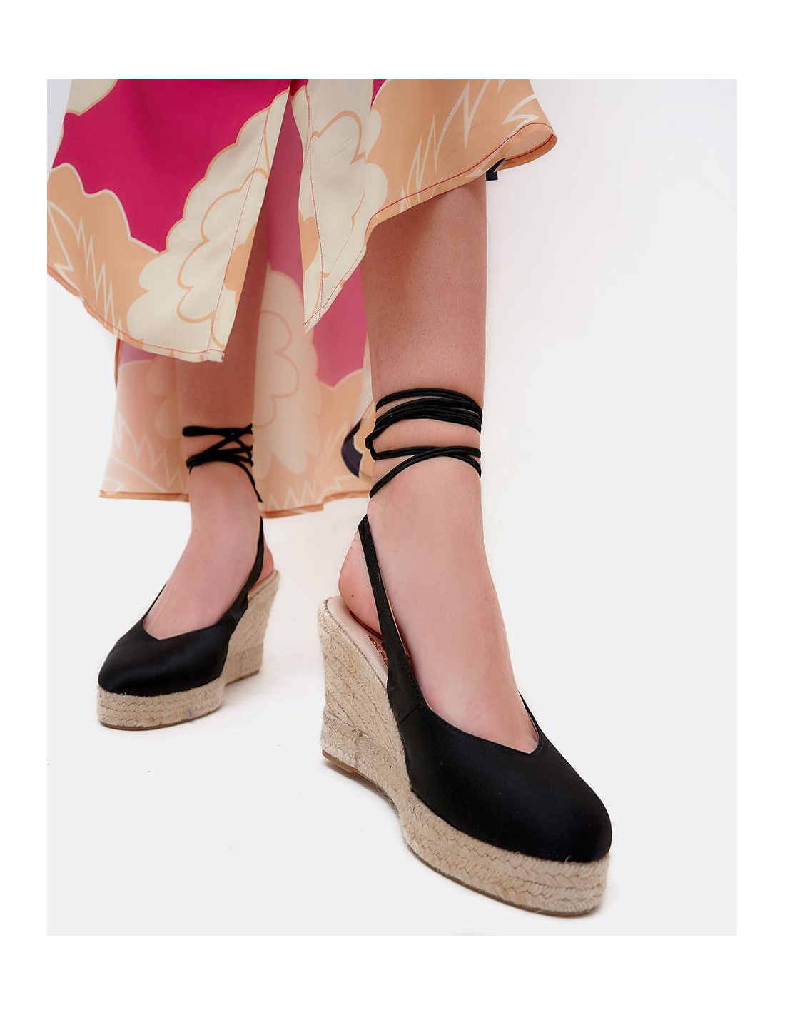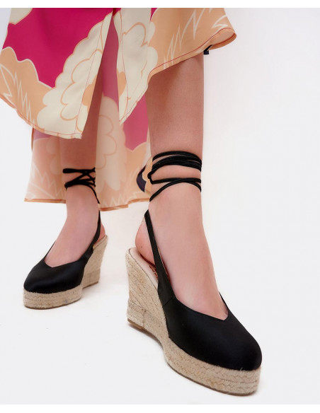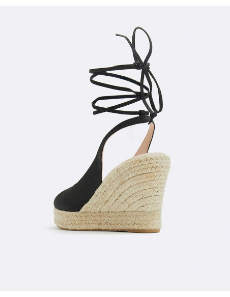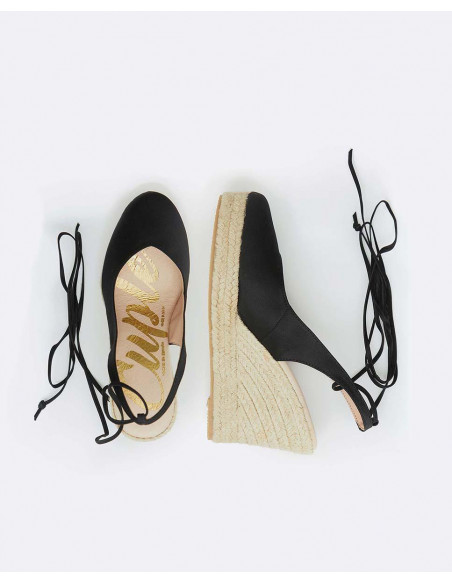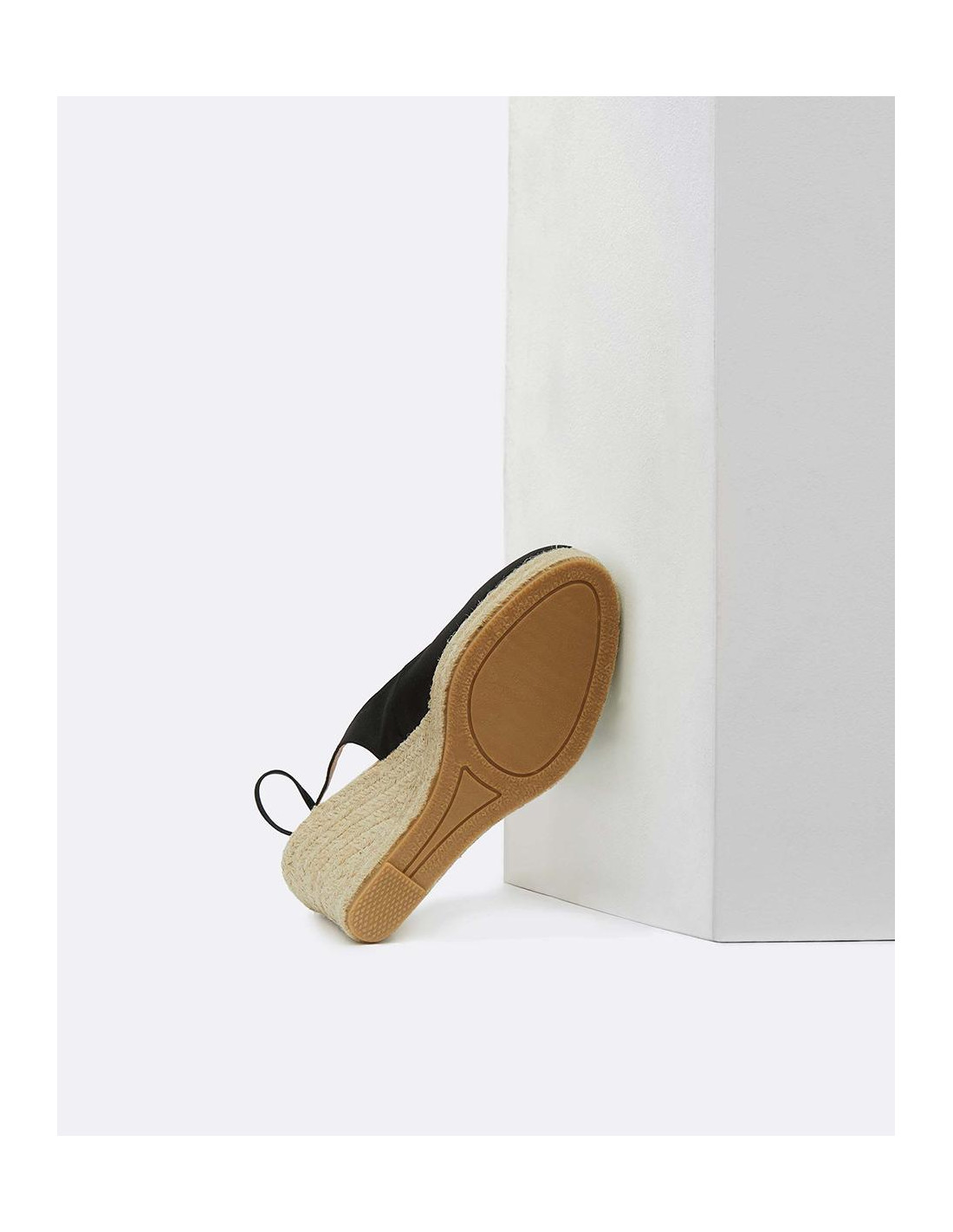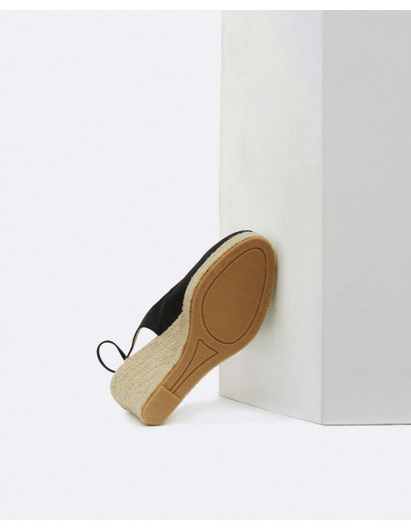 Cuña yute destalonada en color negro, sujeción mediante tiras con plataforma alta. Crea un total look Cuplé combinandolas con la camiseta con detalle de aro, color negra y mangas estilo holgadas disponible en la web.