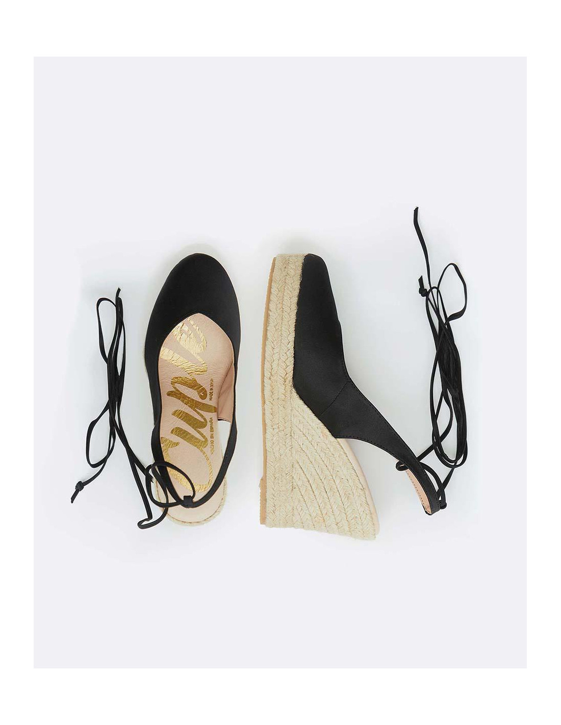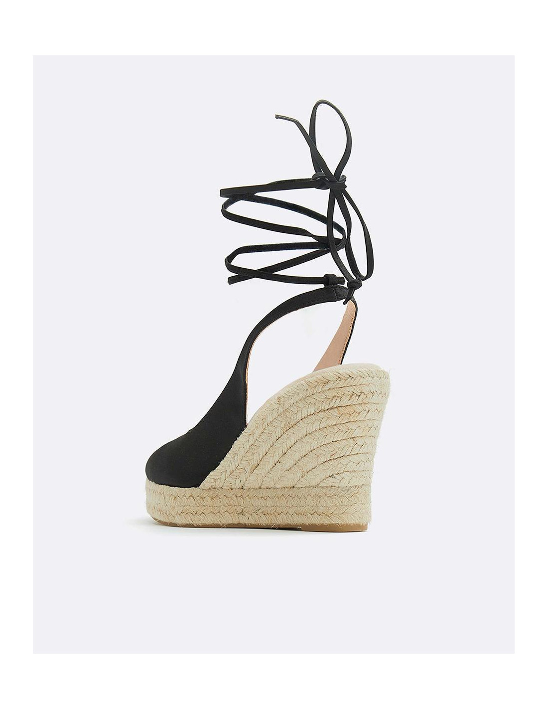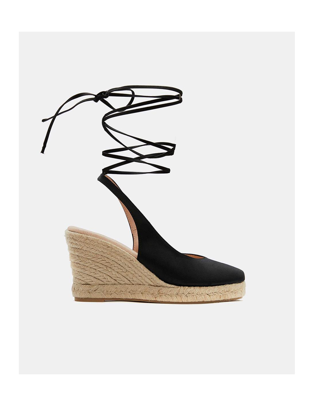 Cuña yute destalonada en color negro, sujeción mediante tiras con plataforma alta. Crea un total look Cuplé combinandolas con la camiseta con detalle de aro, color negra y mangas estilo holgadas disponible en la web.