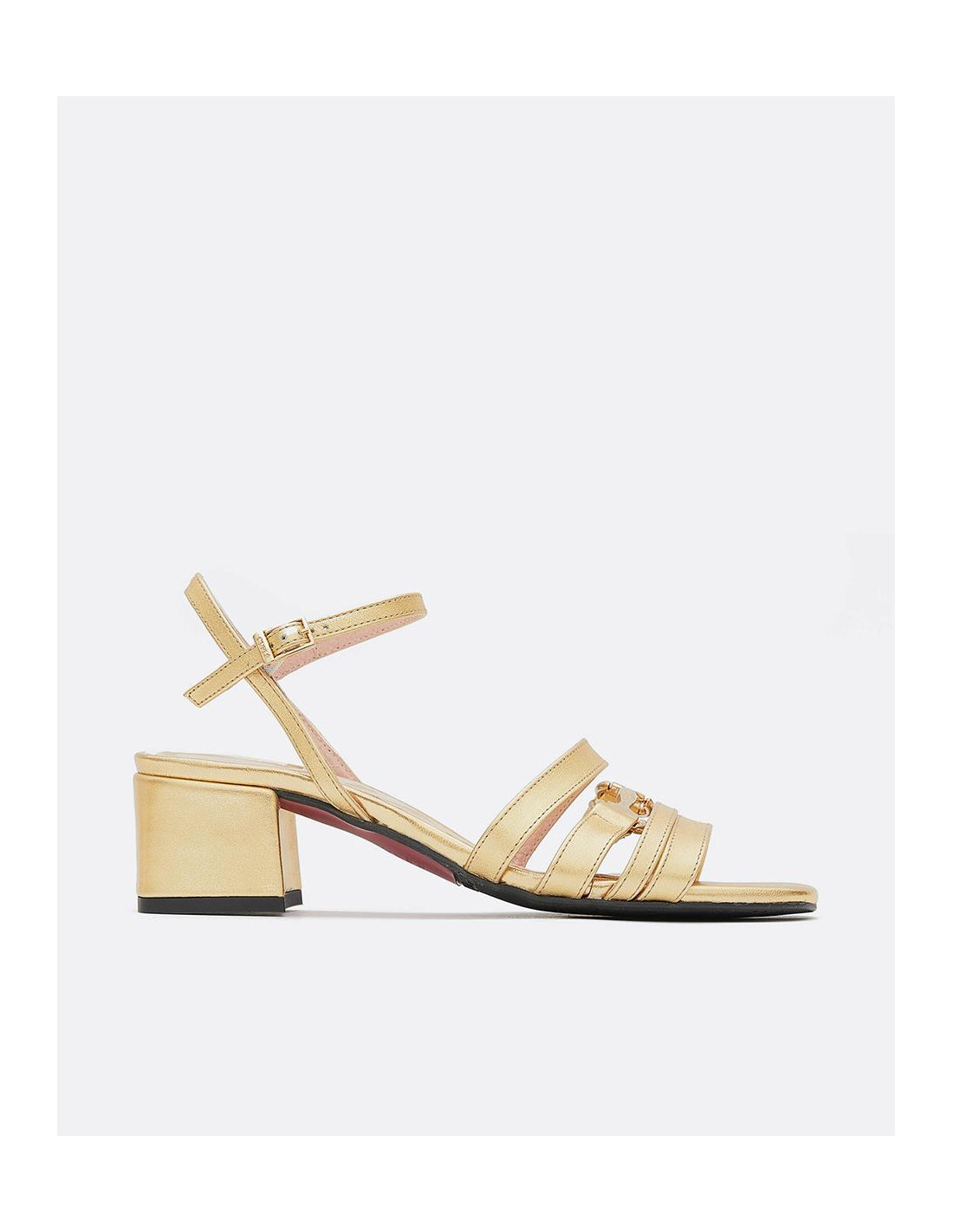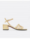 Sandalias napa de tiras color metalizado oro, detalle en dorado Cuplé, con pequeño tacón. Ideales para darle el toque de brillante a tu look en verano.