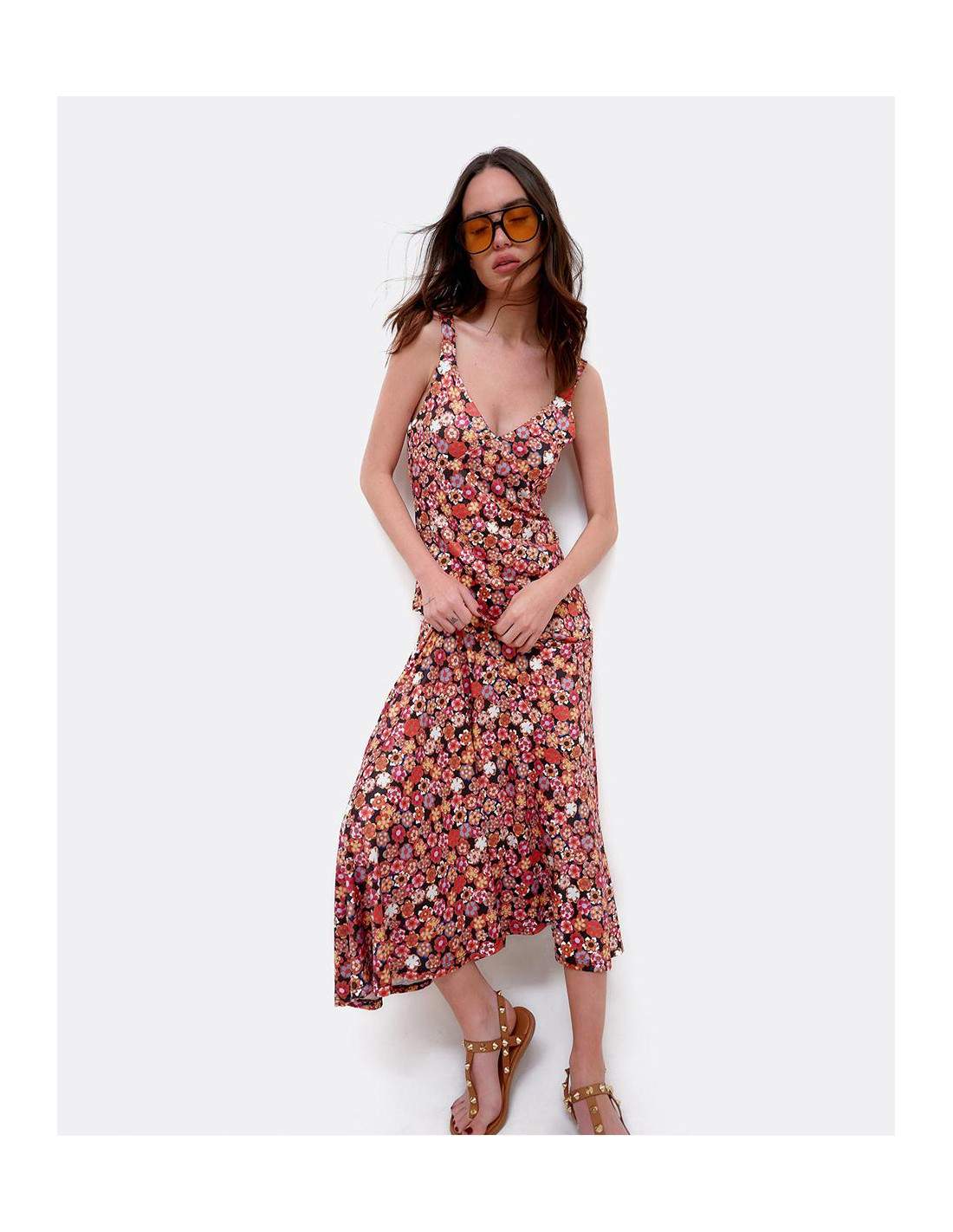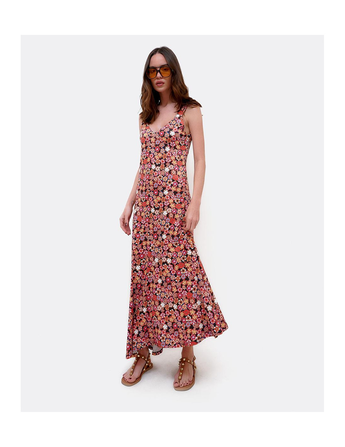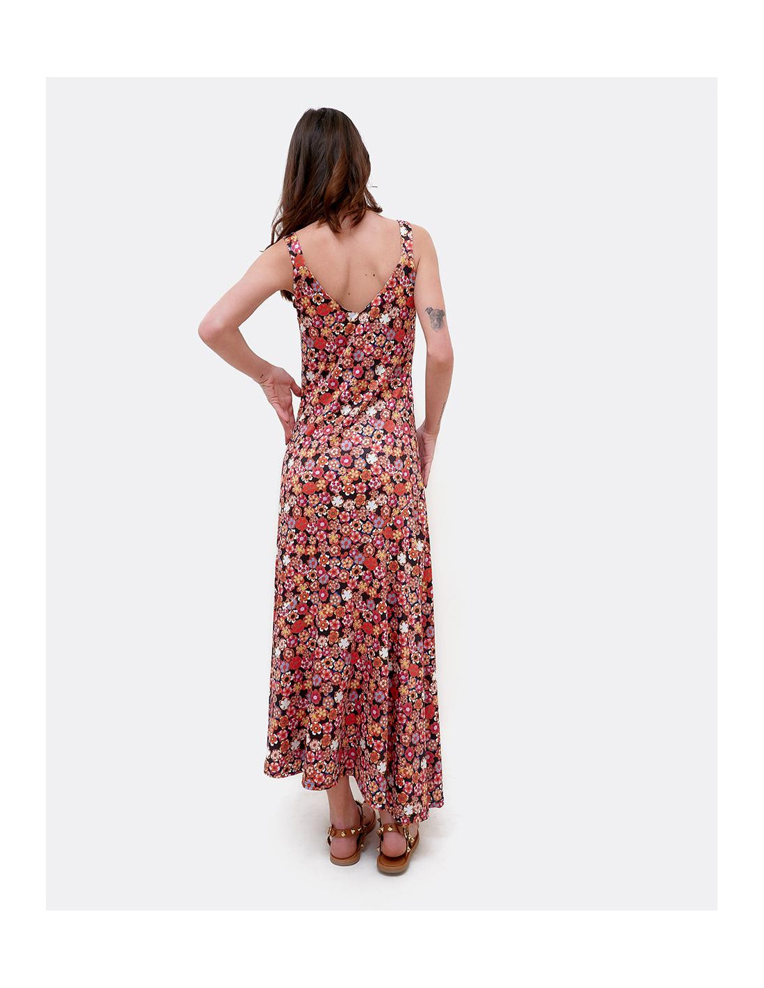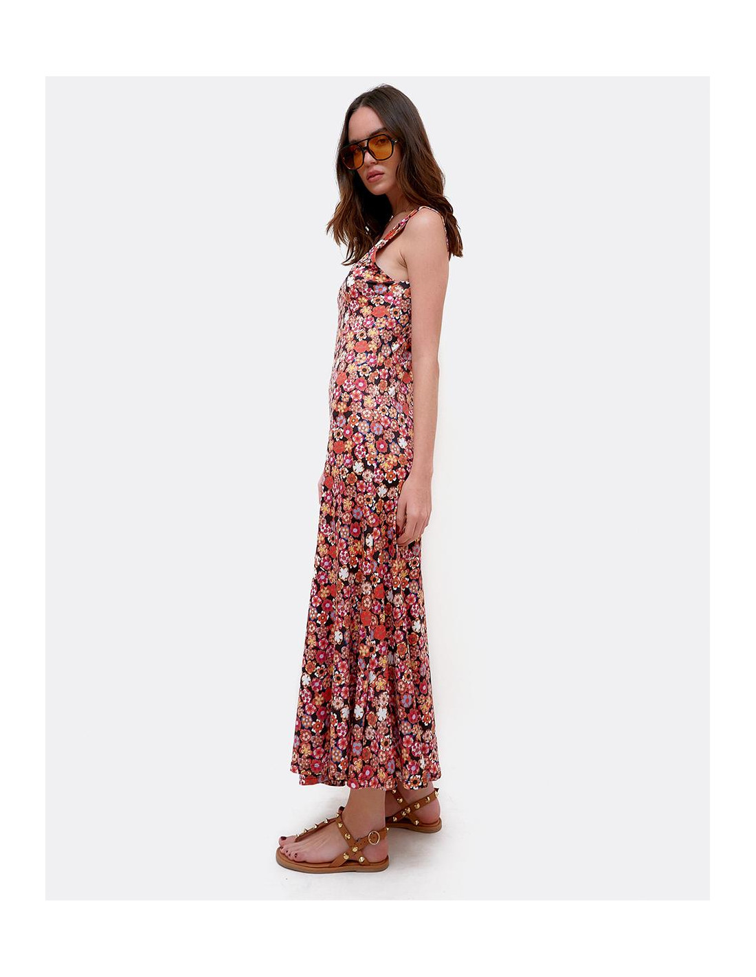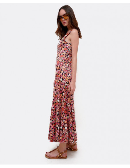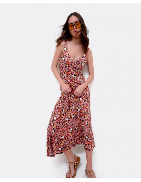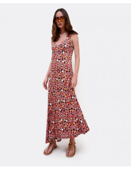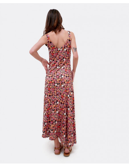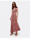 Vestido maxi por encima de los tobillos, con tirantes y estampado Liberty en colores rojizos. Perfecto para lucir en verano.