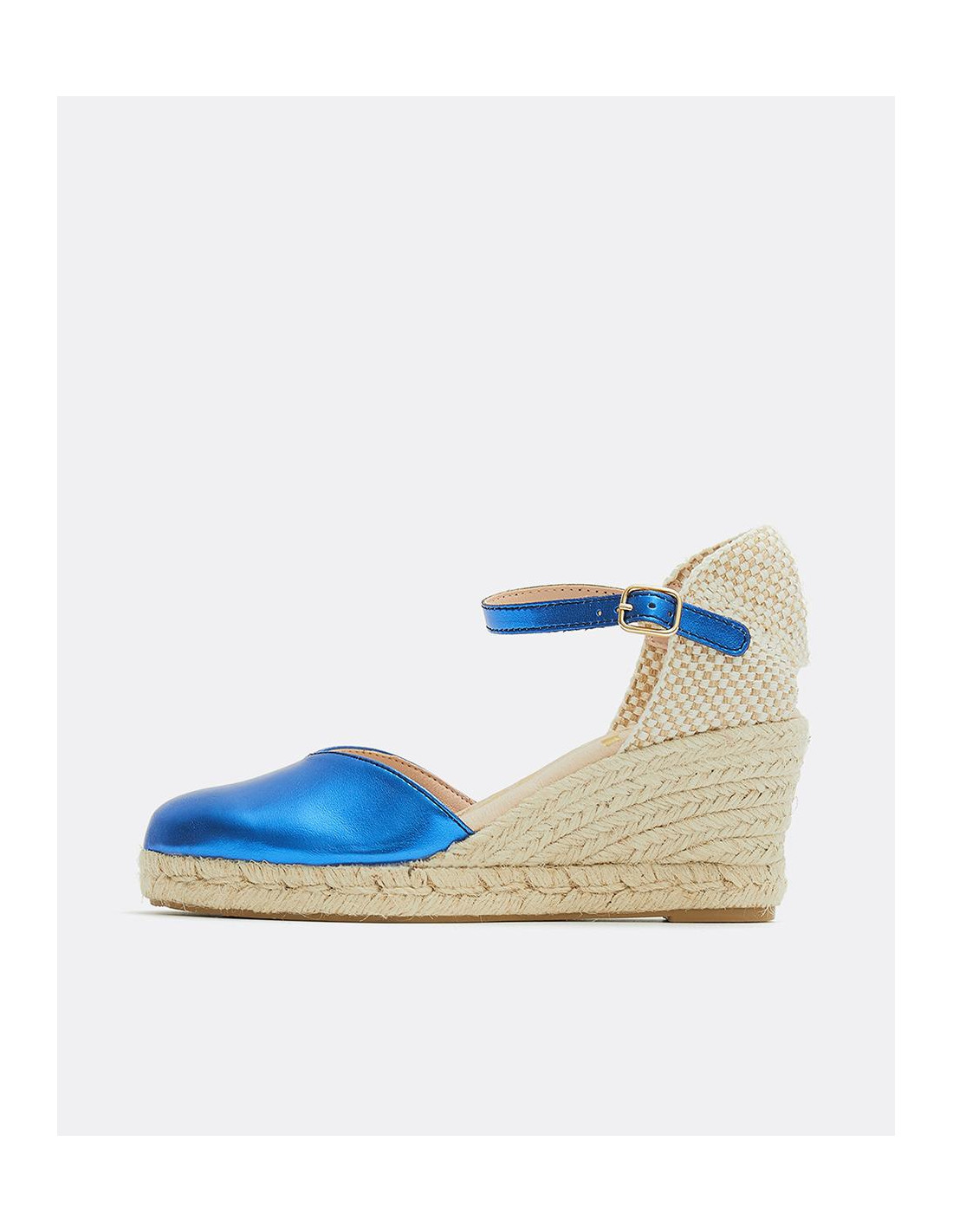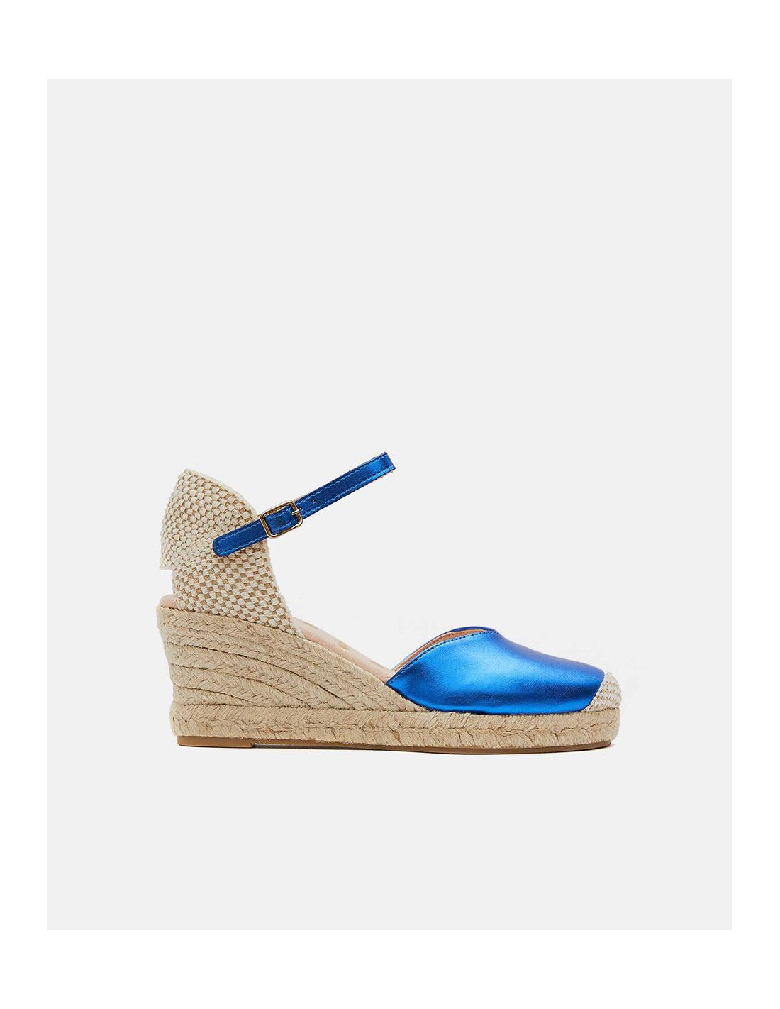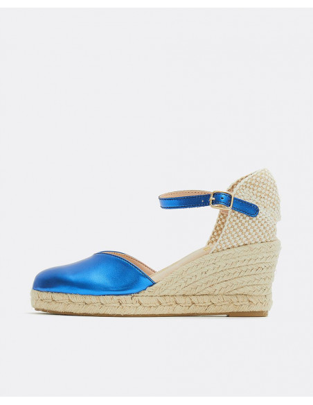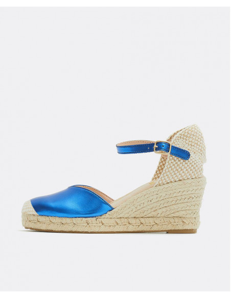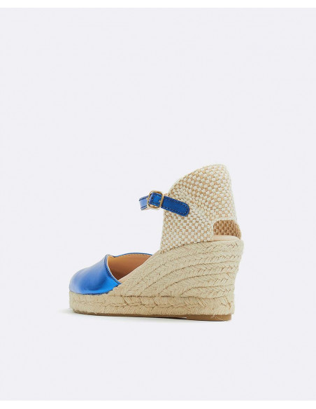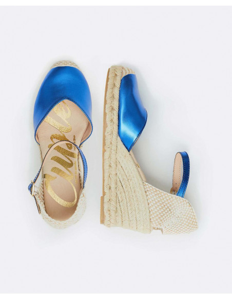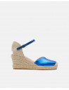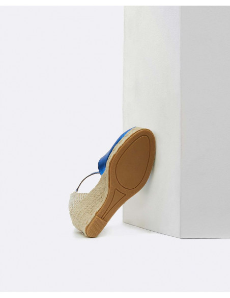 Cuña yute, en color azul eléctrico, detalle de pulsera tobillera y plataforma alta. Ideales para darle un toque de color a tu outfit.