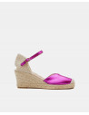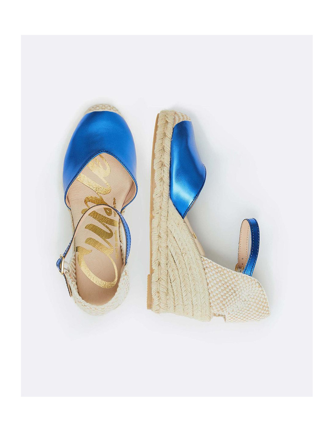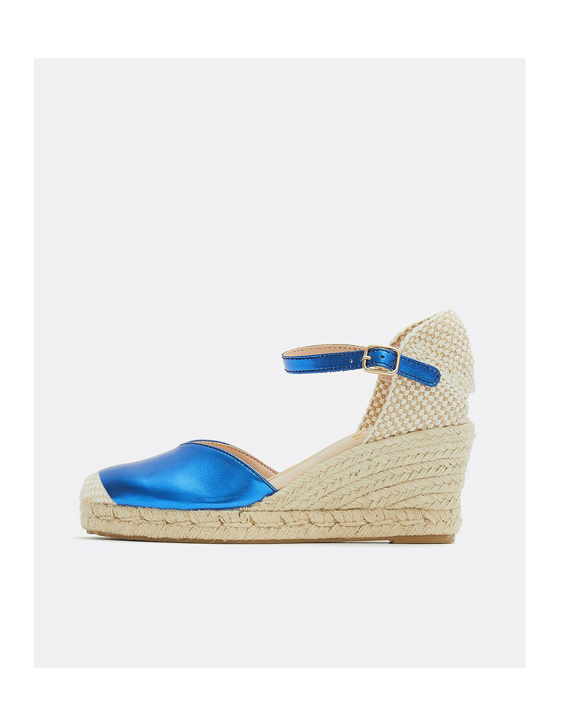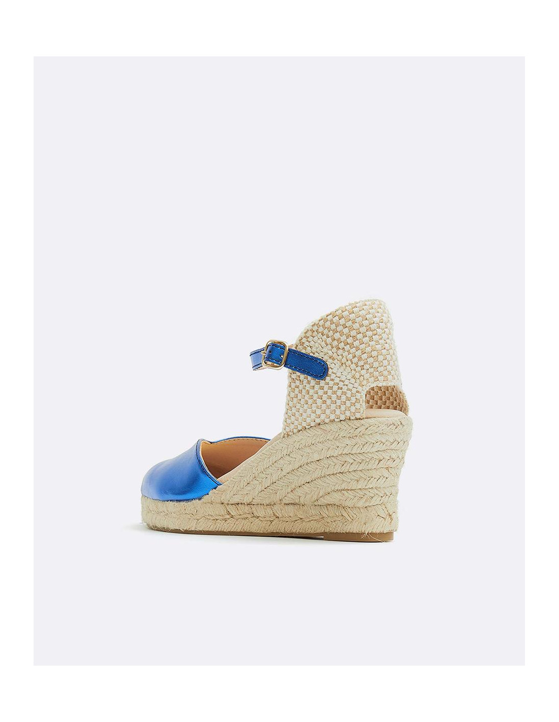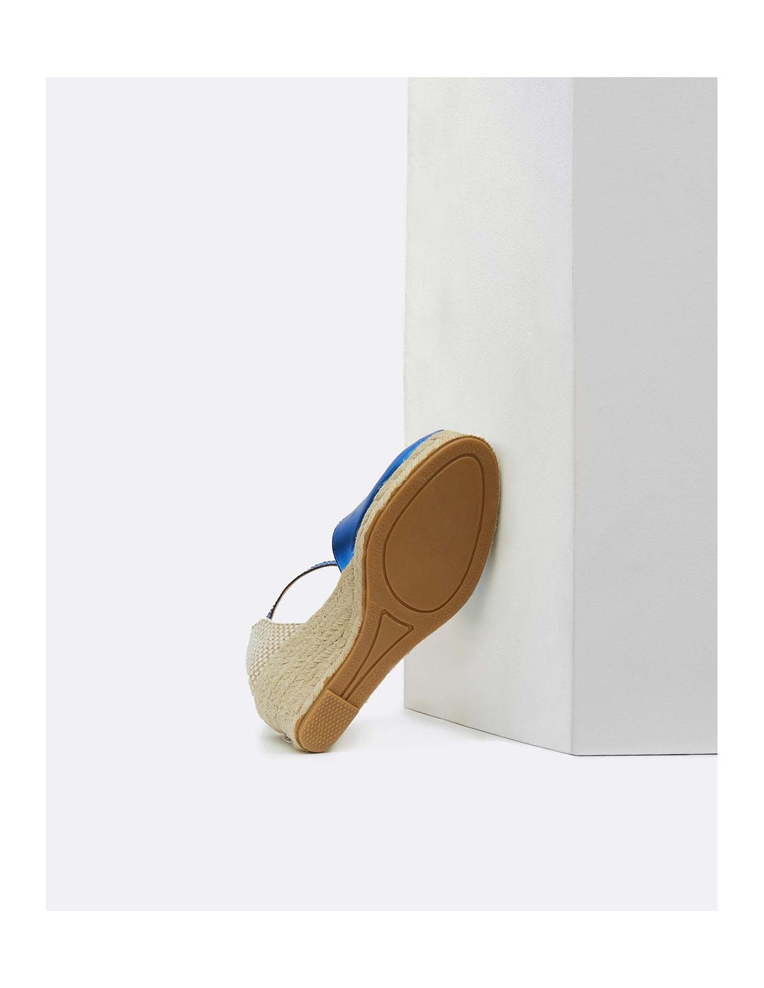 Cuña yute, en color azul eléctrico, detalle de pulsera tobillera y plataforma alta. Ideales para darle un toque de color a tu outfit.