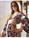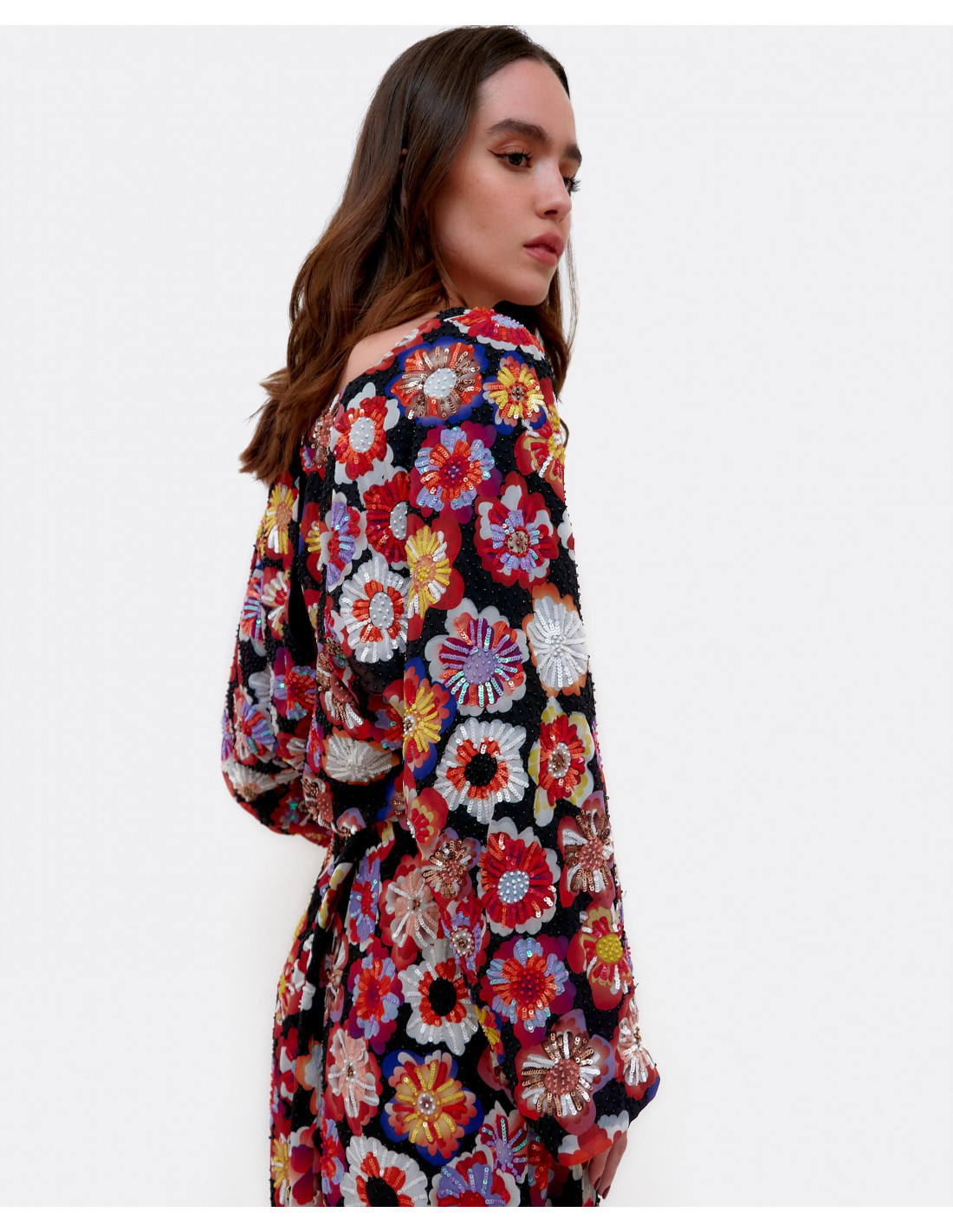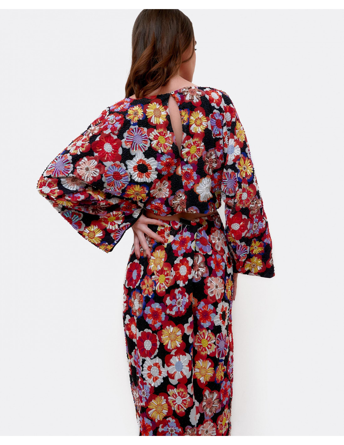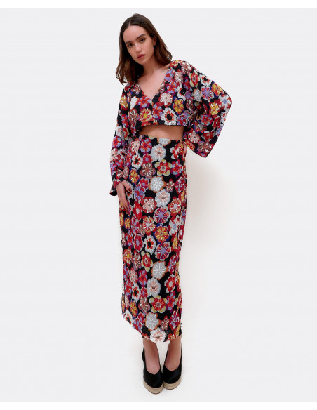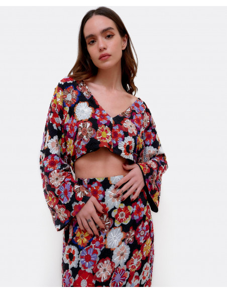 Top negro con estampado floral y pedrería que le aporta color de escote en V y mangas largas con un final acampanado que es ideal para combinar con nuestra falda tubo del mismo estampado y crear un total look perfecto para tus eventos.