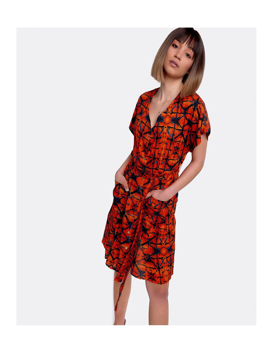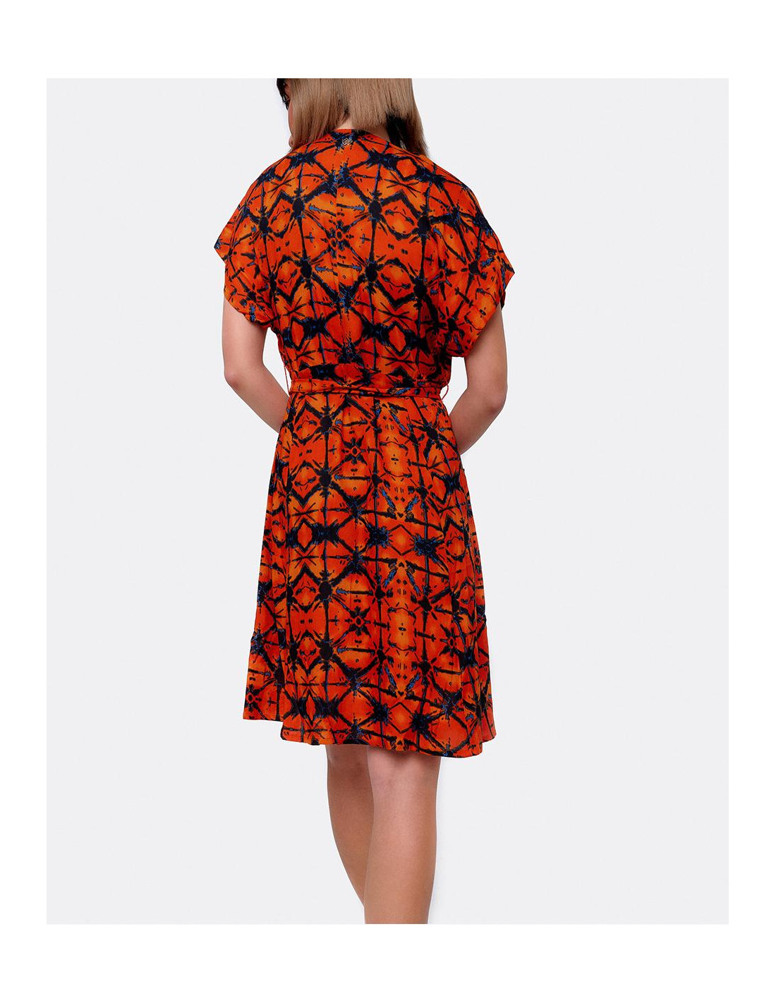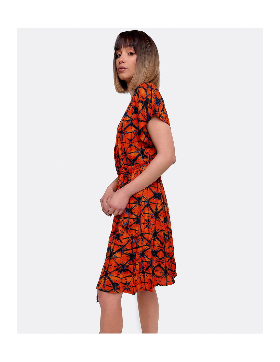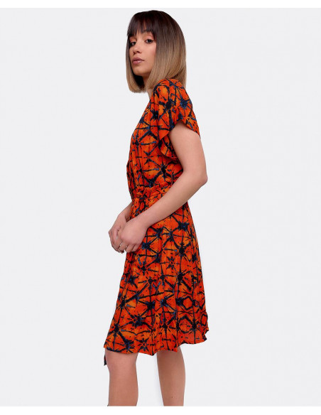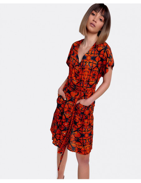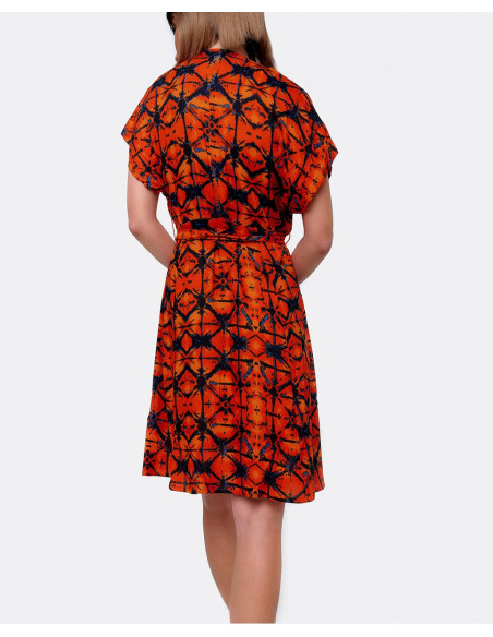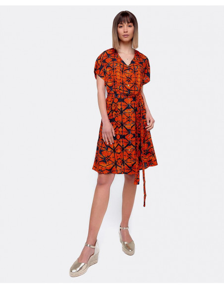 Vestido mini con escote en forma de V y manga corta. Confeccionado en viscosa naranja con estampado geométrico. Se ciñe a la cintura con un cinturon a juego que se puede anudar.