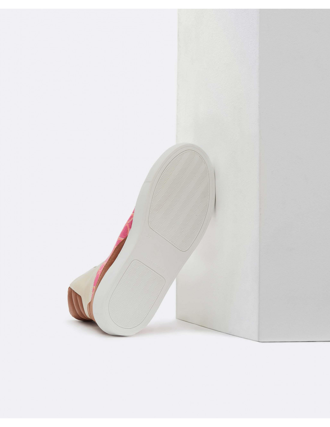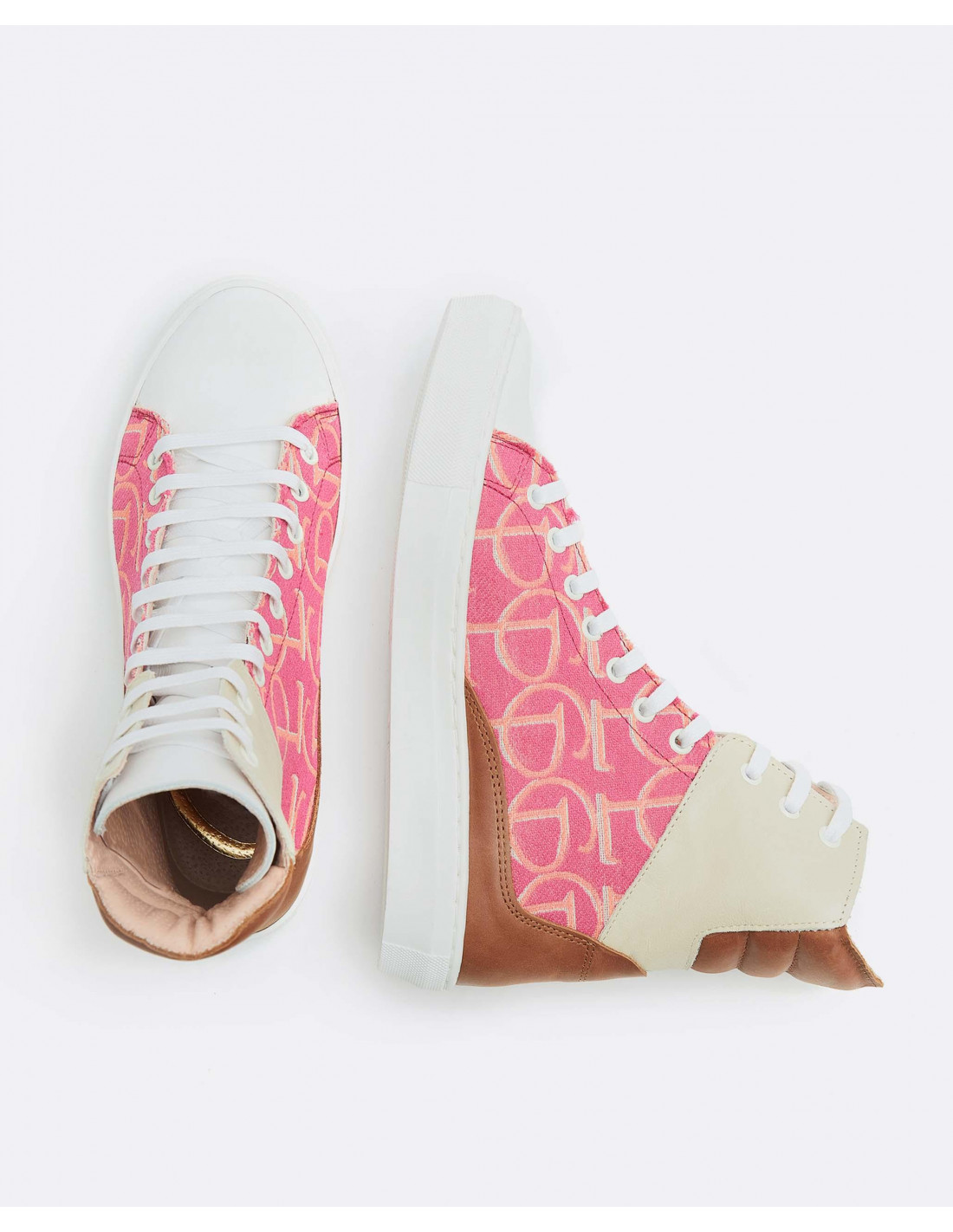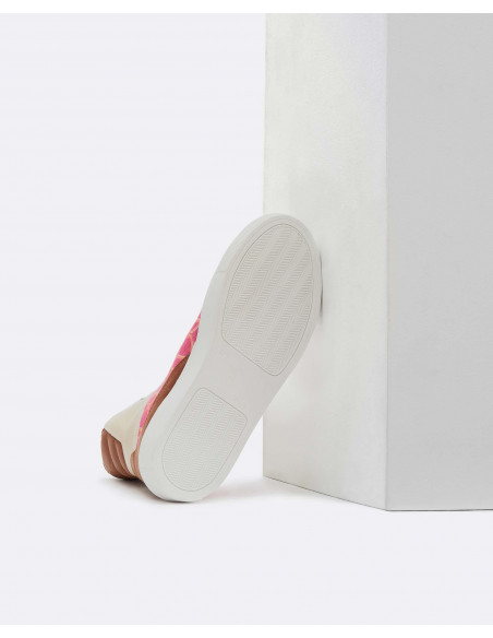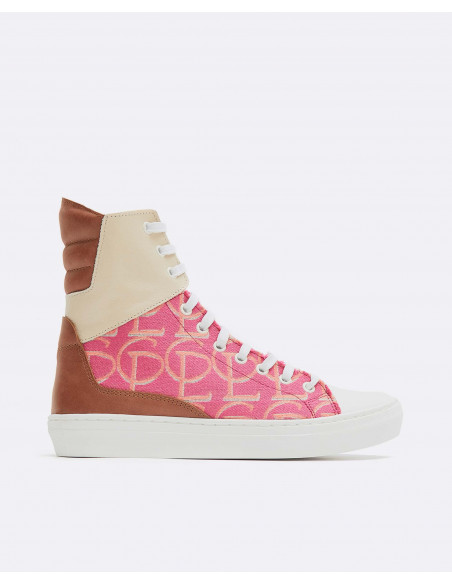 Deportiva caña alta bicolor rosa-camel, estampado Jacquard CLP con detalles en serraje y cordones en color blanco. Muy combinables. El toque de vitalidad perfecto para tu armario.