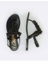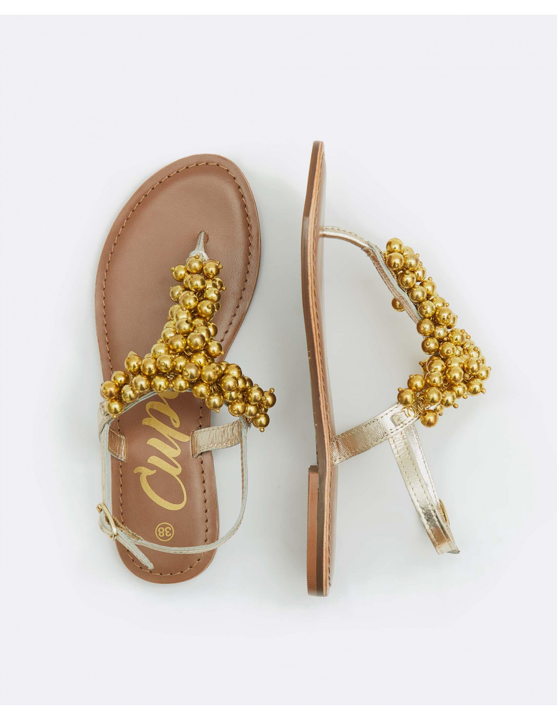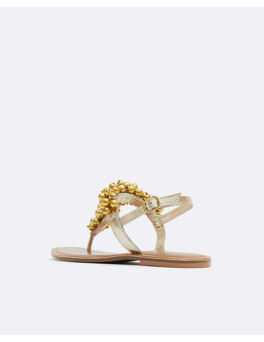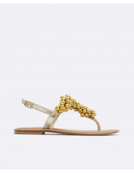 Sandalias napa doradas, con detalles de bolas y pedrería en color oro. Muy cómodas y perfectas para llevar este verano.