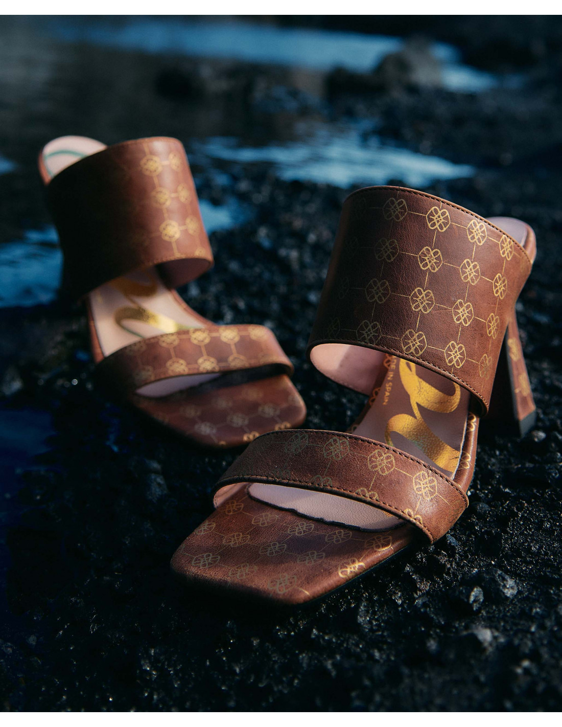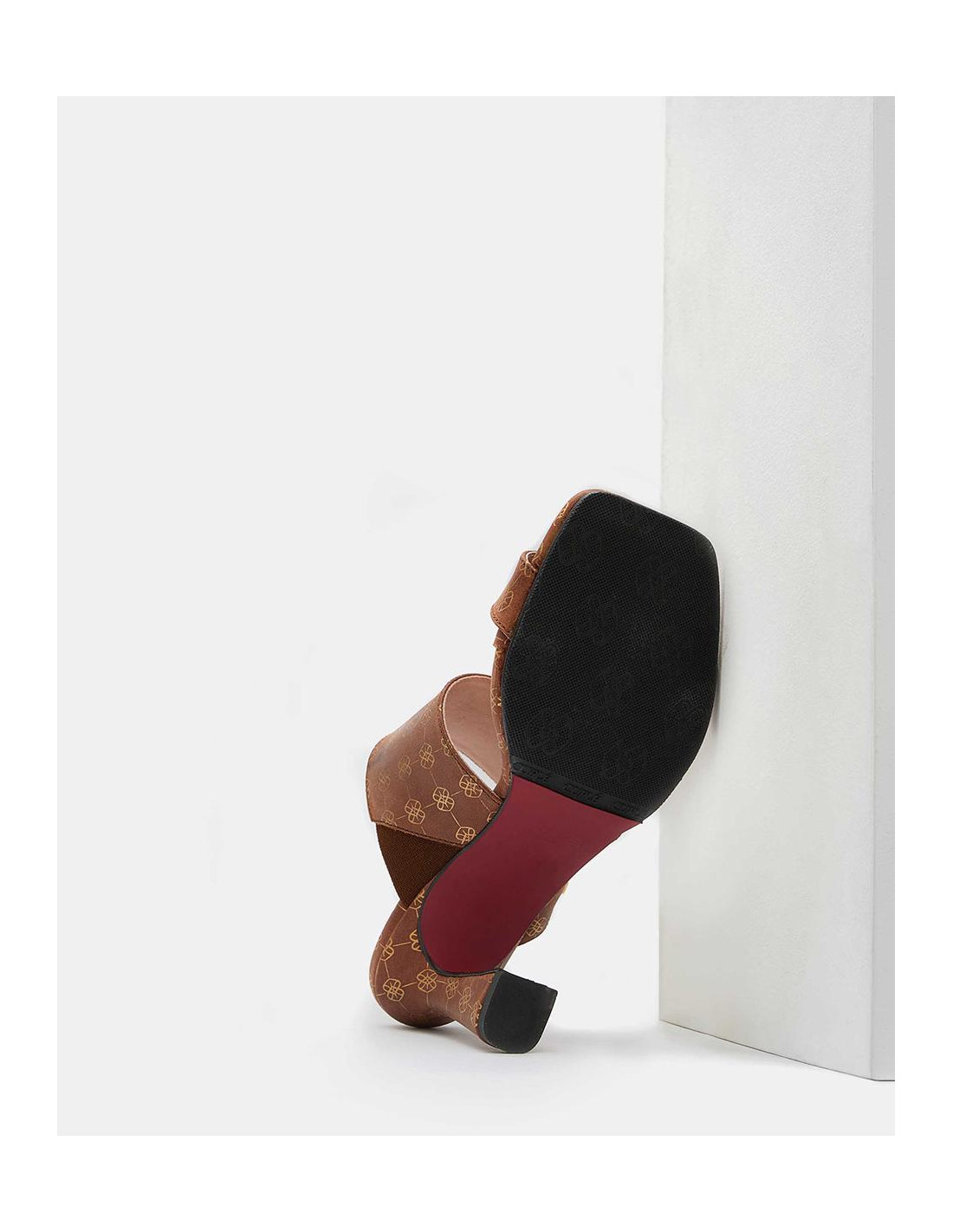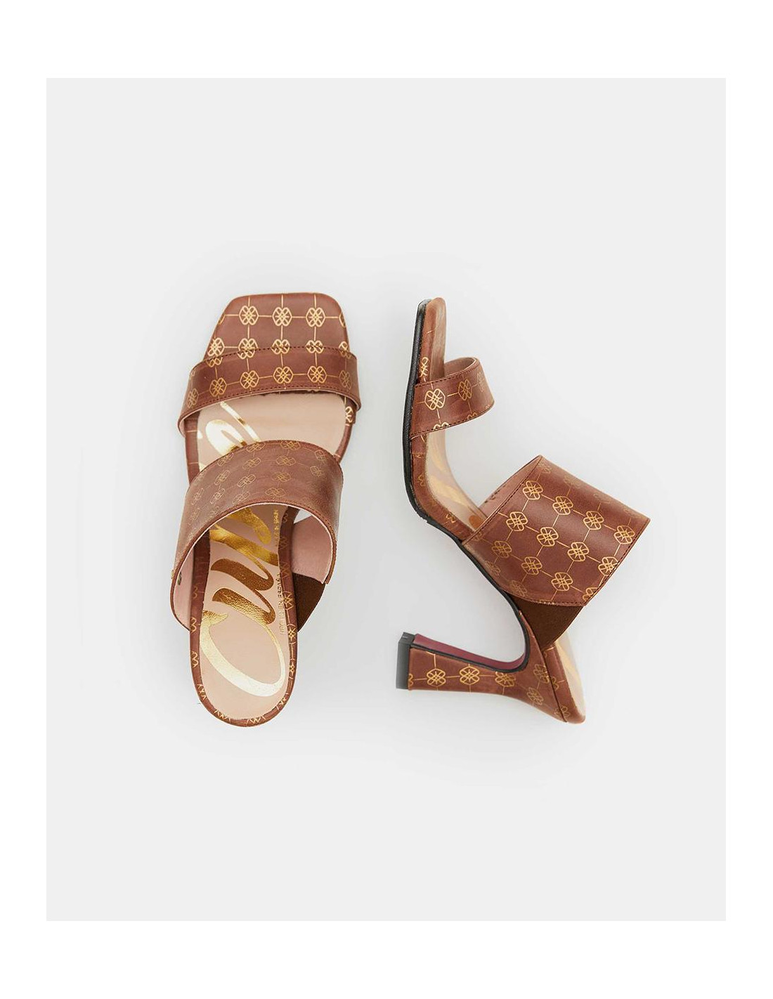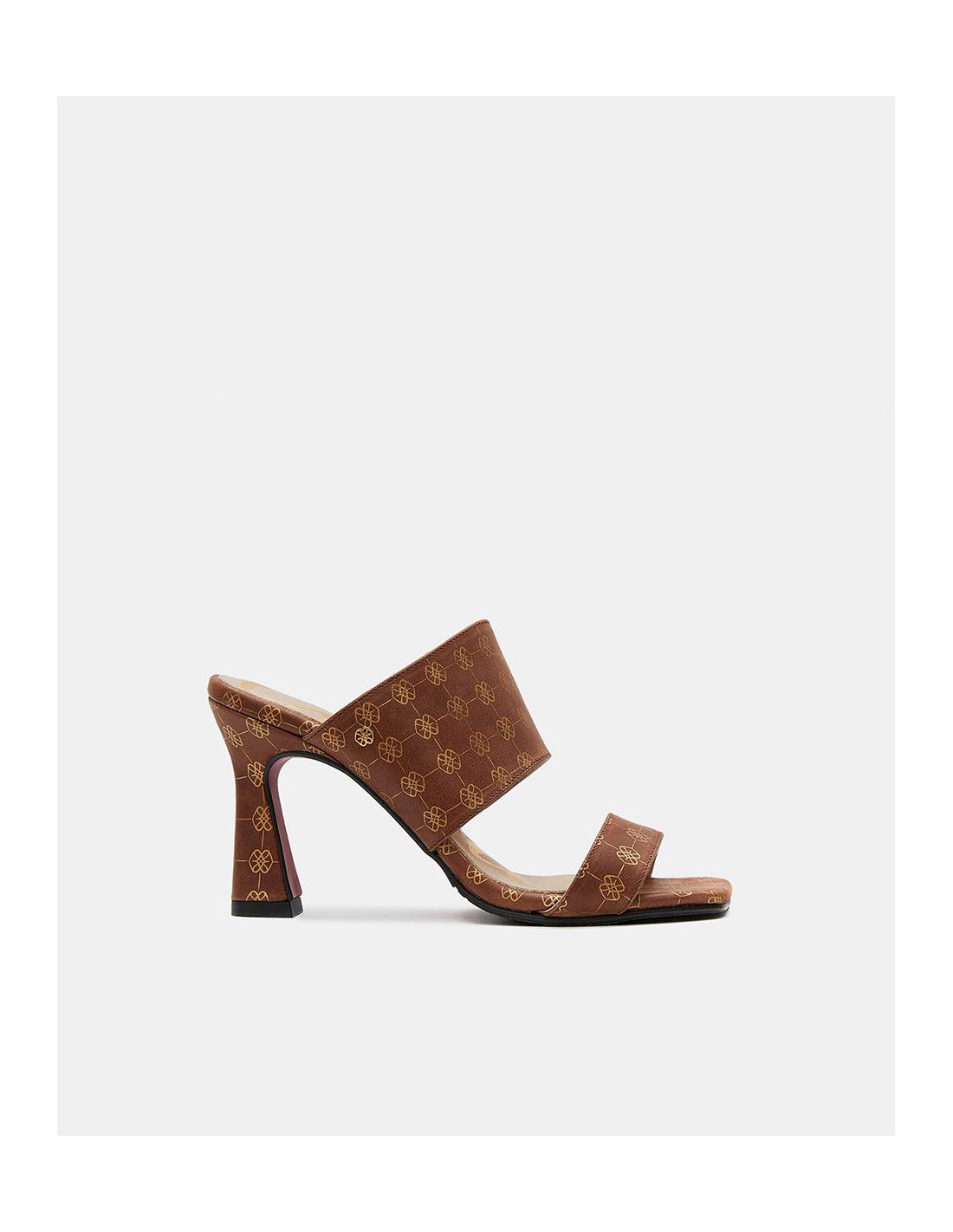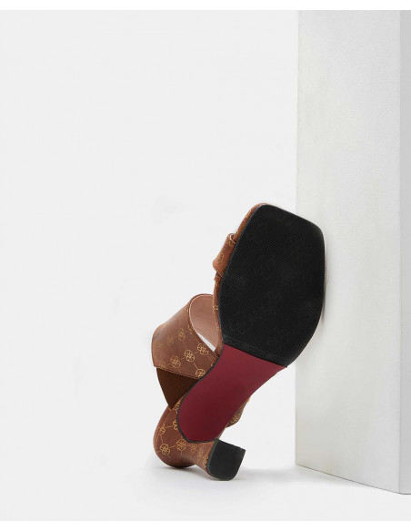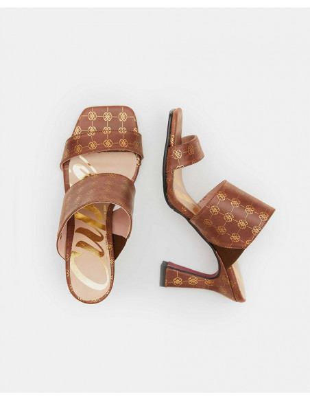 Sandalia de elegante tacón campana destalonado, en color camel con estampado del logotipo Cuplé en beige. Con una tira ancha de sujeción al empeine.
