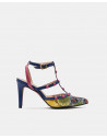 Tacón destalonado estilo T-Bar, con estampado y detalles en rosa fucsia, cierre de hebilla. El zapato ideal para conbinar con tus vestidos tubo o trajes.