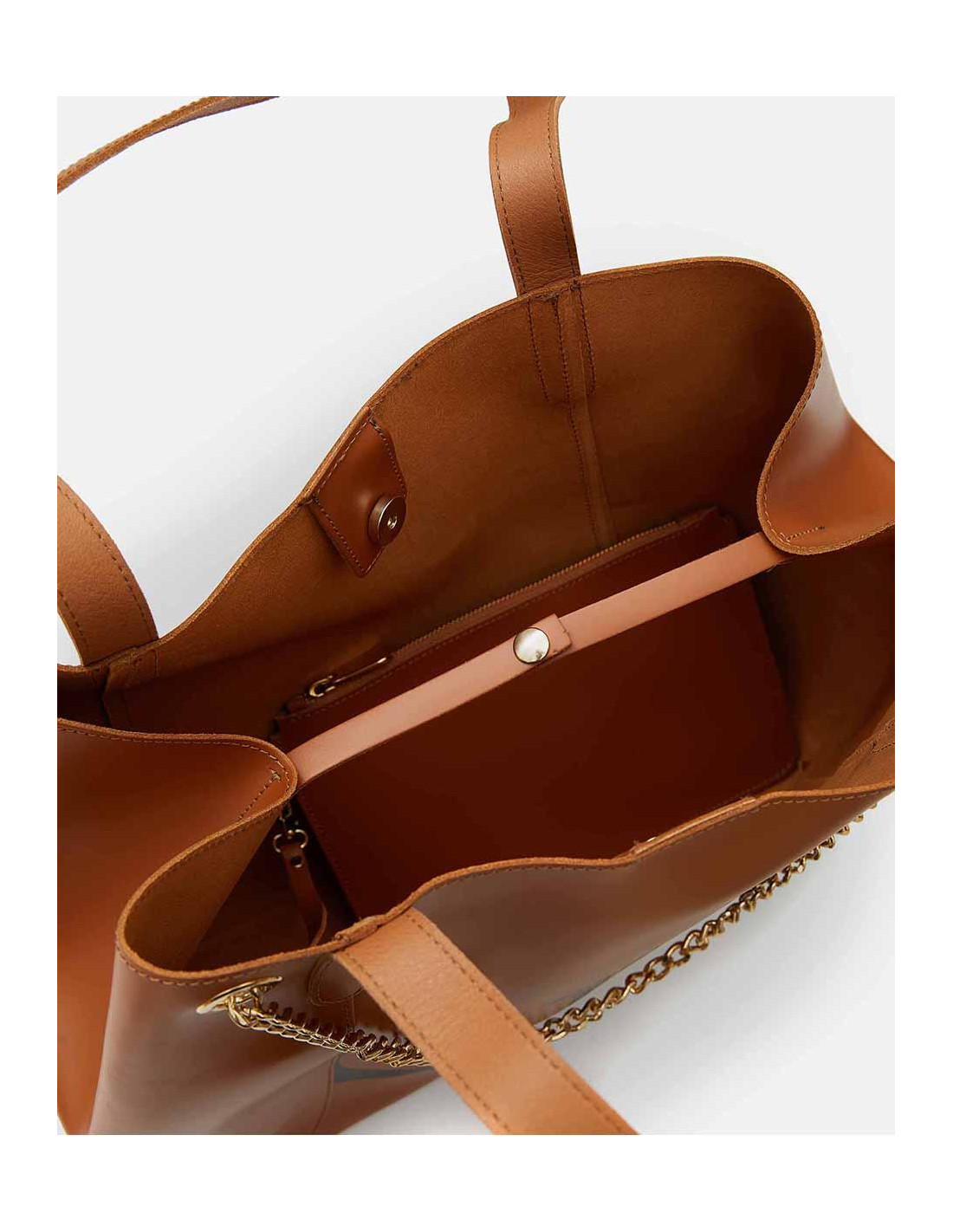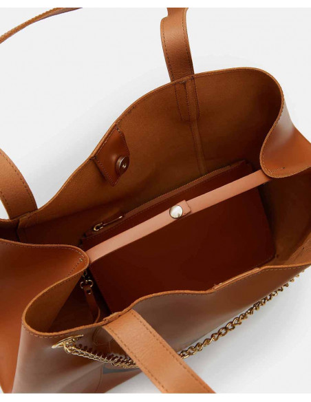 Bolso estilo shopper confeccionado en piel de color camel para cuerpo y asas, con detalle de cadena dorada y letras de la marca de color negro a contraste.