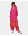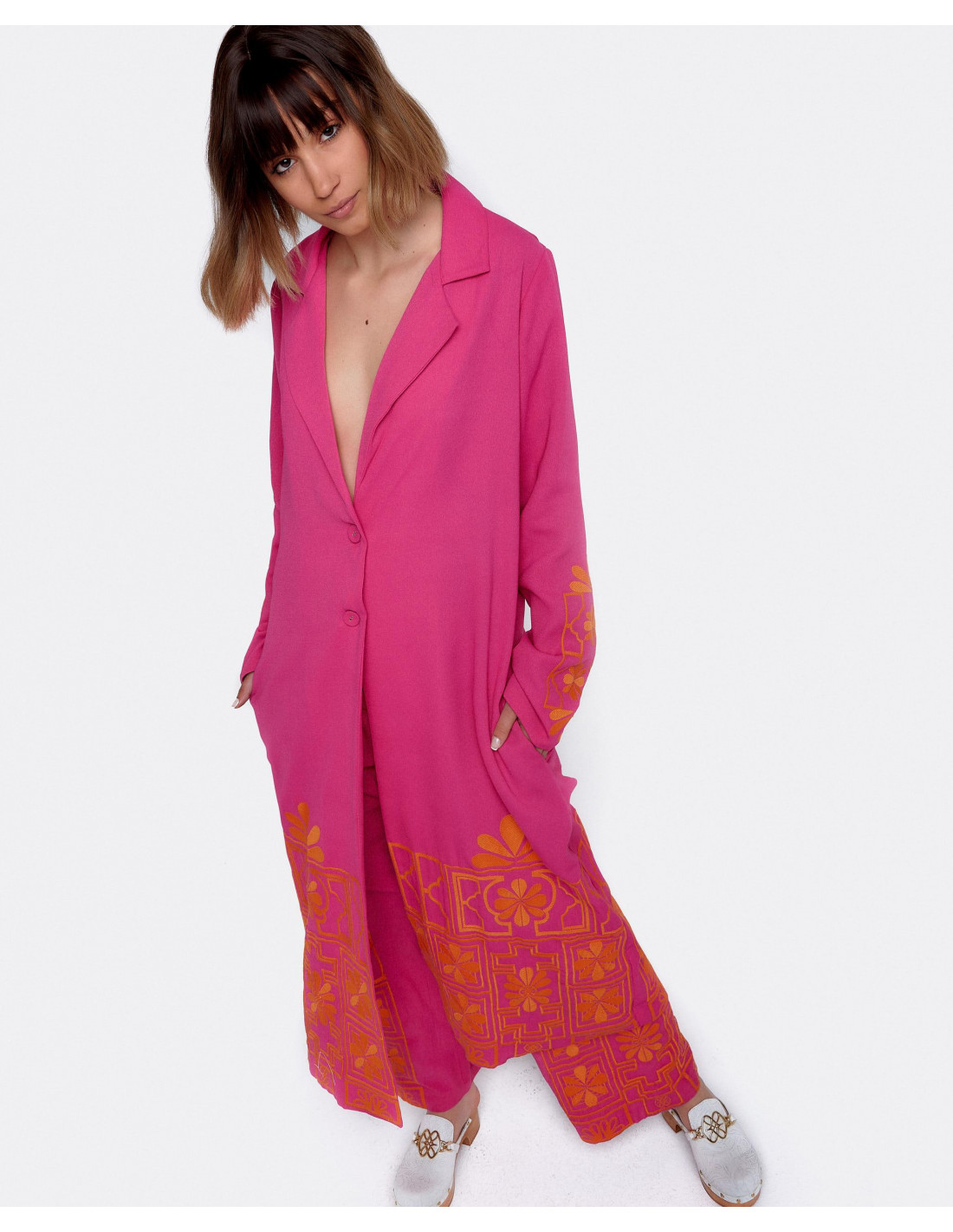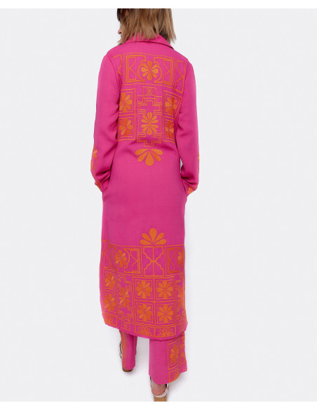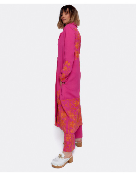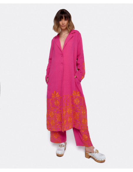 CHAQUETA LARGA BORDADO ALGODON FUCSIA