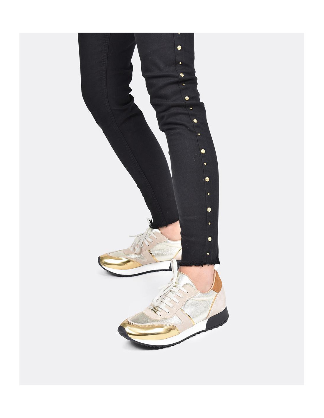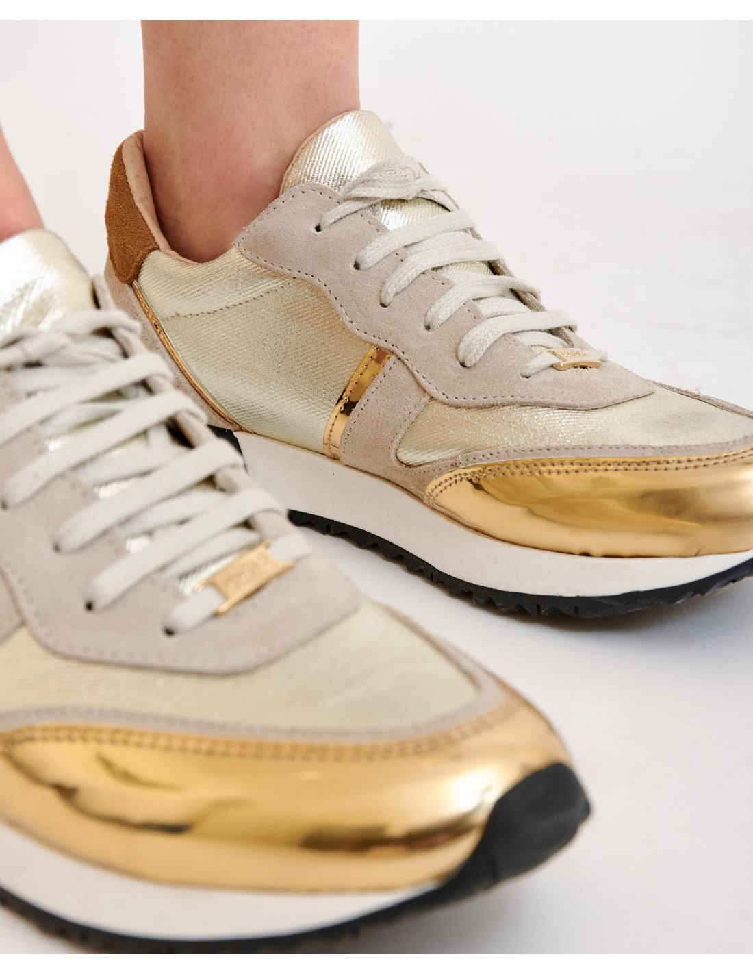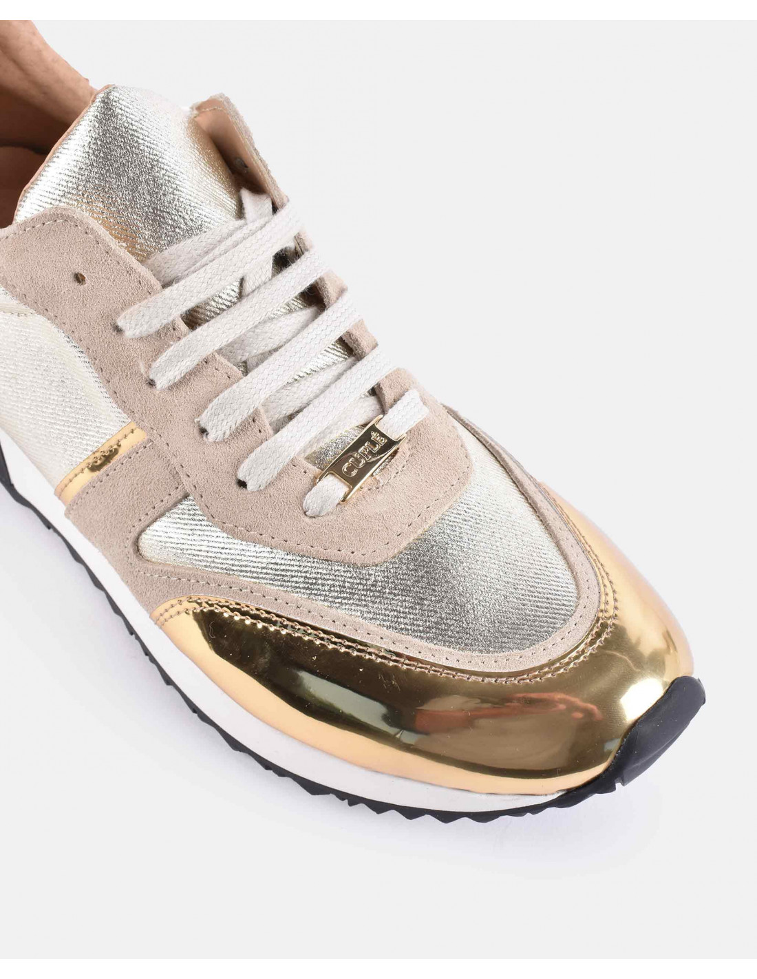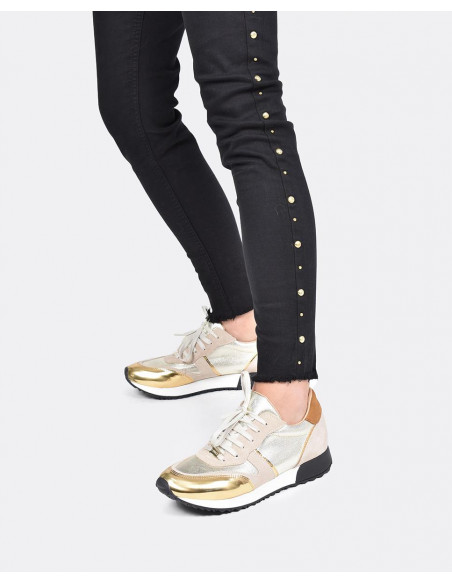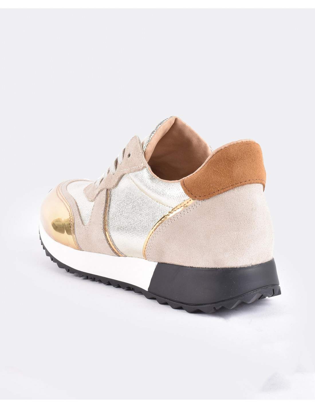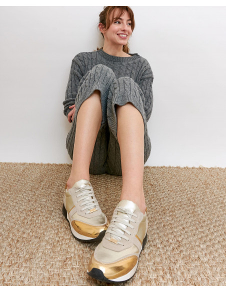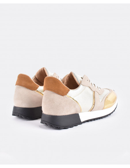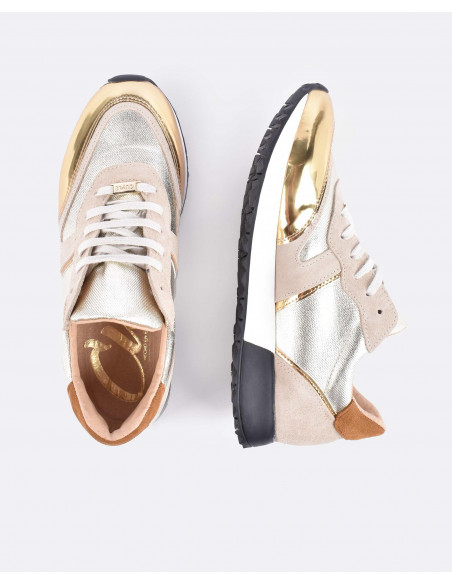Deportiva básica de Cuplé de color blanco. Modelo para tu día a día ir a la moda y con tus deportivas mas trendy. Con piezas de napa combinadas con tejidos metalizados. Empeine con cordón. Piso bicolor. Fabricado en España.