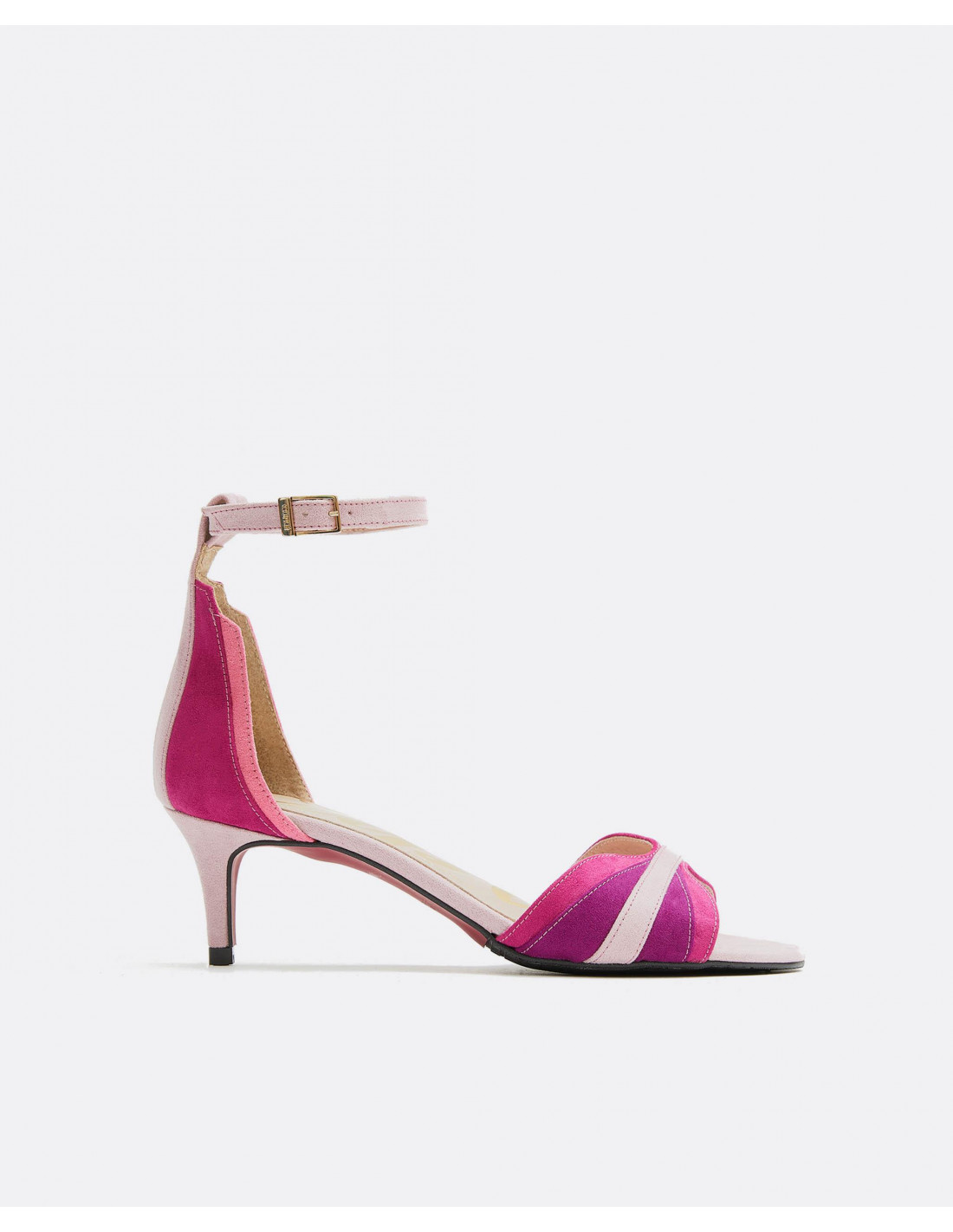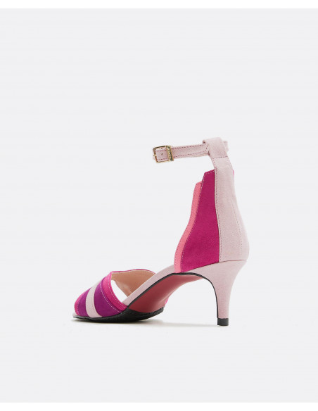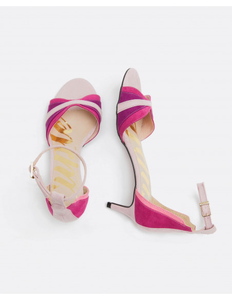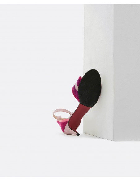 Sandalias geométricas en color platino, detalles en color fresón y rosa. Con tacón de 4,5 cm y detalle de pulsera tobillera con sujeción mediante hebilla acabada en color dorado. Un elemento que no pasará desapercibido.