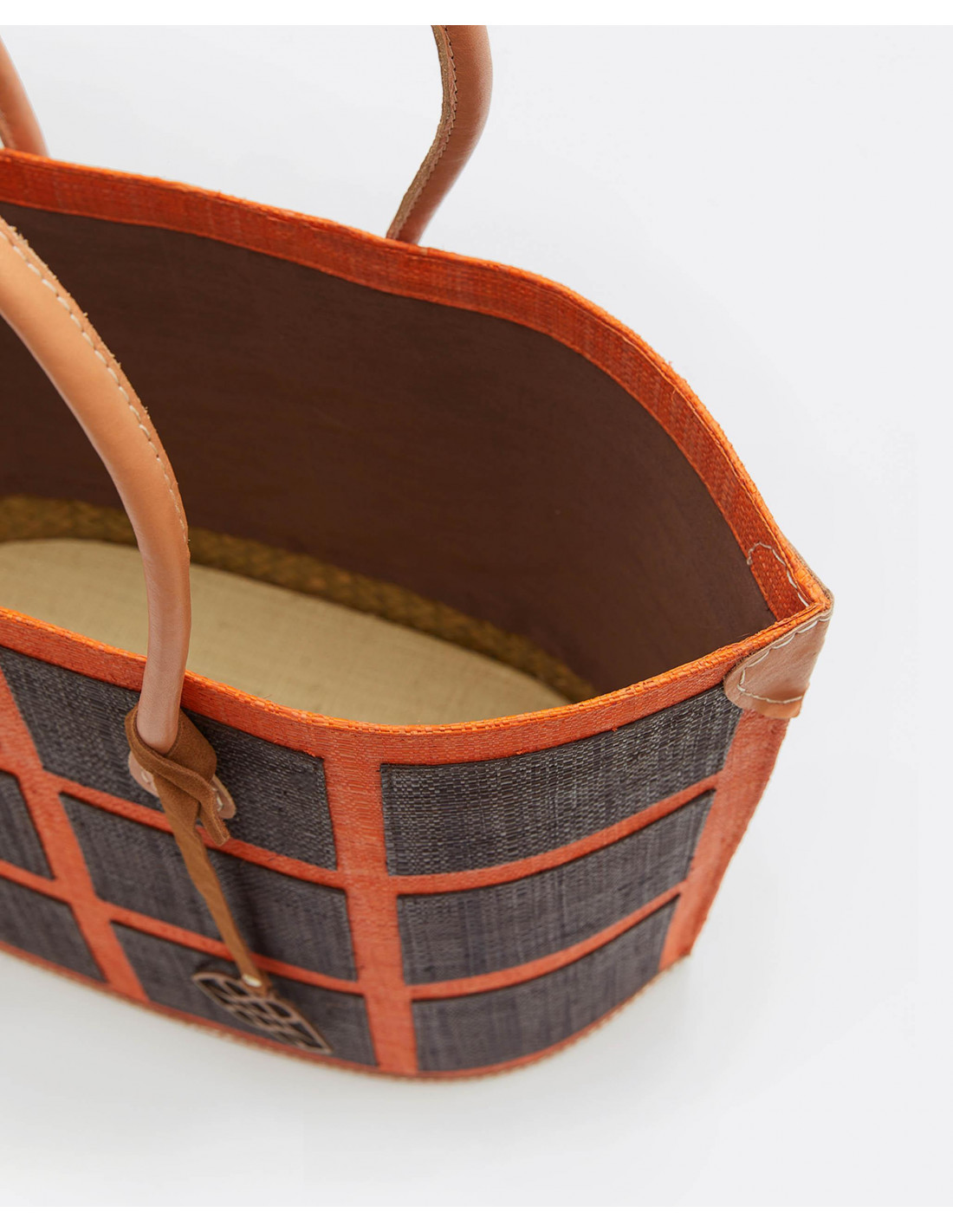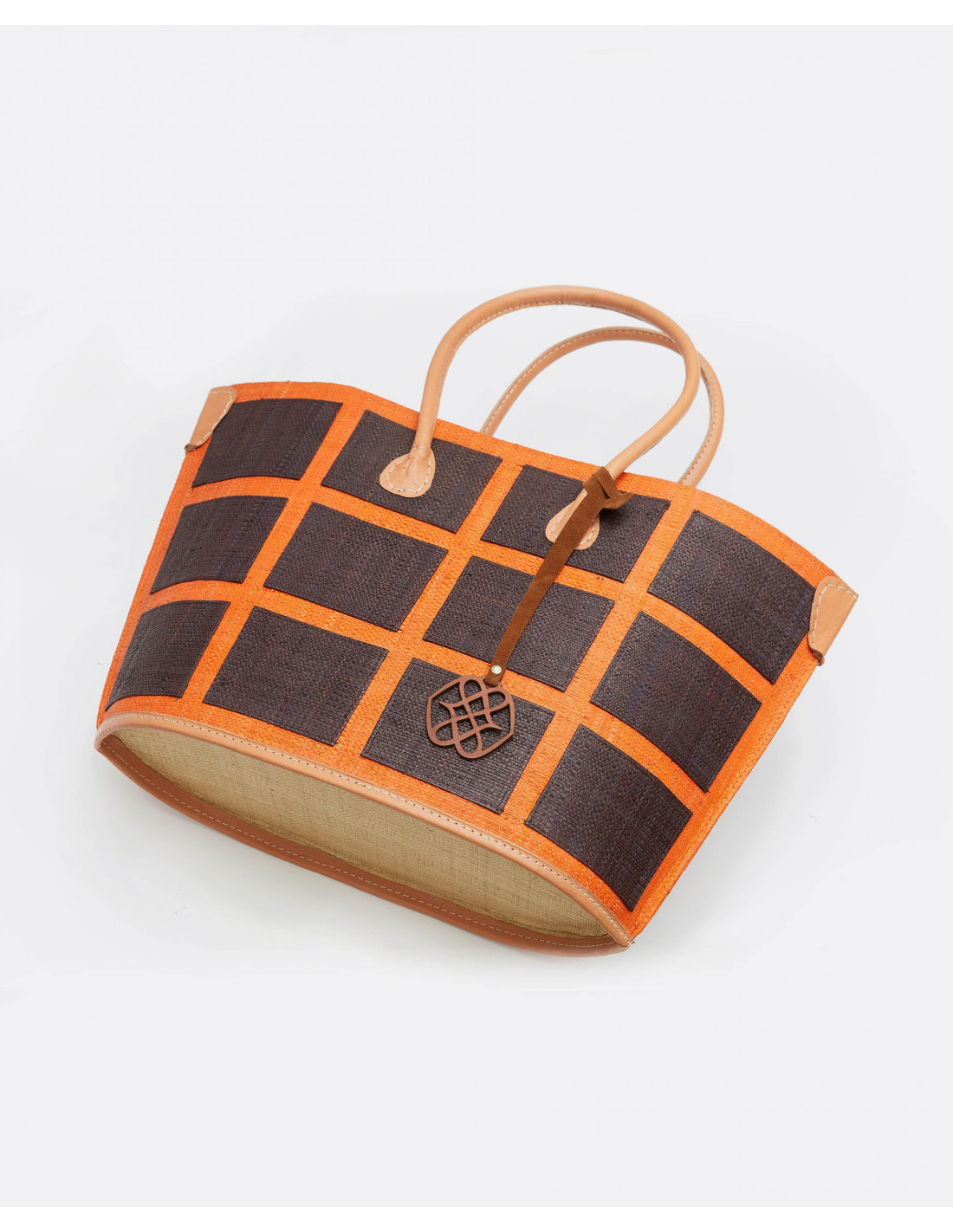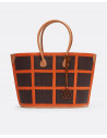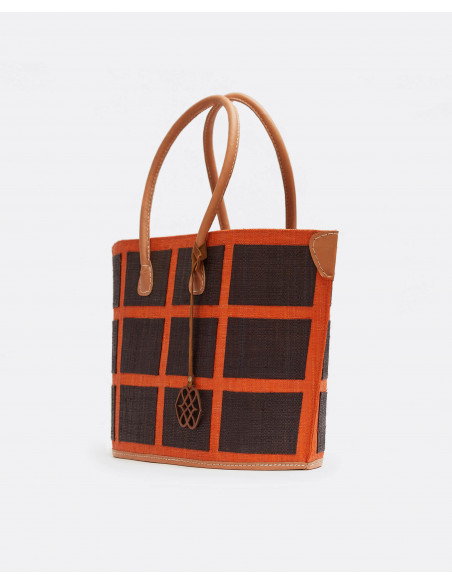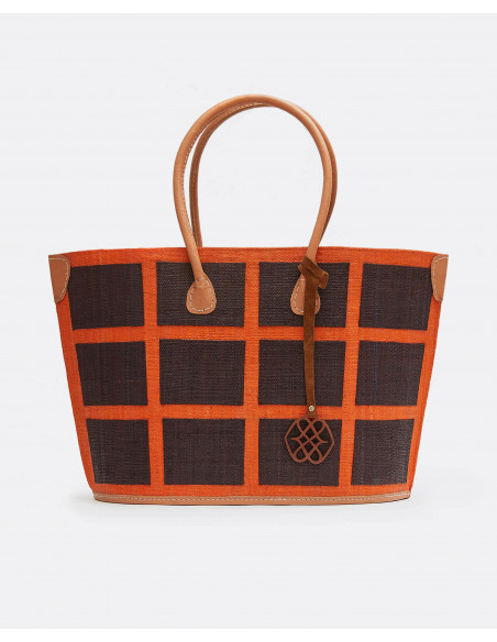 Bolso shopper de rafia naranja con cuadrdados en color marrón y asas para poder colgar cómodamente del hombro. Con detalle de cinta colgante decorativa con logo Cuplé.
