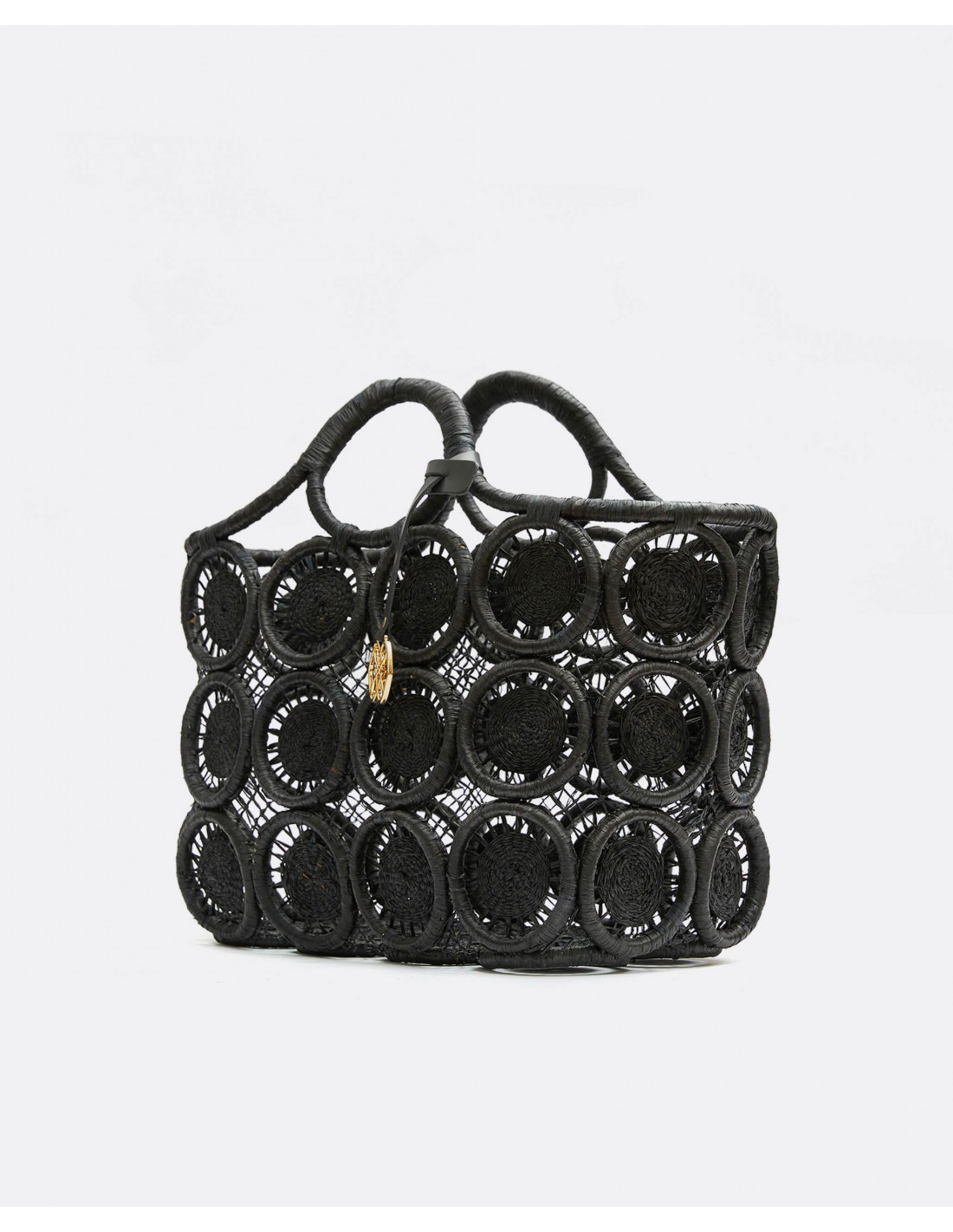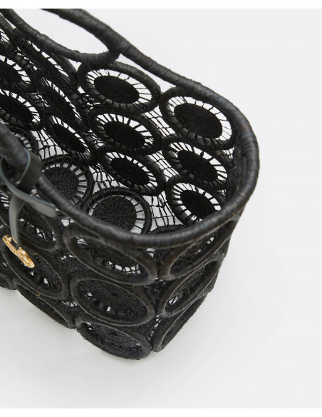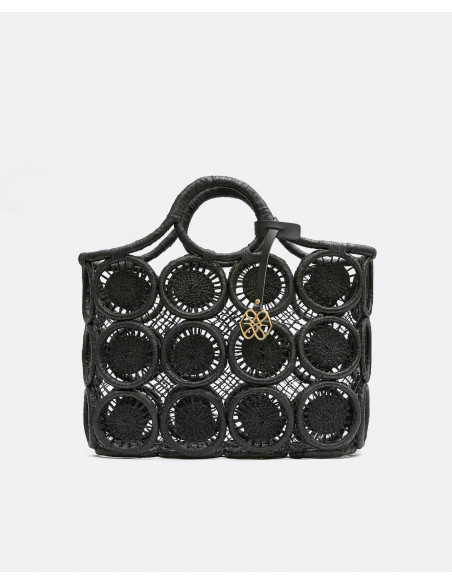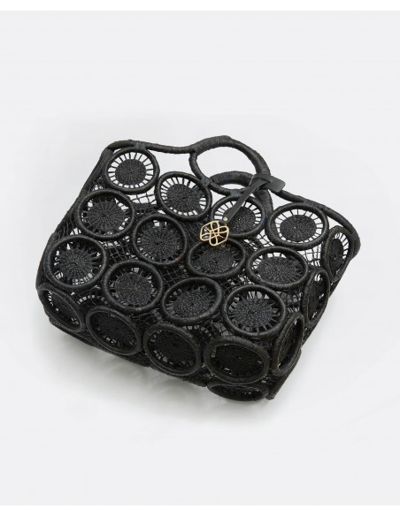 Cesta con decoración geométrica de mimbre negro con asa corta y detalle de cinta colgante decorativa color negro con logo Cuplé dorado.