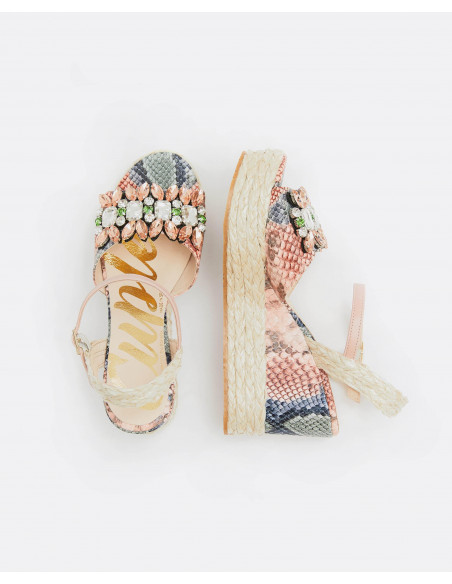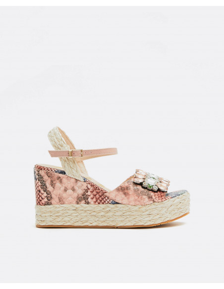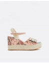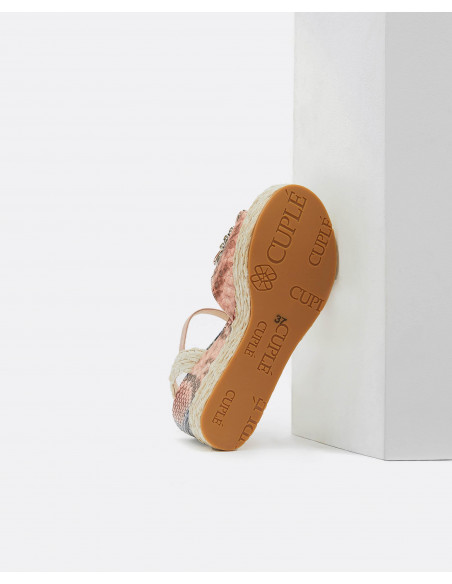 Sandalia tipo cuña con estampado de serpiente multicolor, la cuña y la correa del talón van cubiertas de yute en color beige y se ata al tobillo mediante una correa con hebilla dorada.