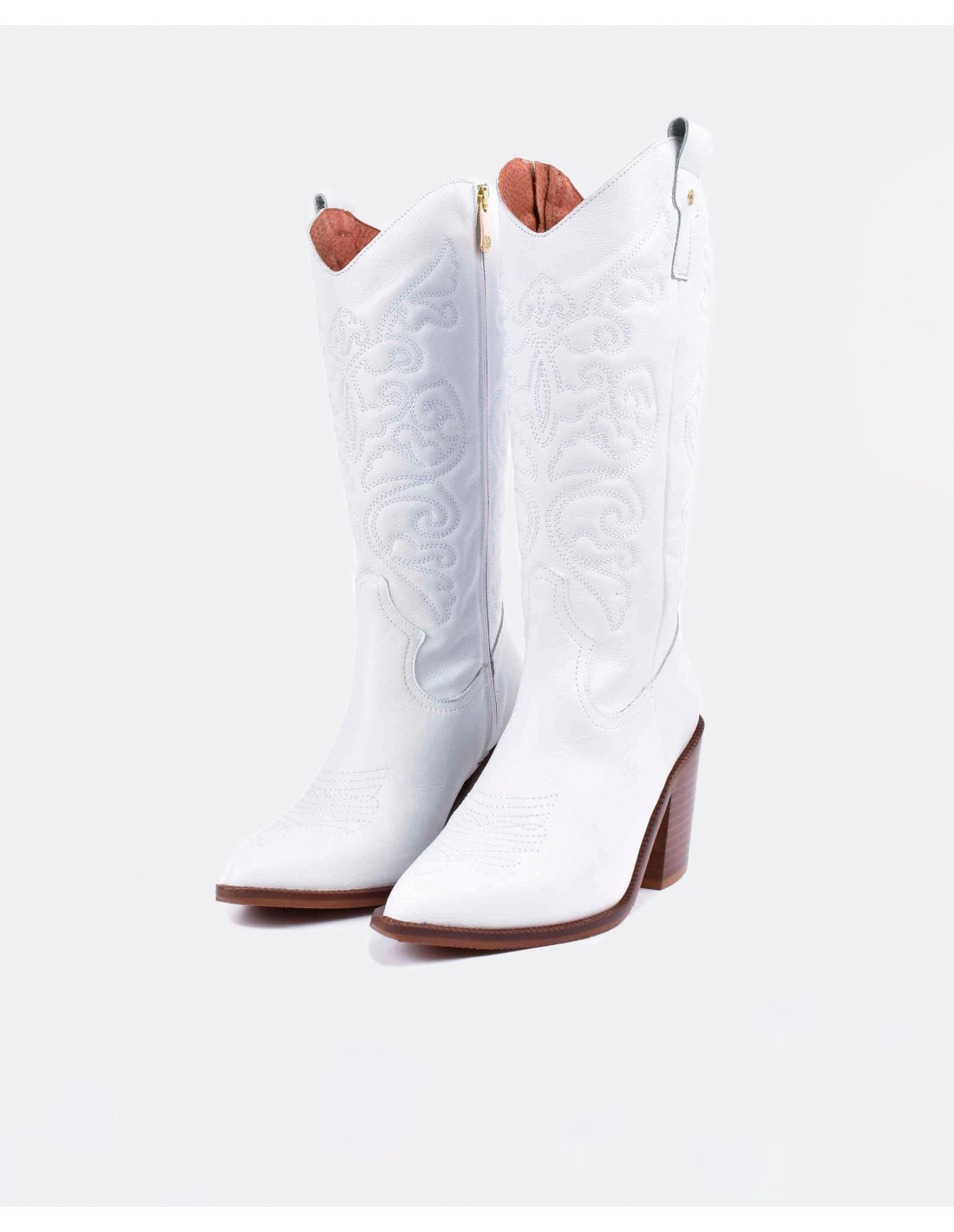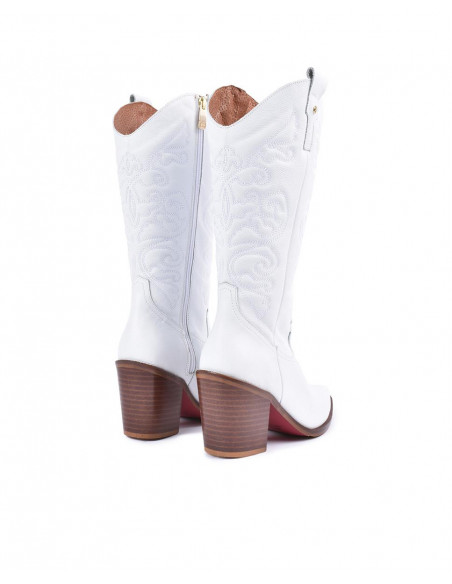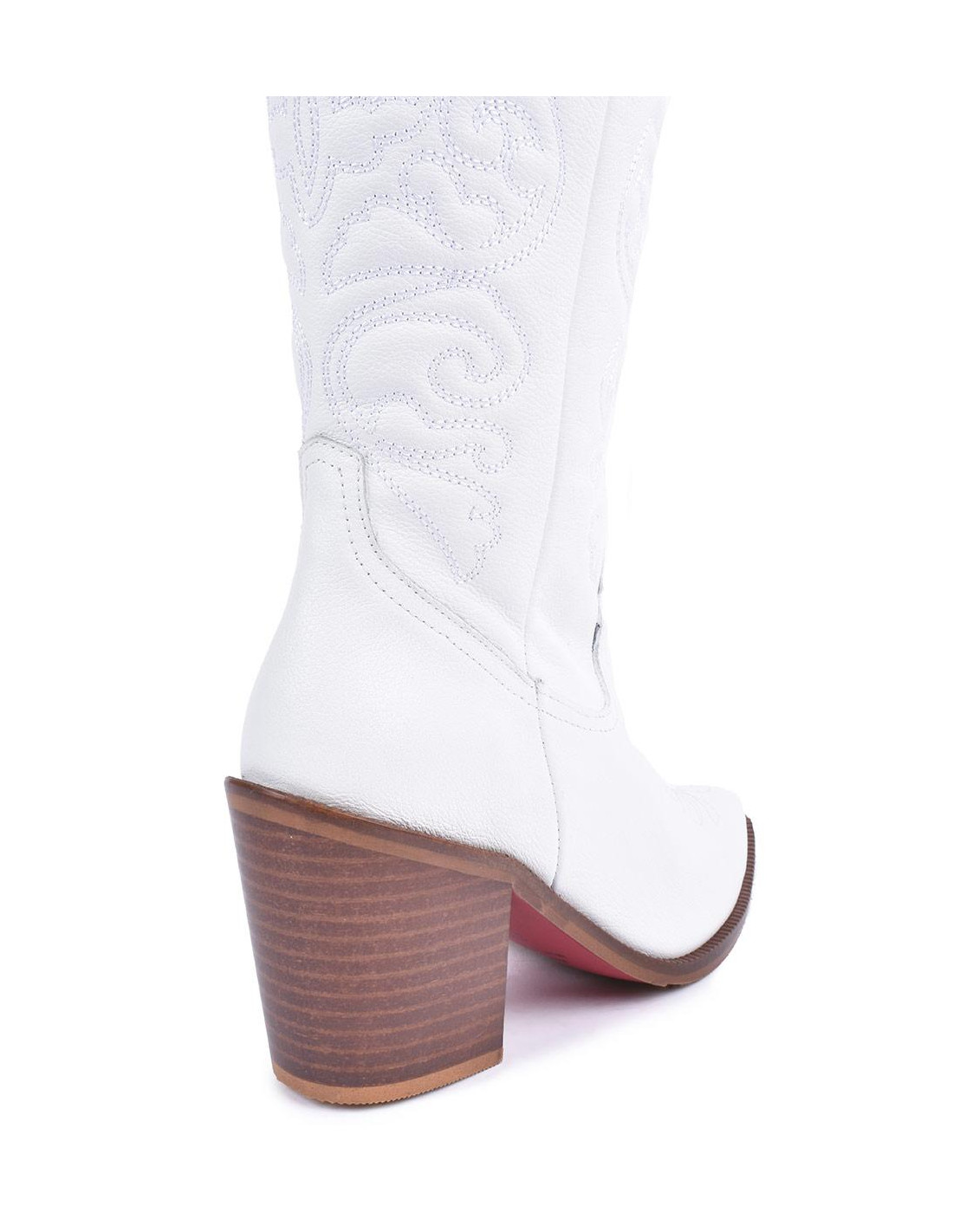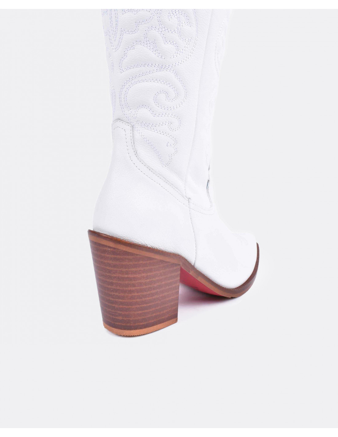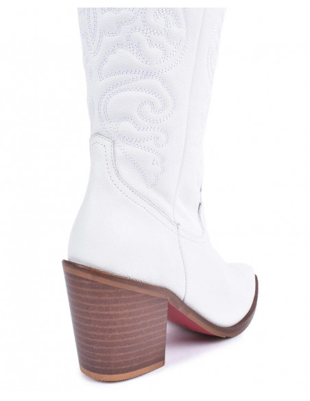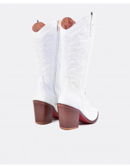 Botas cowboy en napa blanco con la suela y en tacón en marrón con acabado en punta. ¡Unete a la tendencia de las botas cowboy! Altura del tacón: 7cm.
