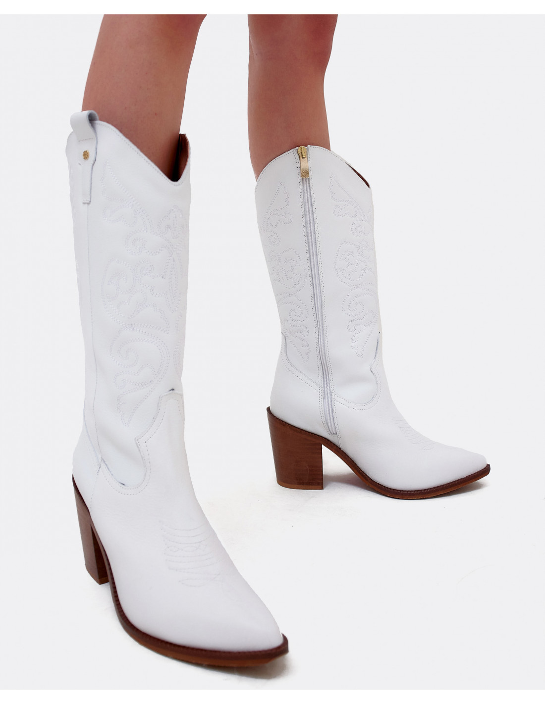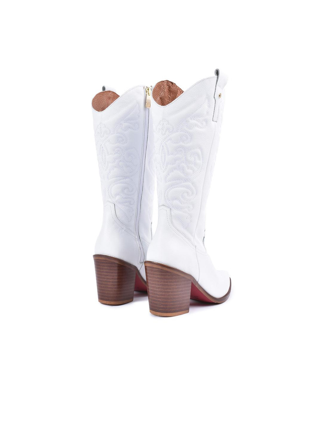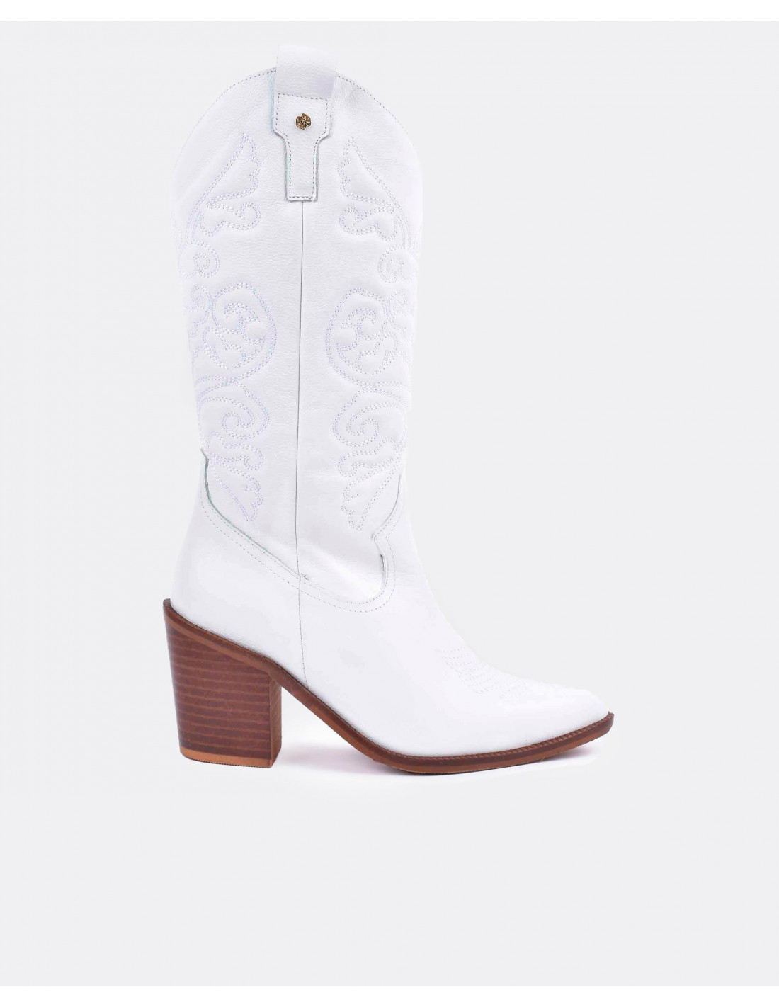 Botas cowboy en napa blanco con la suela y en tacón en marrón con acabado en punta. ¡Unete a la tendencia de las botas cowboy! Altura del tacón: 7cm.