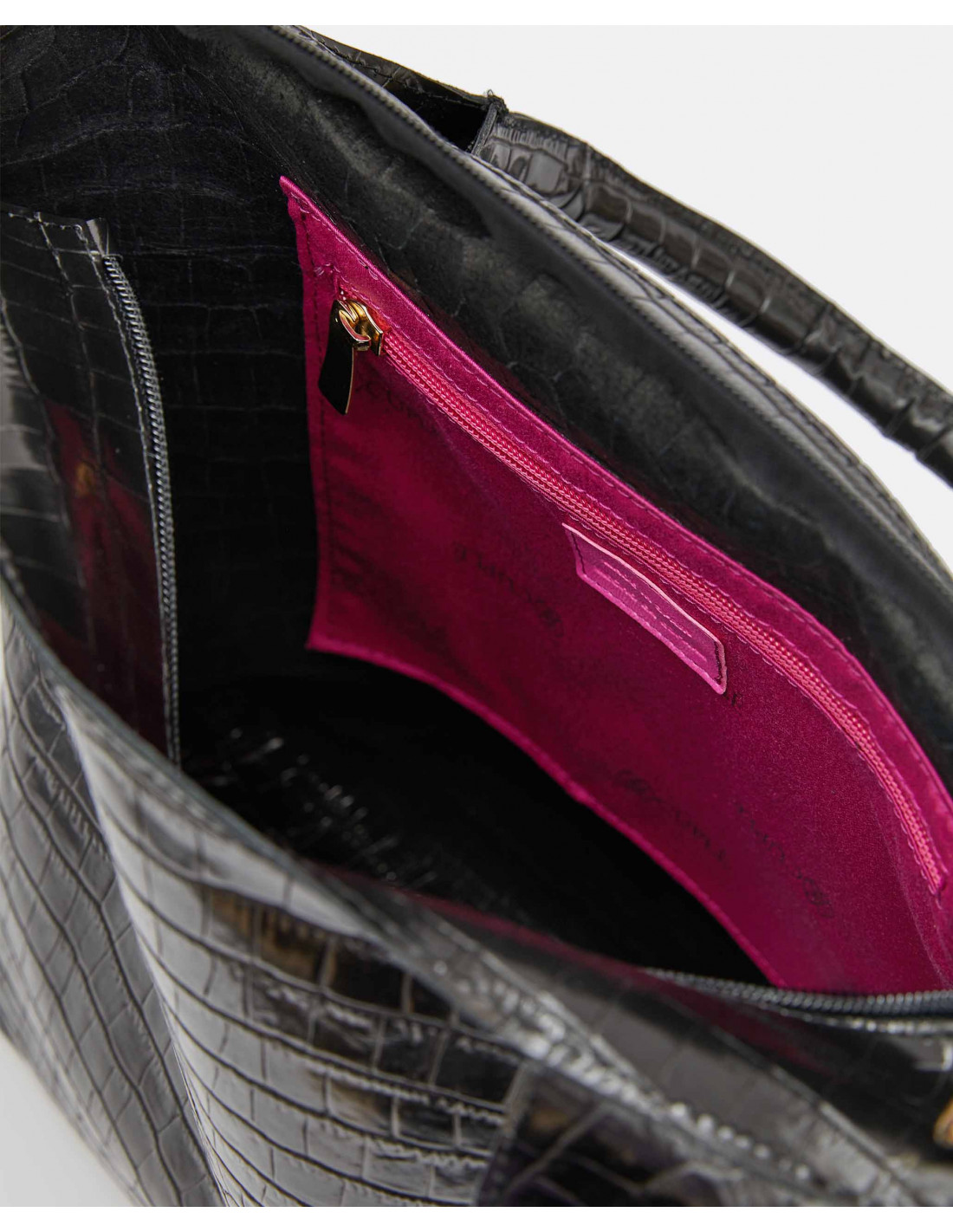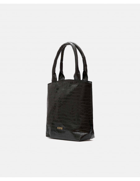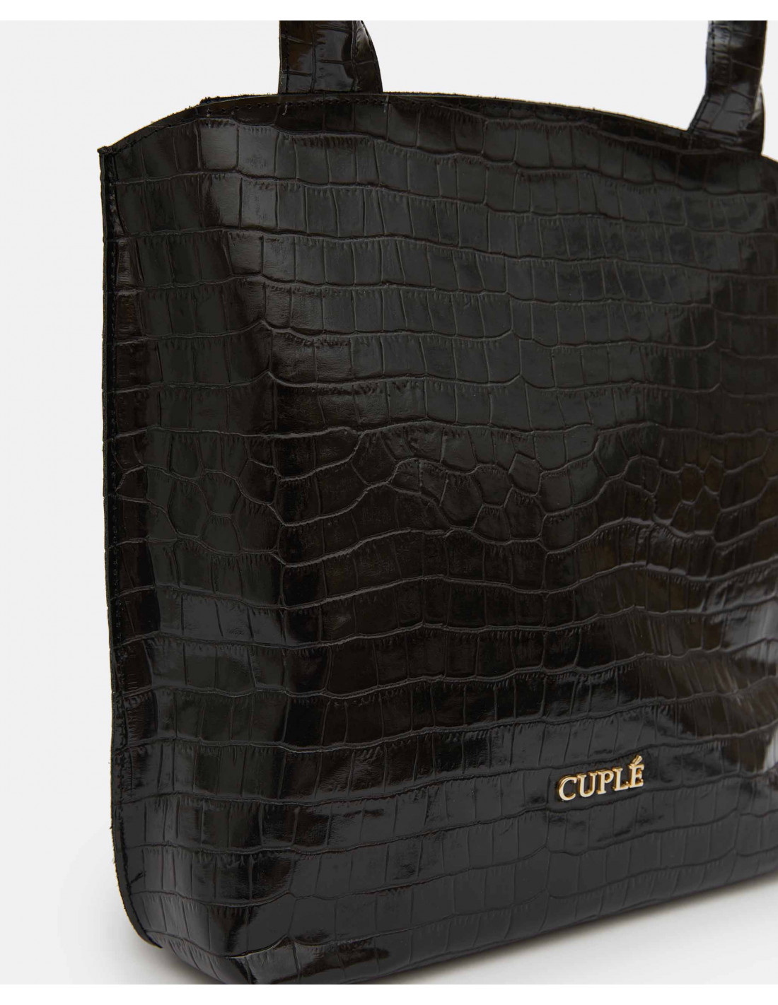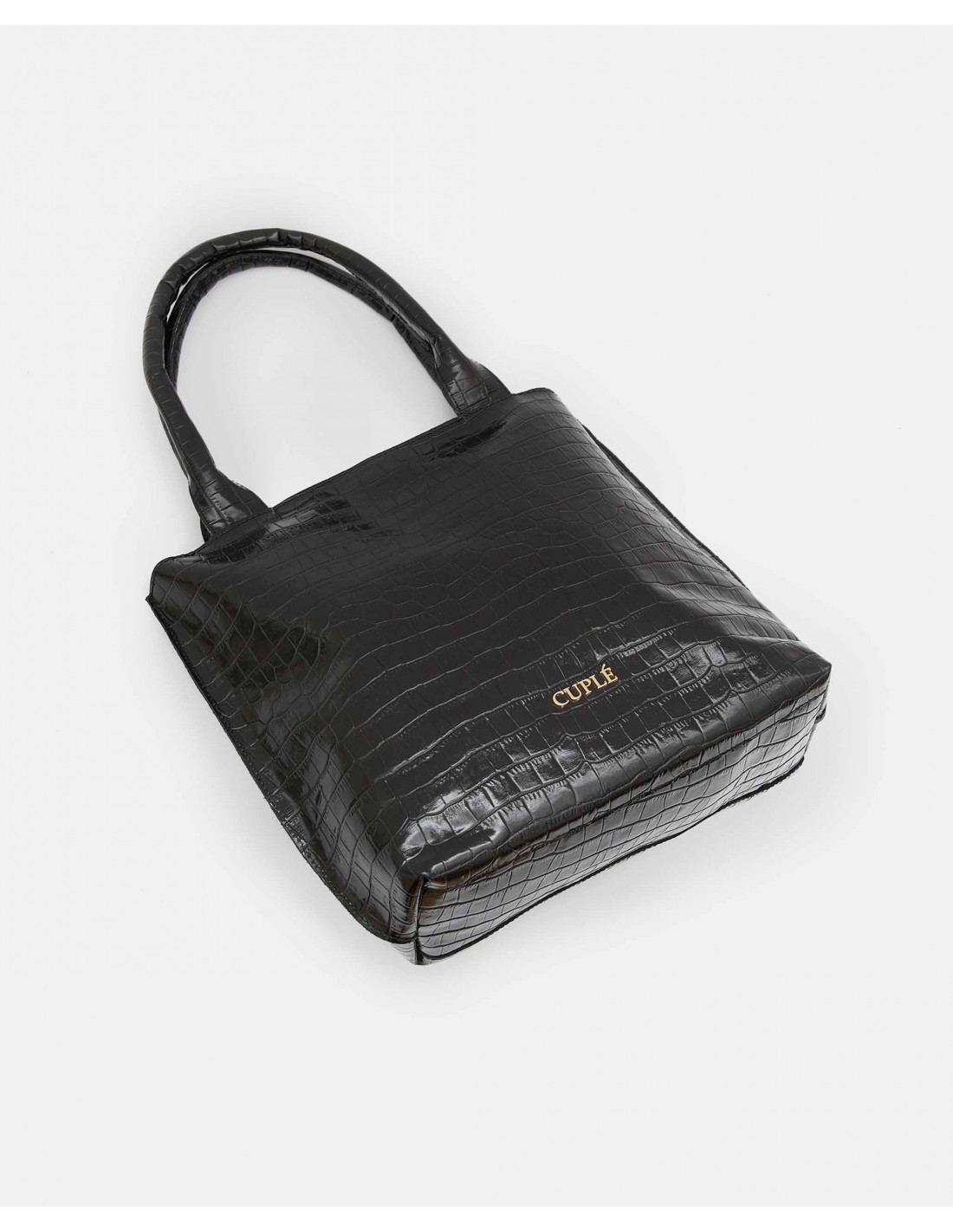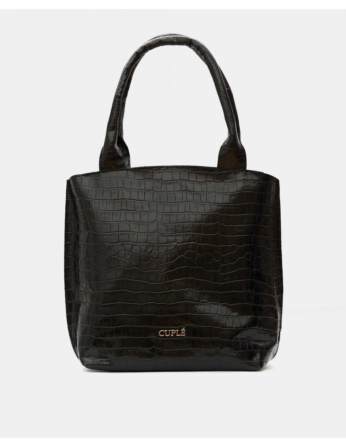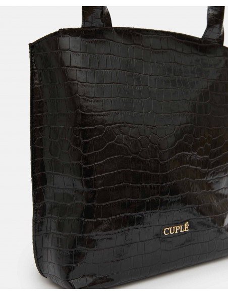 Bolso mano napa en corte de piel efecto coco color negro. Incorpora una doble asa de mano y asa al hombro quita y pon. Detalle de logo Cuplé en tira y en la parte frontal del bolso. Cierre con cremallera.
