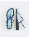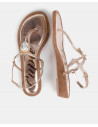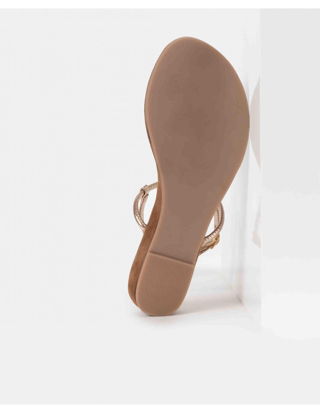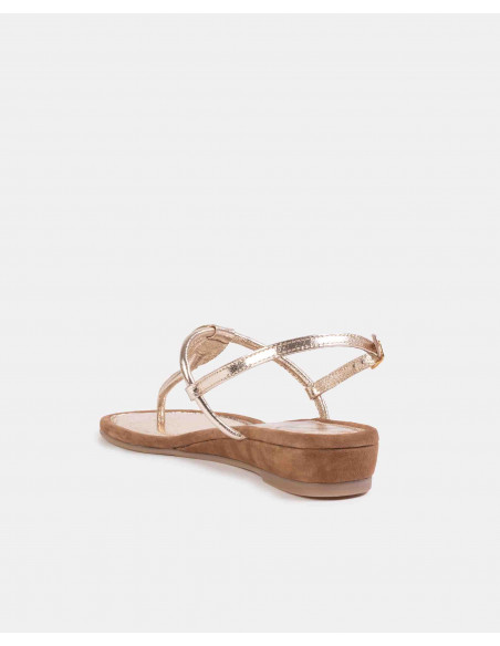 Sandalia de piel color platino y detalle brillante central insertado. Con suela de cuña color marrón y hebilla ajustable dorada para mayor sujeción.