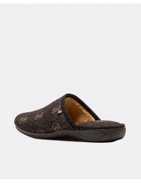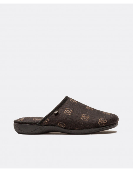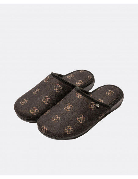 Zapatillas de estar por casa en color negro con estamapdo de logos en color marrón. Diseñadas para proporcionar el máximo confort.