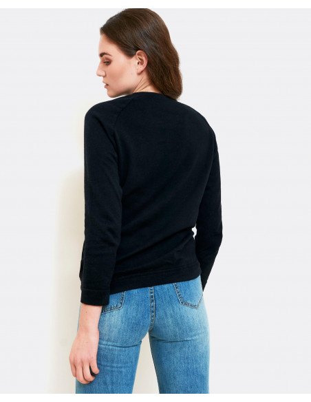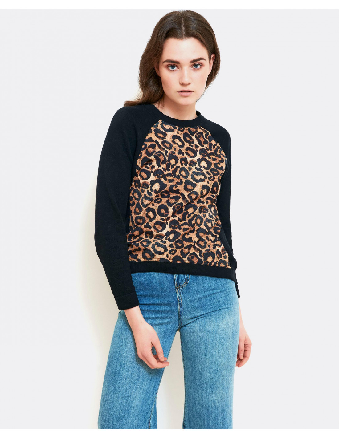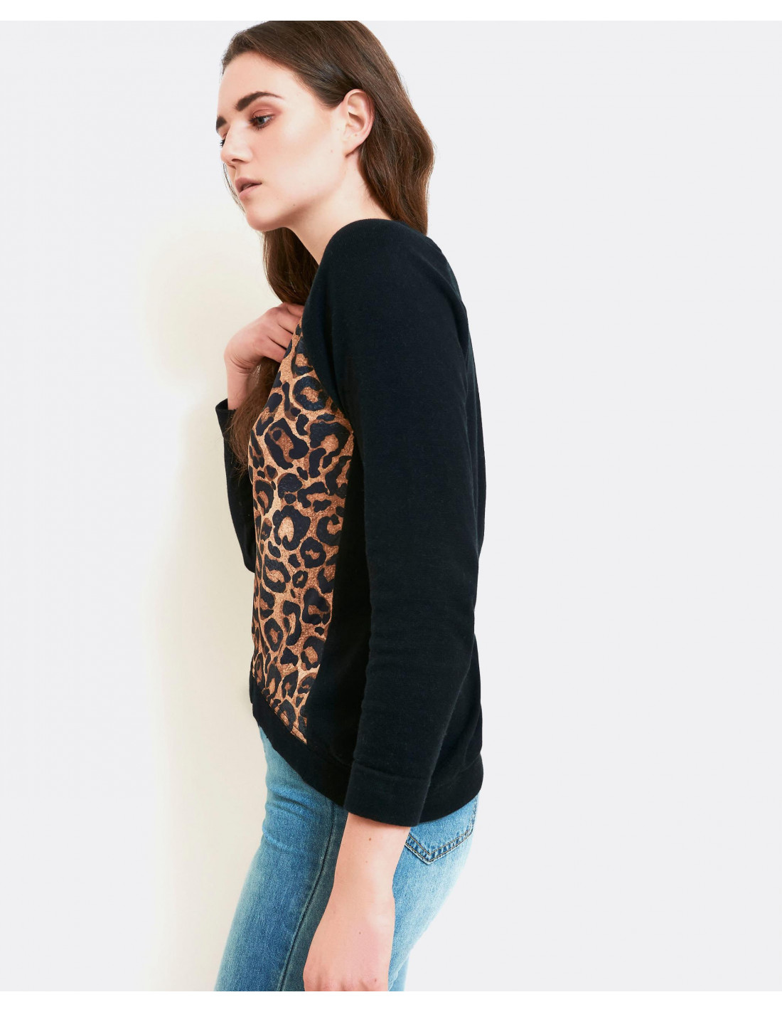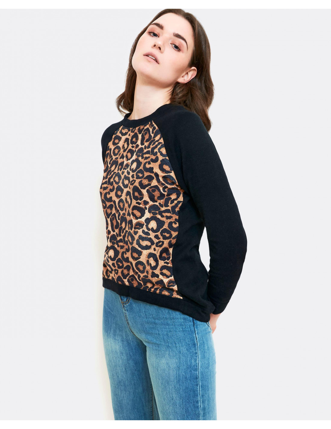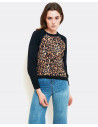 Sudadera combinada en punto negro y tejido en estampado leopardo en el delatero,de cuello redondo y manga larga acabada en puño, el bajo de la prenda acabado en rib. sudadera combiada, talla normal.