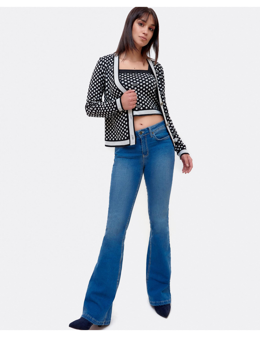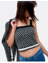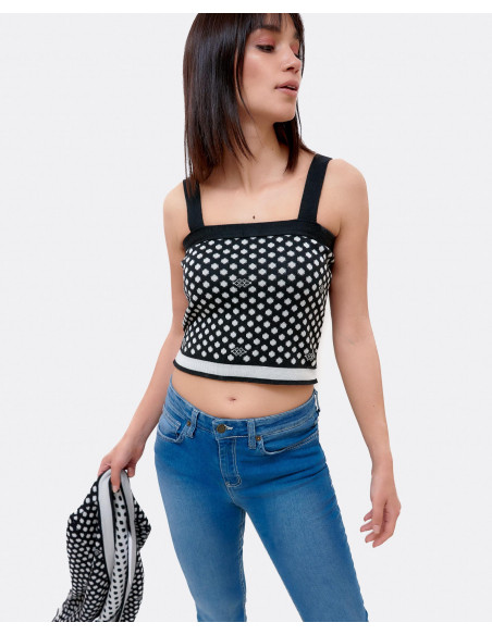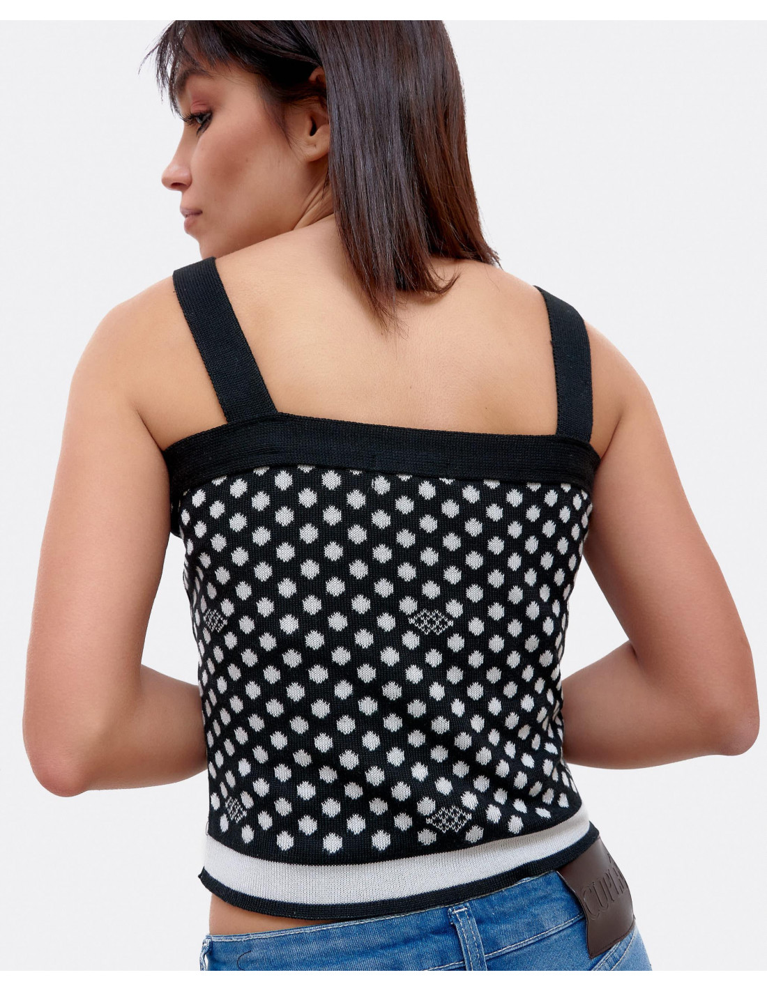 Top de punto con estampado de lunares y logo de Cuplé en color blanco roto y negro. Tirantes ancho ideal para combinar con la chaqueta a conjunto. Te aconsejamos coger tu talla.