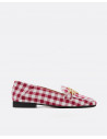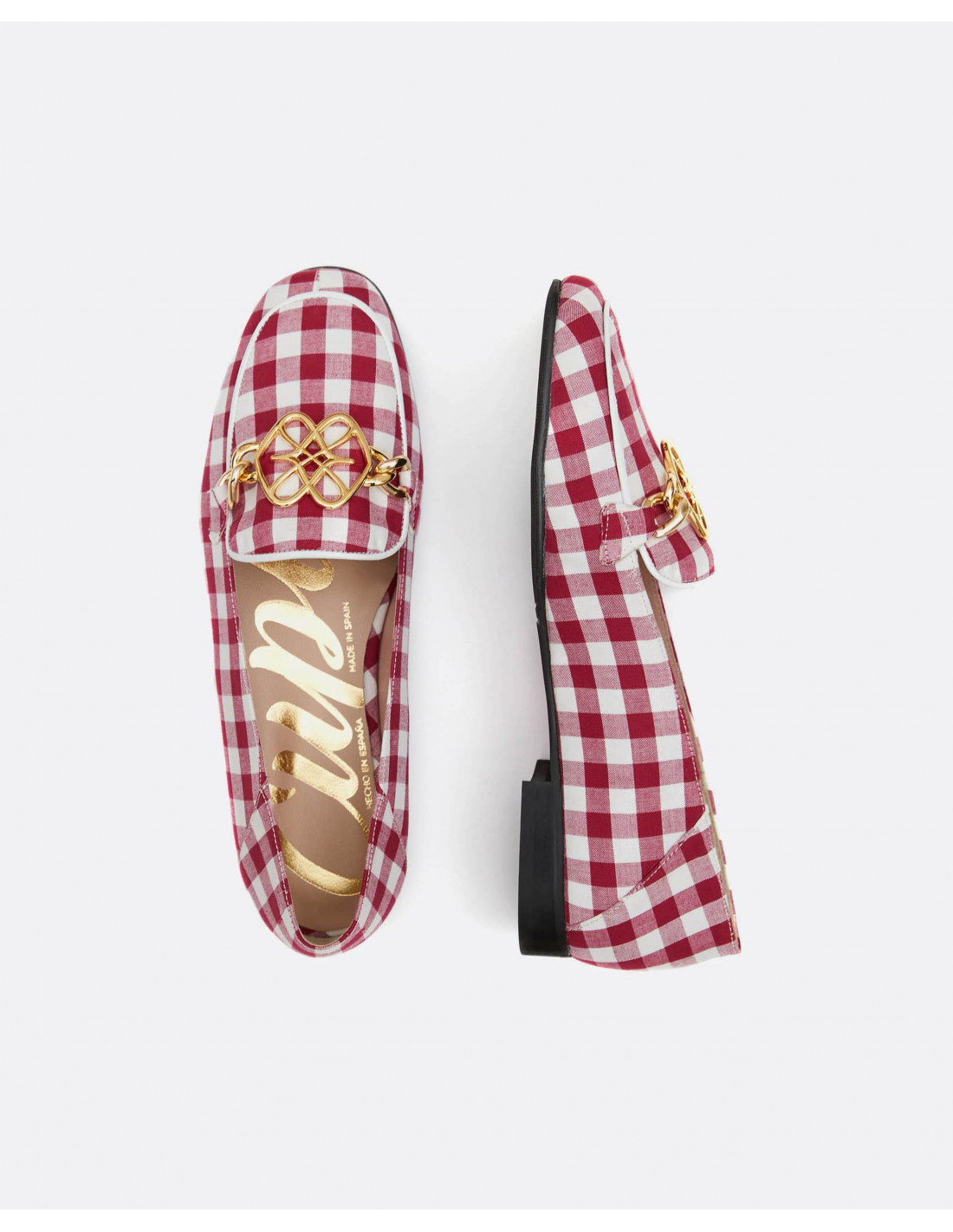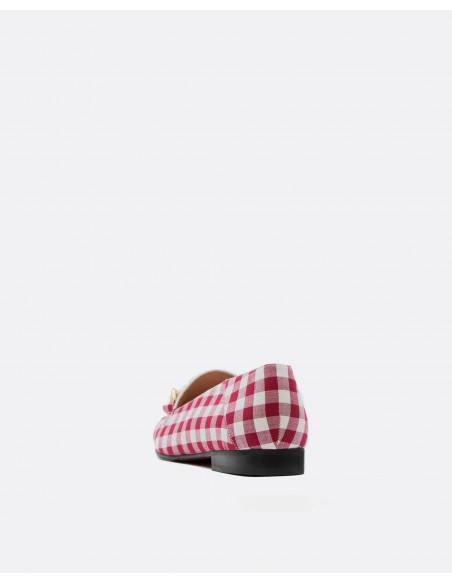 Mocasín de estampado vichy color fucsia y blanco. Cadena central y pieza logotipo Cuplé en el empeine y suela negra.