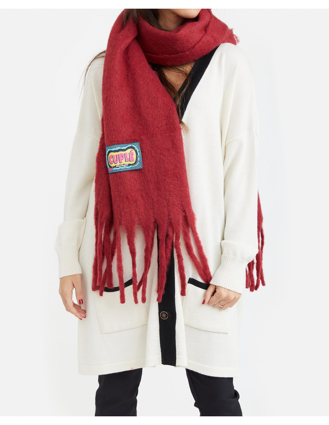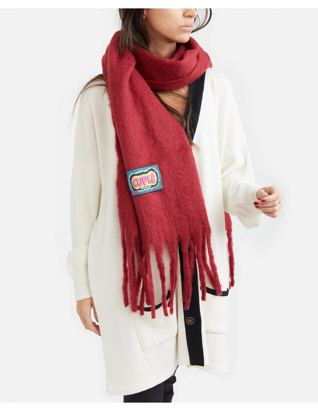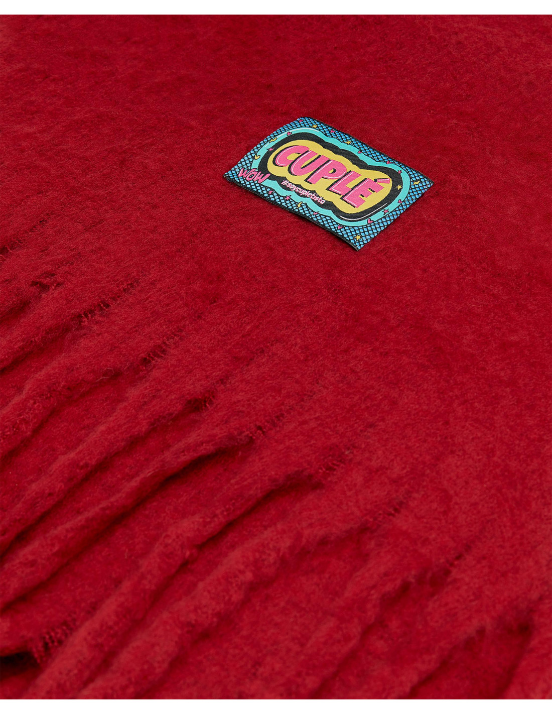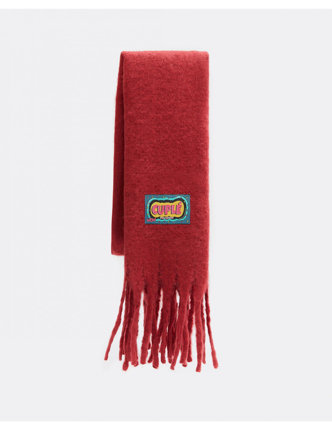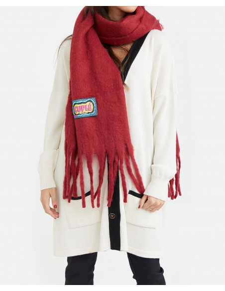 Bufanda lana fría en color rojo con detalle de etiqueta logotipada en la parte inferior.