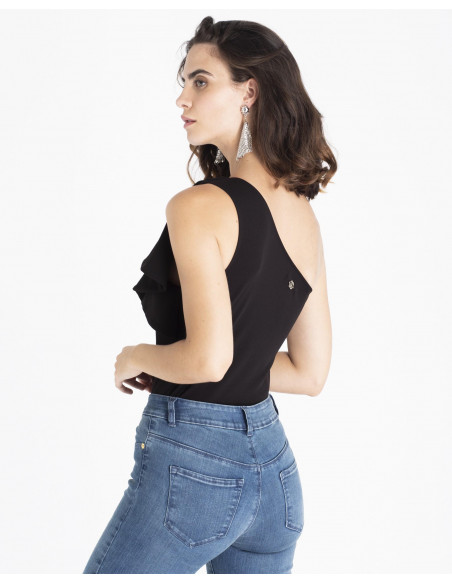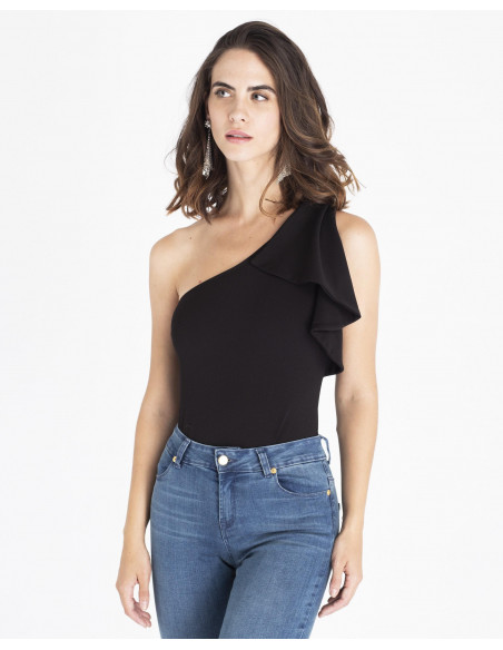 Body CUPLÉ punto roma negro. Tiene un escote asimétrico con una manga y volante cubriendo el hombro. Podrás combinar este body tanto con vaqueros y mules como con un look más elegante de falda de tul y sandalias fantasía.