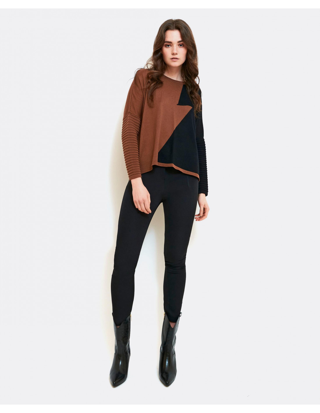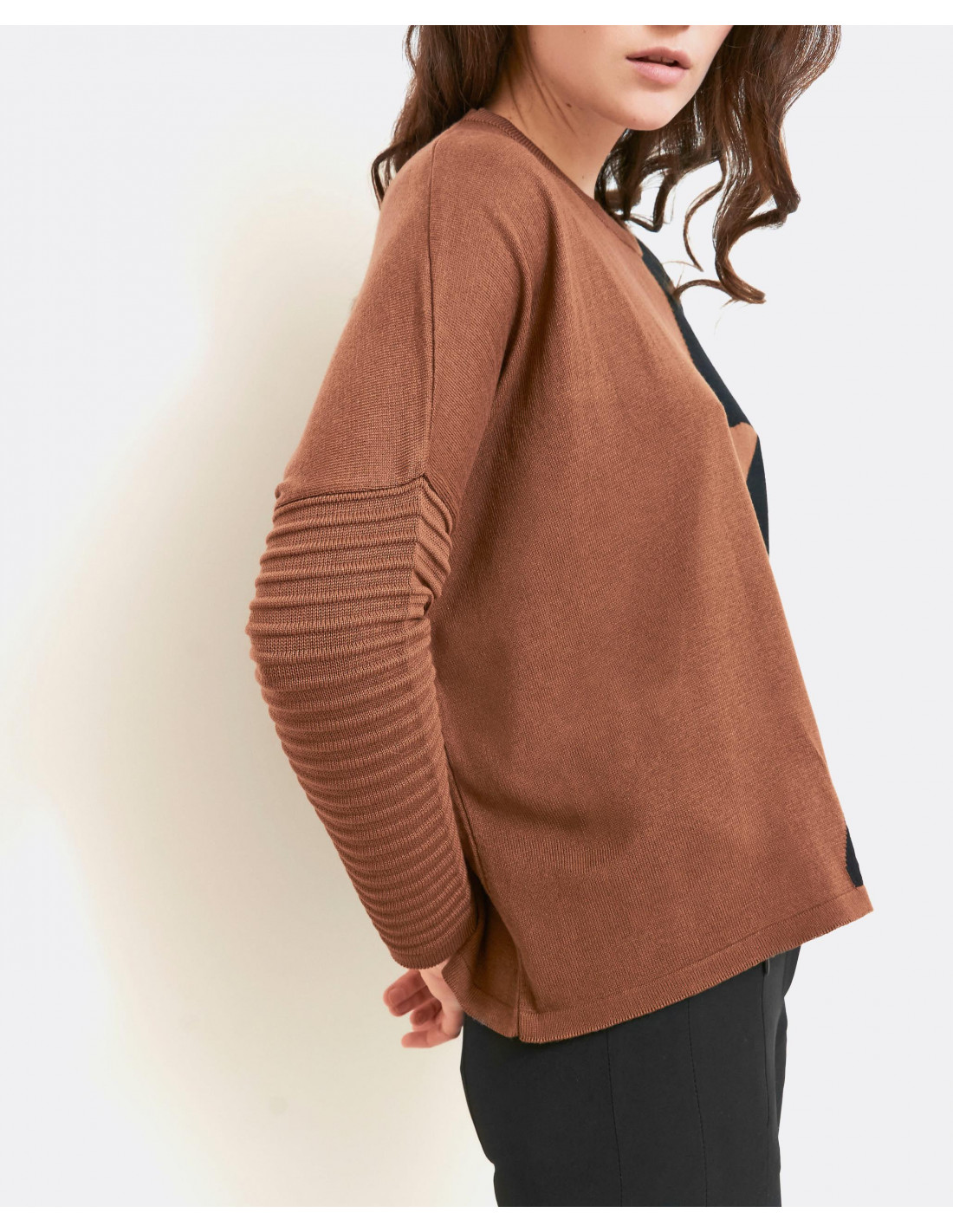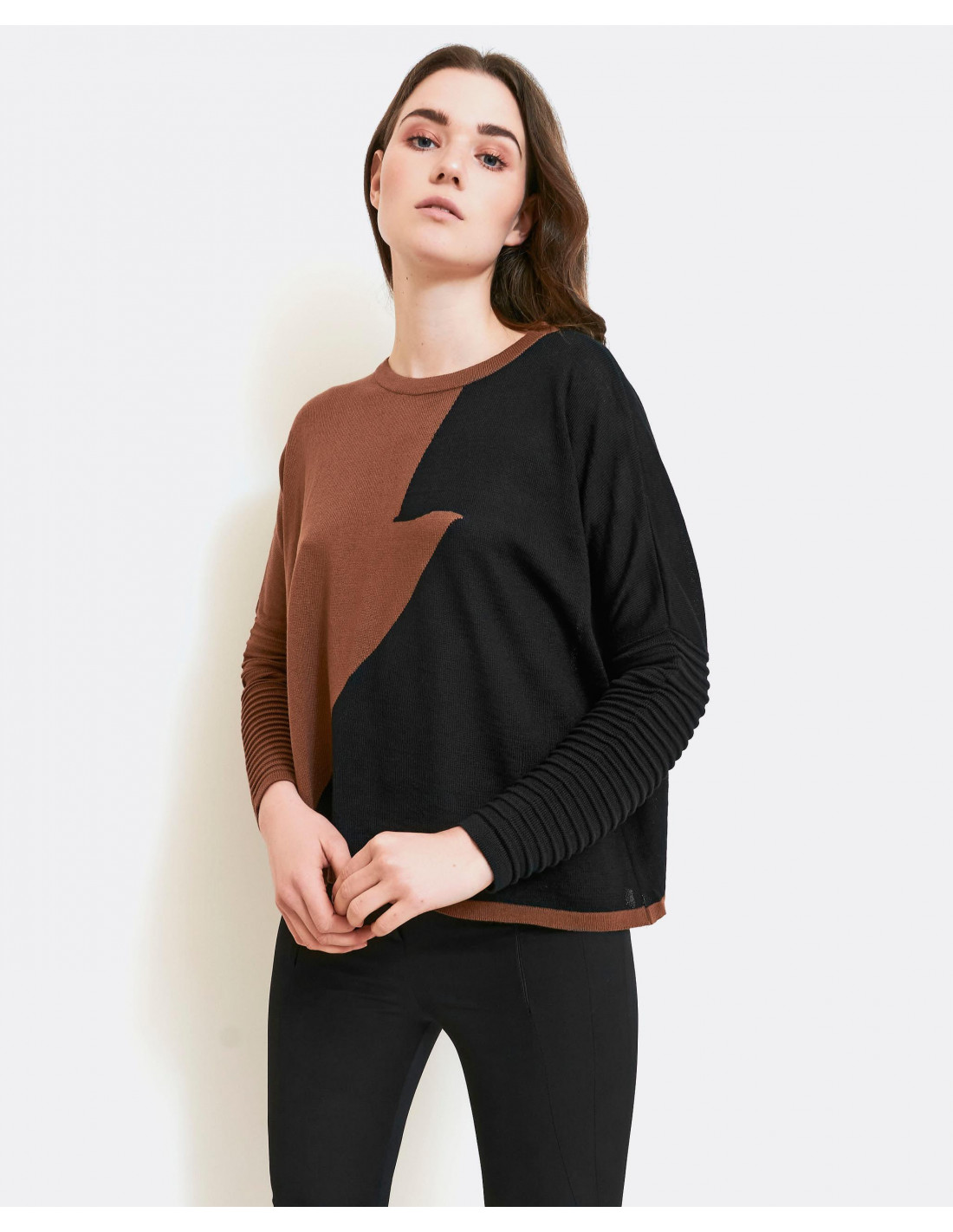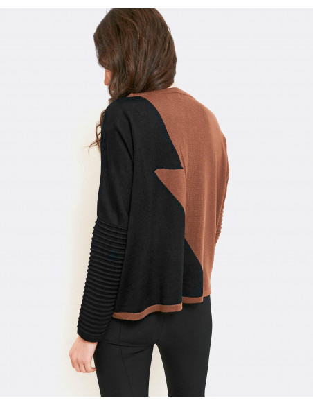 Jersey de punto combinado en negro y marrón. De manga larga con detalles de jaretas en los puños. Cuello redondo. Te aconsejamos coger tu talla.