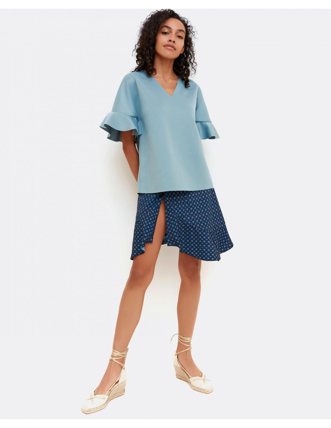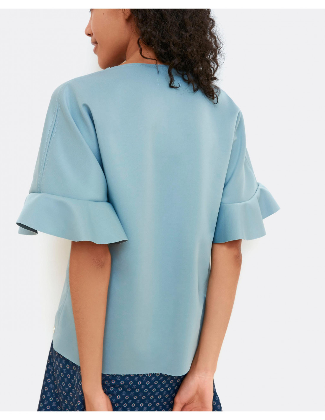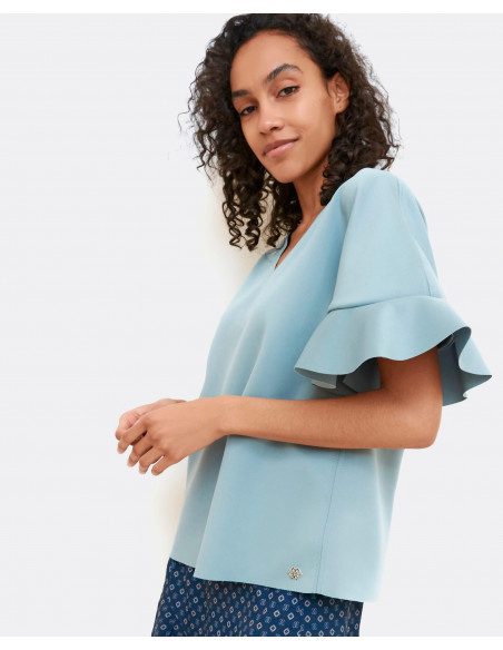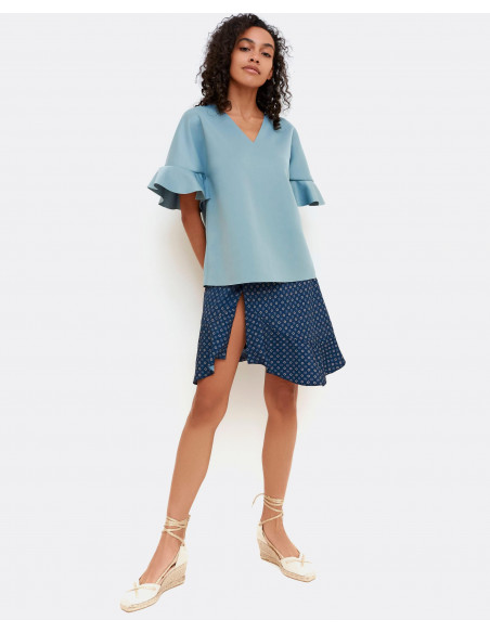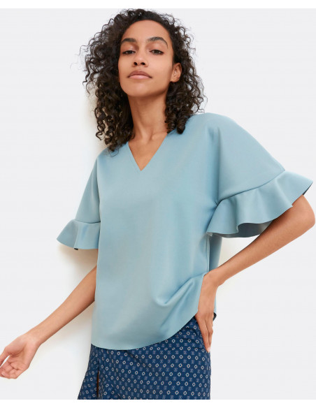 Top de neopreno en gris y mangas con detalle volante. Fluído y con bonito escote en forma de V. La prenda clave que podras combinar con todos tus looks. Te aconsejamos coger tu talla.